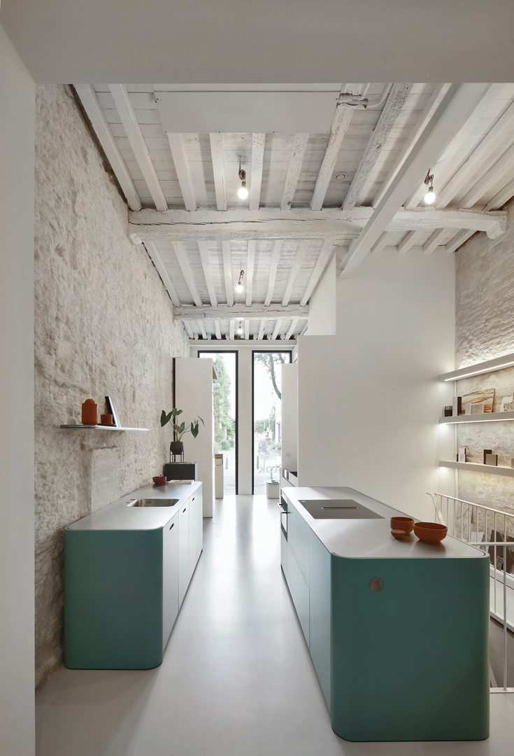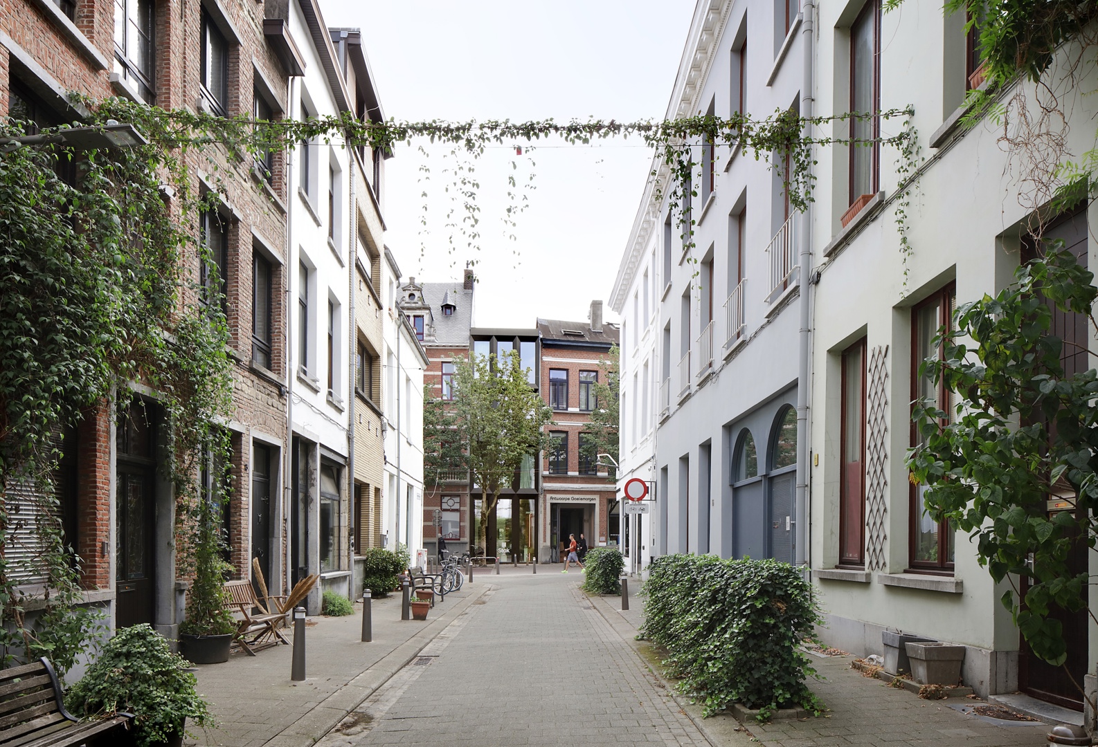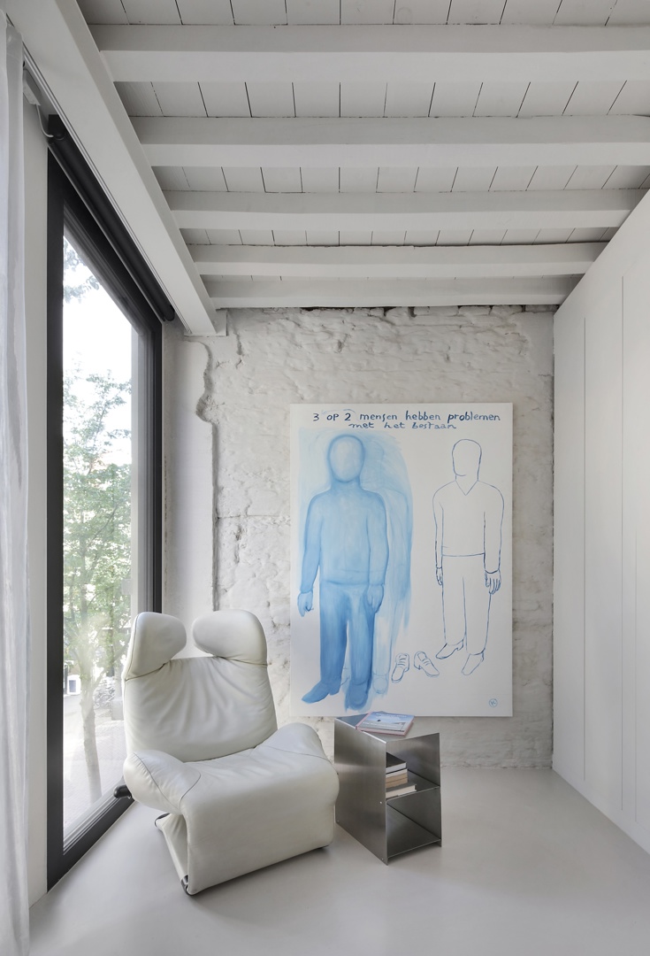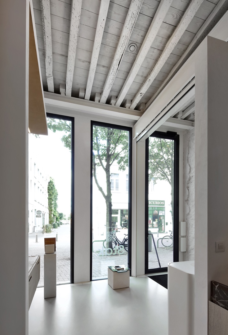 De Kloosterstraat in Antwerpen wordt gekenmerkt door statige rijwoningen met levendige handel op het gelijkvloers. Met de renovatie van Kloosterstraat 11 wordt deze typologie verdergezet, met een hedendaagse vorm die aansluit bij de historische gevelrij. Boven het handelsgelijkvloers bevinden zich drie verdiepingen die samen de handelswoning vormen. De straatgevel bestaat uit een helder systeem van opgestapelde kaders met een subtiele verwijzing naar de raamverhoudingen van de buurpanden. Het gelijkvloers vormt een afwijkend, podiumachtig geheel waarop de bovenliggende volumes rusten. De volledig beglaasde gevel maakt de houten balkenstructuur zichtbaar, deels historisch en deels nieuw toegevoegd. De verdiepingen worden verbonden door een lift, alsook een buitentrap aan de achtergevel.