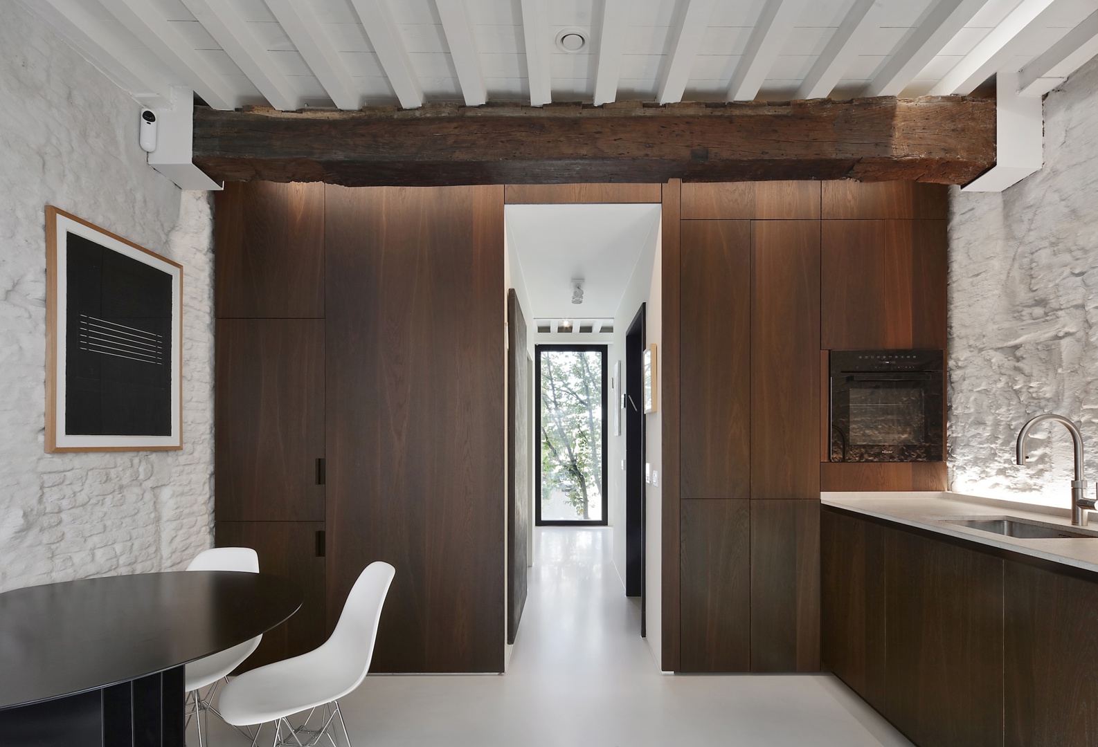 Duurzaamheid wordt in dit project breed benaderd, met aandacht voor zowel materieel als ruimtelijk en energetisch gebruik. Historische draagstructuren worden maximaal hergebruikt en geïntegreerd in een hedendaags geheel, waardoor materiaal en geschiedenis behouden blijven. Bestaande scheidingsmuren en sporen van vroegere ingrepen worden niet weggewerkt, maar net zichtbaar gelaten en versterkt als dragers van het verhaal van het gebouw. De compacte stadswoning benut een beperkte footprint, maar creëert door haar verticale opbouw een ruimtelijke rijkdom. Daarnaast wordt ingezet op hernieuwbare energie via onder meer zonnepanelen en een warmtepomp, wat bijdraagt aan een toekomstgerichte en energiezuinige werking.