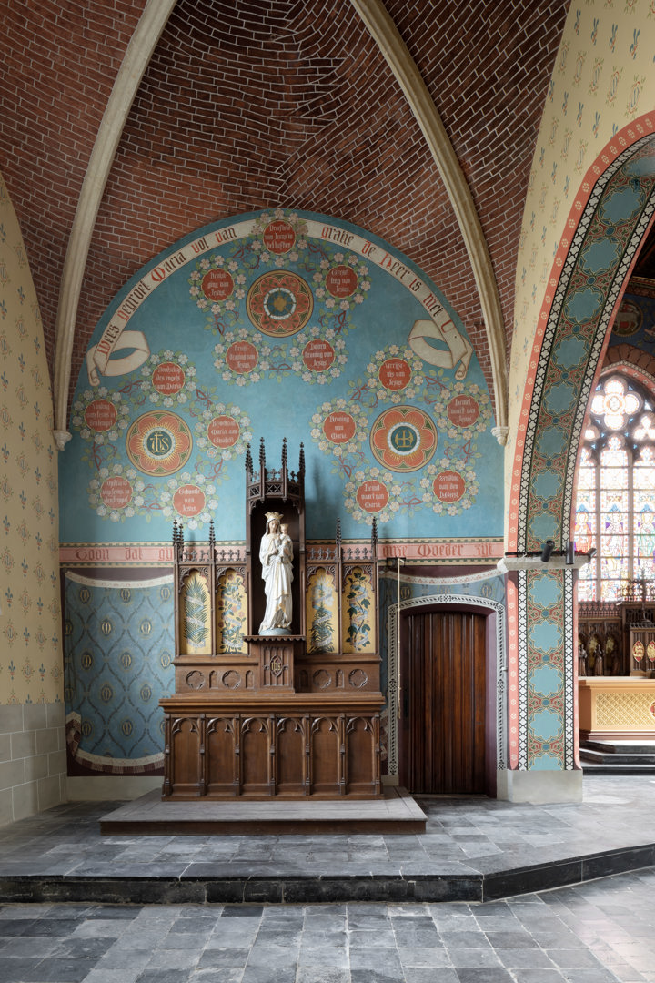 Dit project bewijst dat frisheid en nieuw leven niet voortkomen uit visuele dominantie, maar uit een dialoog met het verleden. Door de neogotische gelaagdheid te omarmen in plaats van te overstemmen, wint het interieur aan betekenis. De blauwe staalstructuur en het warme eikenhout vormen een gebalanceerde tegenpool voor de rijke muurschilderingen. De creatieve maatoplossingen, van de puzzel voor technieken tot het hergebruik van de kerkmeesterbank, tonen aan dat interieurarchitectuur in een historische context stoelt op inventiviteit. Dit project dient als een krachtig voorbeeld voor de herbestemming van parochiekerken: met doortaste, minimale ingrepen heractiveert het de sacrale ruimte als een bezield en toekomstbestendig, publiek ankerpunt in de lokale gemeenschap.
