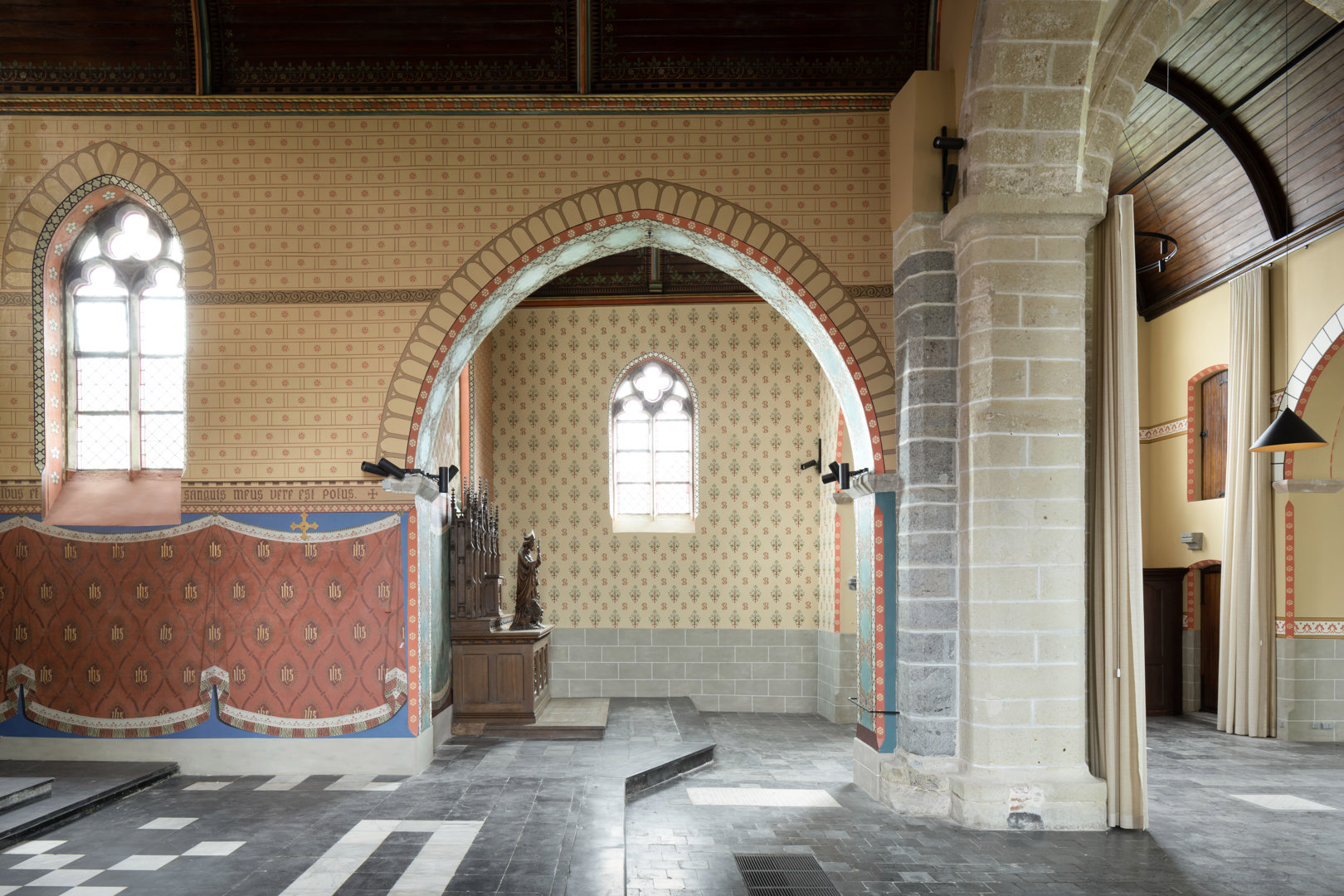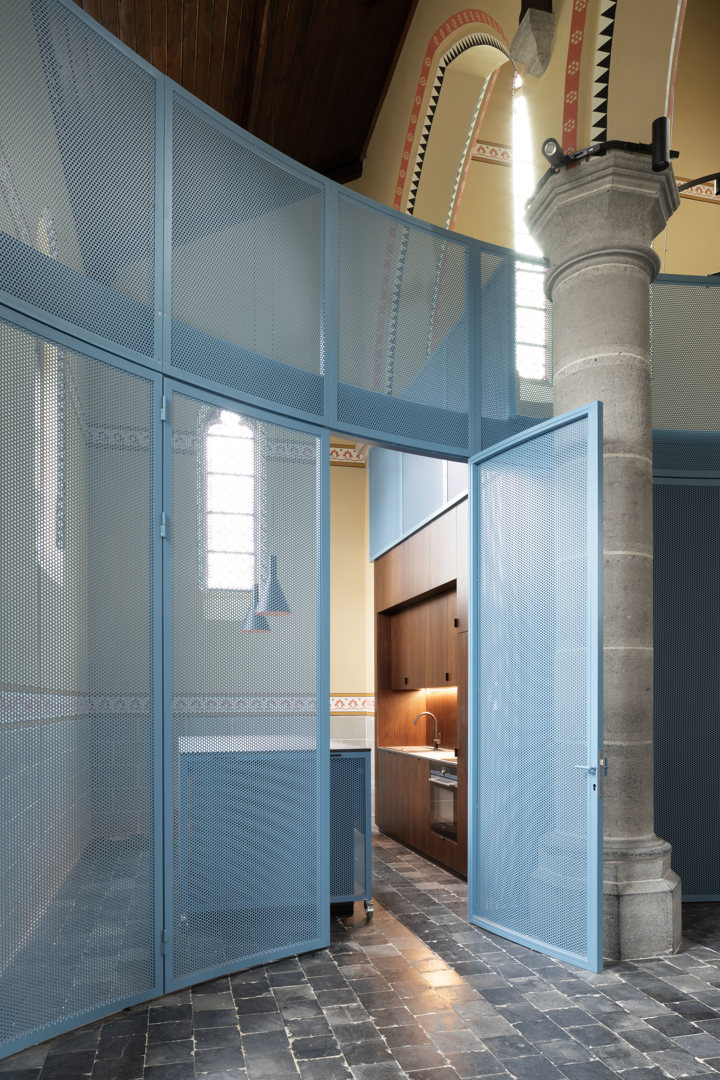 De juiste balans vinden tussen de ruimtelijkheid van het kerkinterieur, de erfgoedwaarde en de noodzakelijke ingrepen om de kerk te herbestemmen, bleek een grote uitdaging. Om het erfgoed maximaal leesbaar te houden werden de moderne technieken maximaal weggewerkt via de zolder en bestaande sleuven (belichting, technische bekabeling, brandbeveiliging). Vloerconvectoren (een grote uitdaging gezien de rijke archeologische ondergrond) voorzien de kerk van warmte. Het nieuwe programma met sanitair, vestiaire, keuken en een trap, gaan schuil achter een golvende, transparante, blauwe staalstructuur. De kleur werd afgestemd op de polychrome muurschilderingen. De structuur inpassen was een huzarenstuk: het volume zweeft tussen het erfgoed, vormt een zacht contrast en is bovenal reversibel.