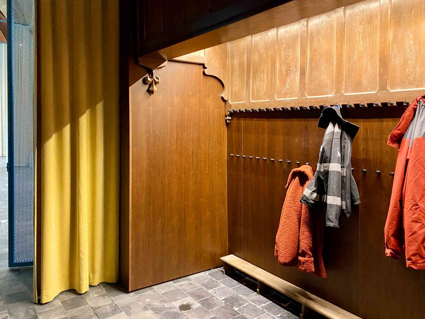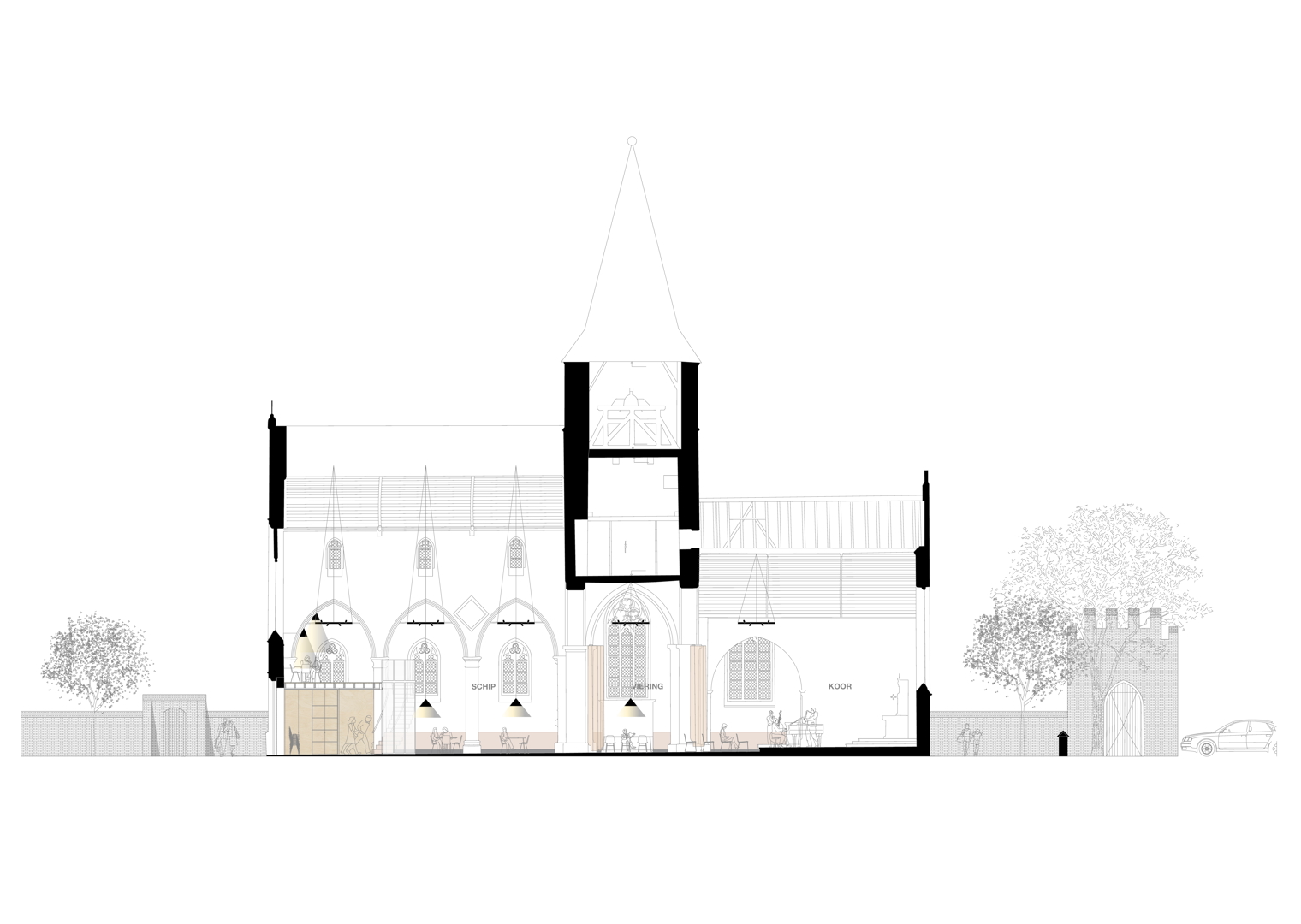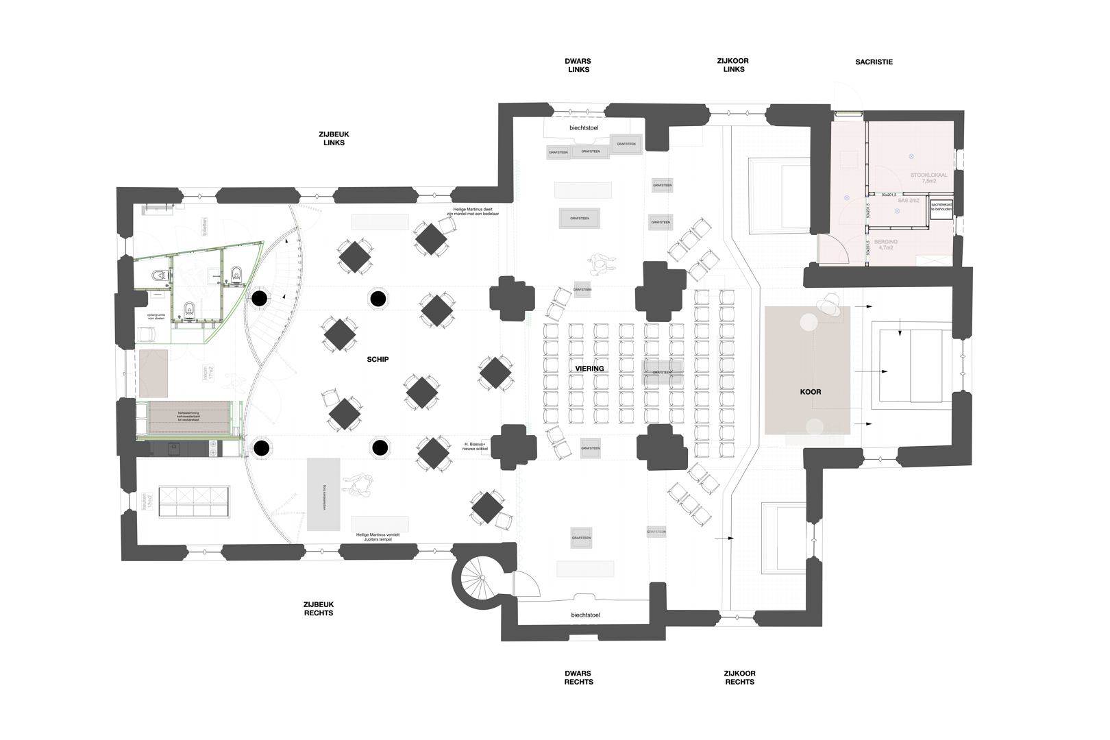 Duurzaamheid uit zich hier primair in de sociale herbestemming. Translucente, brandwerende en akoestische gordijnen en een verplaatsbaar keukenmeubel zorgen voor flexibel ruimtegebruik: van yogales of workshop tot intiem concert. De zachte contrasten en huiselijke sfeer brengen de kerk opnieuw dicht bij de inwoners van Schelderode en heractiveren de ruimte. Inventief hergebruik van religieus meubilair maximaliseert de aanwezige middelen en behoudt het unieke karakter; zo dient de sacristiekast als datakast, de kerkmeesterbank als vestiairebaldakijn en de biechtstoelen als berging. Deze onzichtbare schil van modern comfort (lichtregie, verwarming, hemelwaterrecuperatie, aansluiting riolering, …) bestendigt de kerk als een robuust en toekomstbestendig platform voor de lokale gemeenschap.