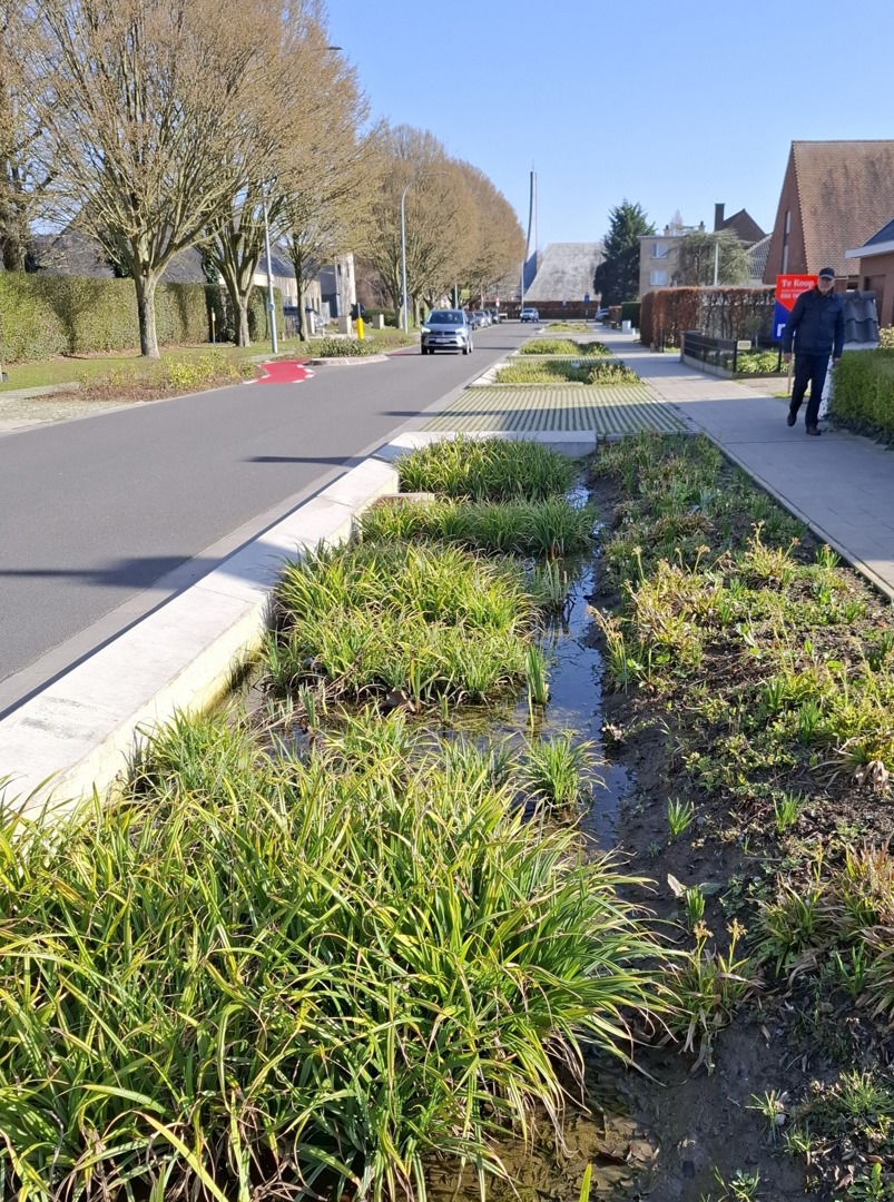 Water was voor de wijk een zorg, een problematiek. Als ontwerpers hebben we het water als opportuniteit gezien. Hoe kunnen we het water terug zichtbaar maken en zien als troef? Dat was voor ons het startpunt van het ontwerp. De infiltratiebakken zijn ontstaan omdat we niet voldoende ruimte hadden om wadi’s te creëren. Een wadi zou teveel ruimte in beslag nemen in het straatbeeld aangezien we rekening dienden te houden met bestaande randvoorwaarden. De infiltratiebak maakt het mogelijk dat we 30 cm kunnen bufferen en de bestaande randvoorwaarden. In de praktijk hebben de bewoners moeten wennen aan het idee dat het water zichtbaar wordt, dat er meer dieren aanwezig zijn in de straten en de planten elk seizoen een andere vorm aannemen. communicatie via de stad Roeselare helpt hierbij;