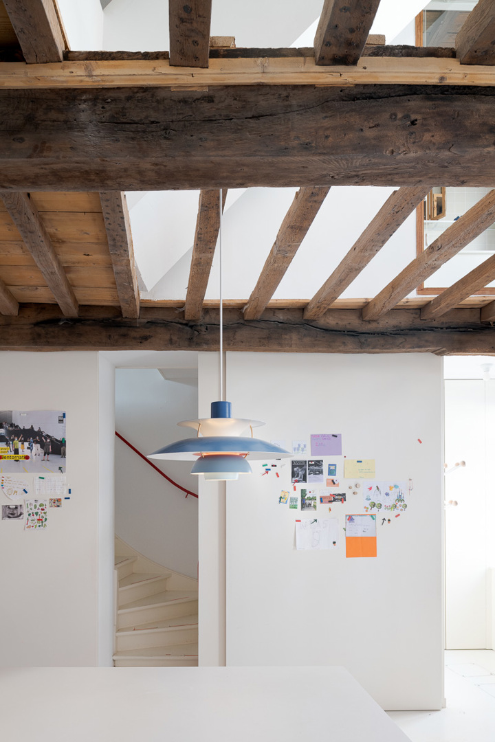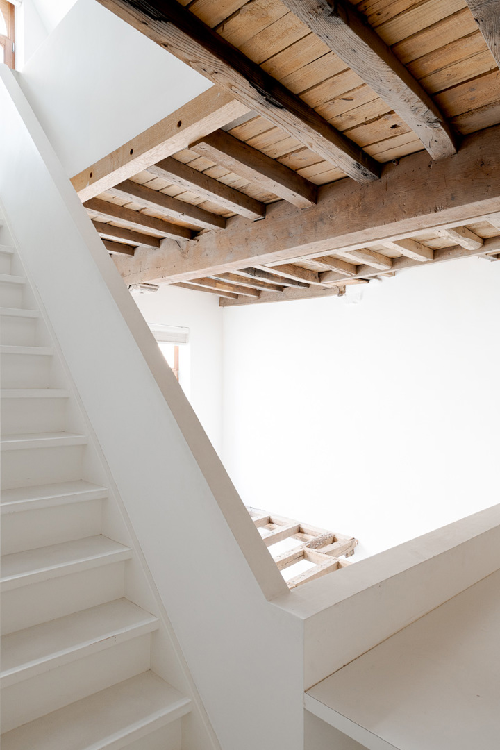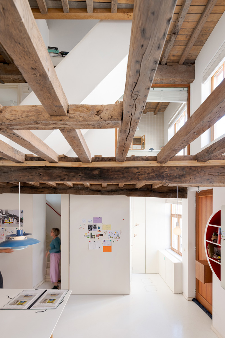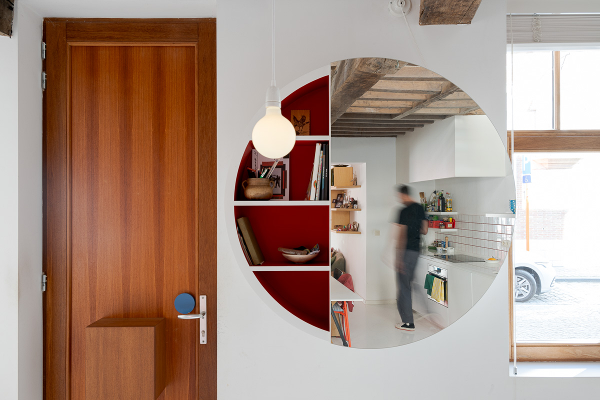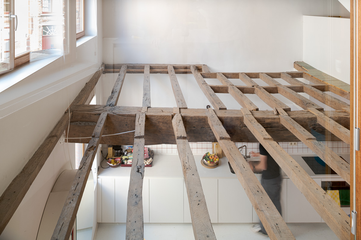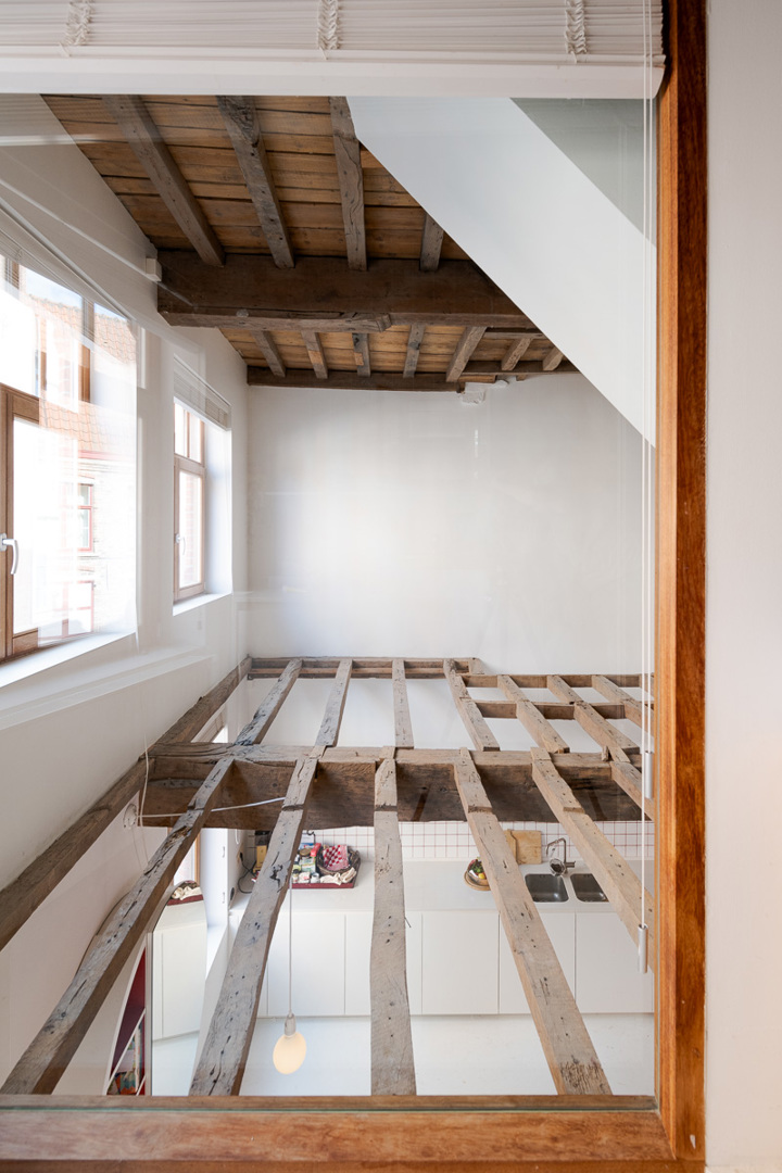 In de schaduw van een oude zorgkliniek staat een kleine rijwoning waar licht moeilijk binnendringt. Enkel de bovenkamers baden in zon; het gelijkvloers bleef donker. Door de vloer van de straatkamer te openen en de 16de-eeuwse moer- en kinderbalken zichtbaar te laten, brengen we licht tot diep in het huis. Een nieuw opgehangen trap verbindt alle niveaus. Zo ontstaan open zichtlijnen en vloeiende overgangen tussen kamer, bureau, keuken en zolder. Grenzen vervagen, ruimtes raken elkaar. Het resultaat is een compact huis met een groots gebaar: licht, doorwaadbaar en in dialoog tussen stad en privé.