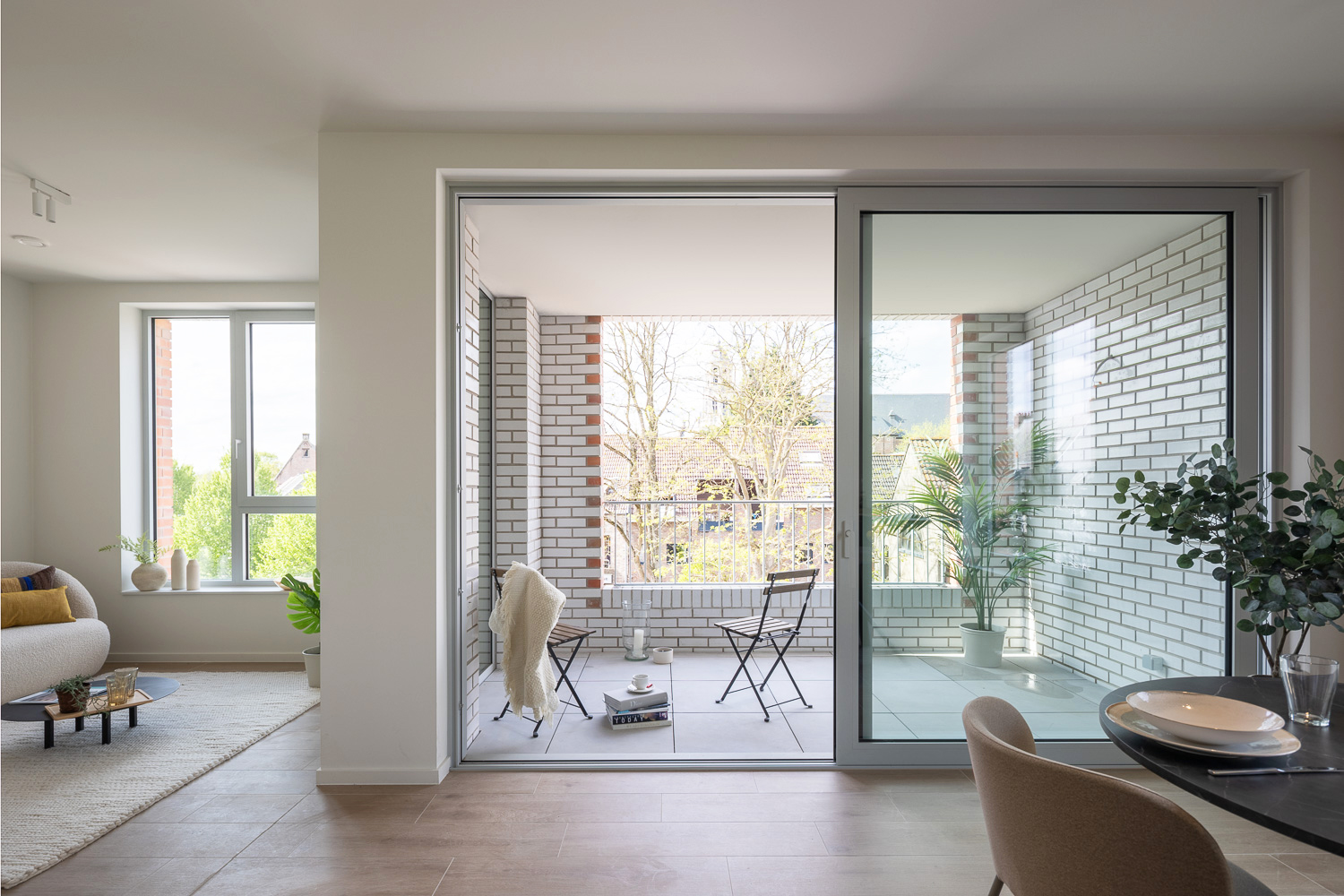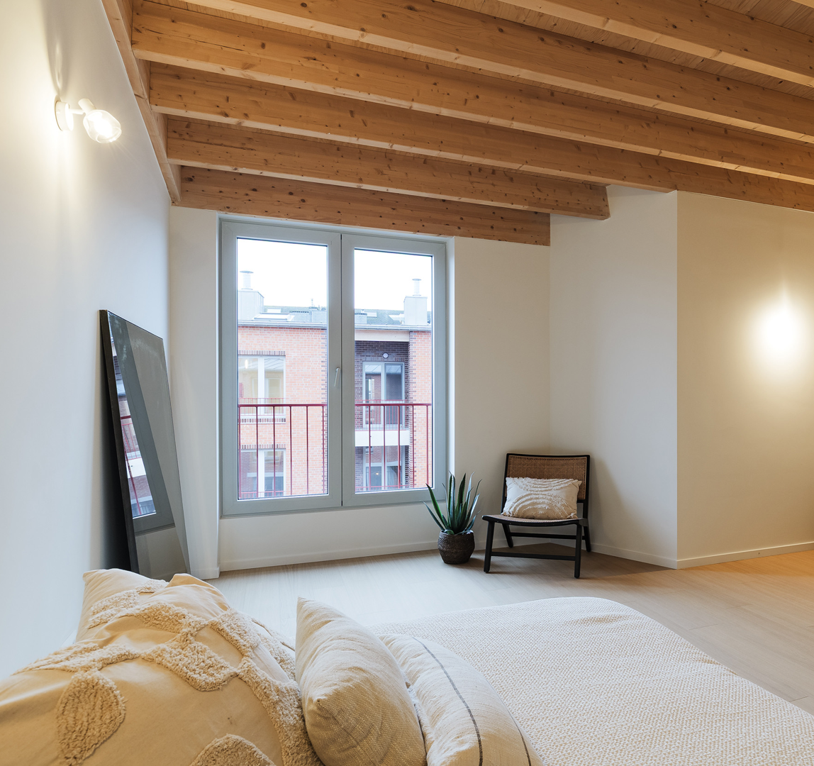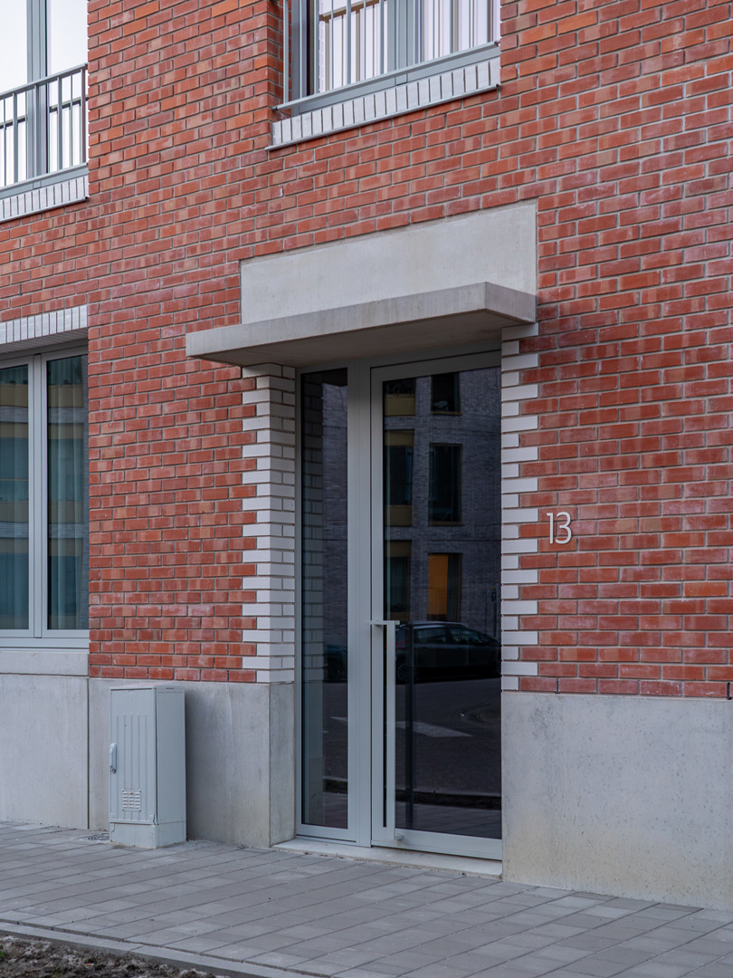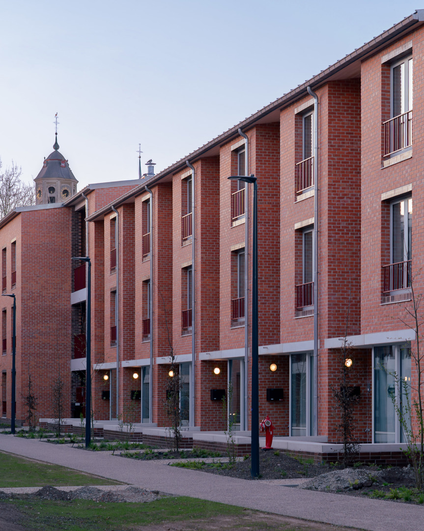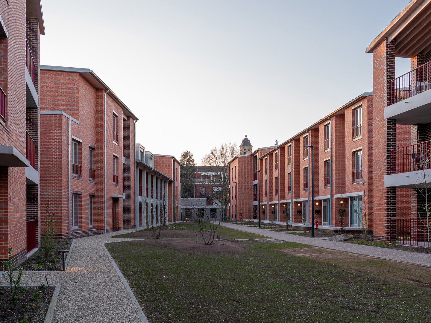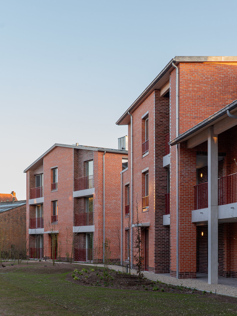 De uitdaging was hoge densiteit inpassen in een fijnmazig weefsel, met behoud van de menselijke schaal. We losten dit op door 70 eenheden te verdelen over zeven volumes passend bij de historische korrel. Een tweede uitdaging was de privacy-gradiënt: straatgebouwen kregen een 'belle-étage'-profiel, tuingebouwen leunen direct aan bij het maaiveld. Cruciaal is de sociale uitdaging: we vermeden een monocultuur door een breed palet aan woontypologieën te integreren. Het aanbod varieert van compacte flats (1-slaapkamer) tot ruime duplexen en grondgebonden stadswoningen met eigen tuin. Deze architecturale variatie garandeert een levendige, intergenerationele mix (starters, gezinnen, senioren) die, ondersteund door een rustig materialenpalet, zo een echte stadswijk vormt.