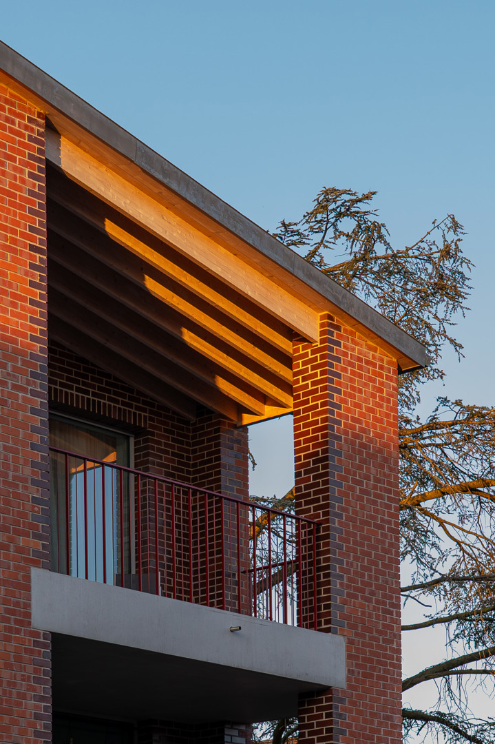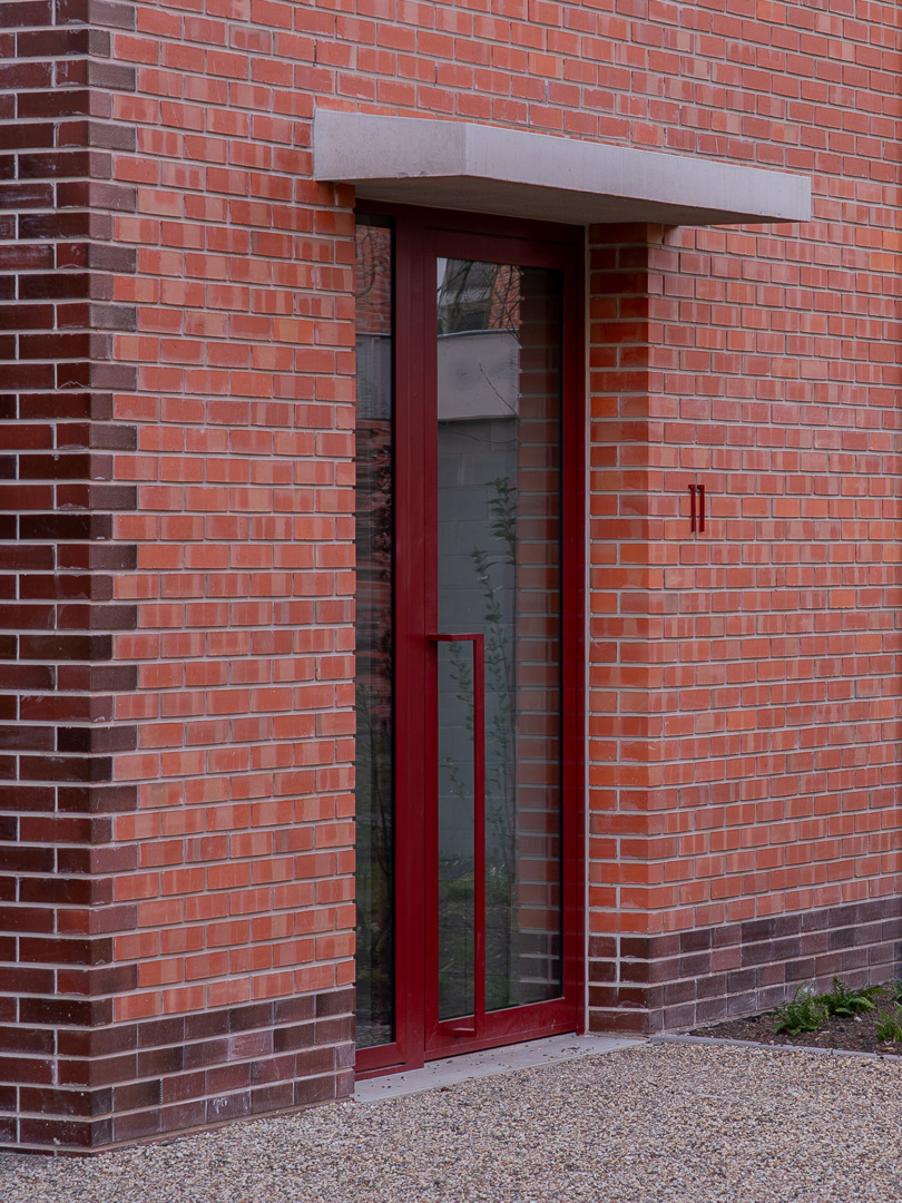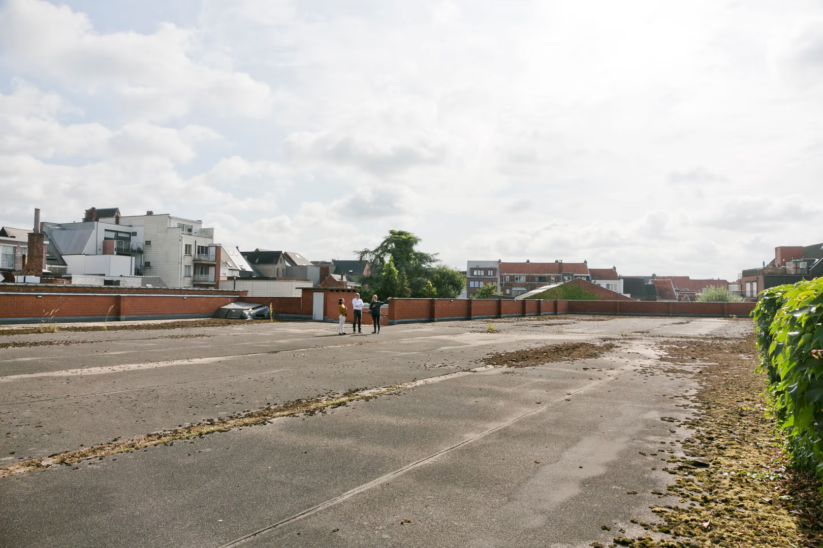 De ontwerpopdracht voor Hof Berlamuze behelst de radicale transformatie van een doods, nagenoeg volledig verhard binnengebied naar een levendige, autovrije stadswijk met 70 eenheden. Het masterplan verenigt stedelijke verdichting met een publiek doorwaadbare stadstuin. Het ontwerp hanteert een doordachte dubbele strategie: drie 'straatgebouwen' herstellen de historische straatwand met een formele, verticale geleding in rood-oranje baksteen en licht architectonisch beton. Binnenin vormen vier 'tuingebouwen' een informeler, landschappelijk decor met hellende daken en royale dakoversteken. De kernopdracht was niet louter woningen toevoegen, maar de stad 'ontpitten' en een inclusieve gemeenschap smeden rondom een nieuw, groen hart dat de hele buurt laat ademen.