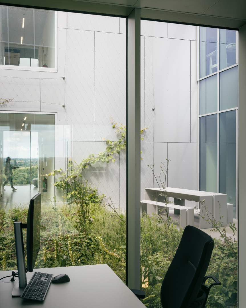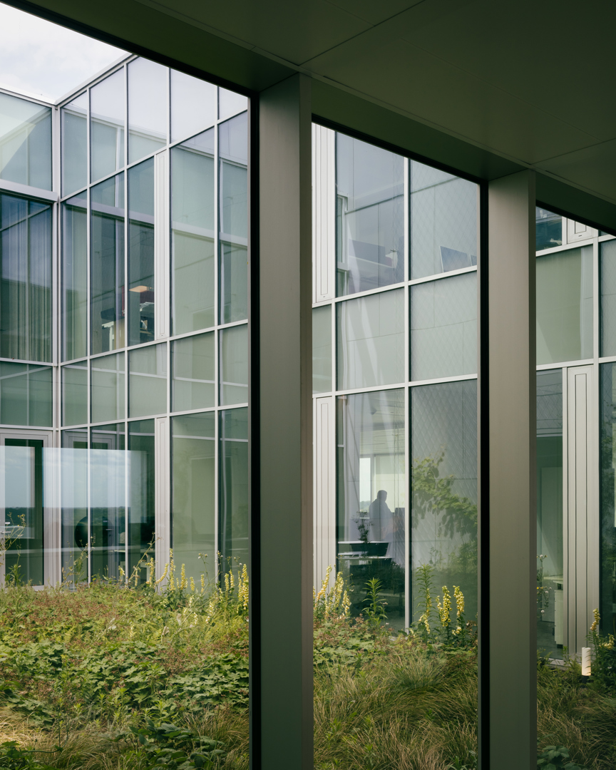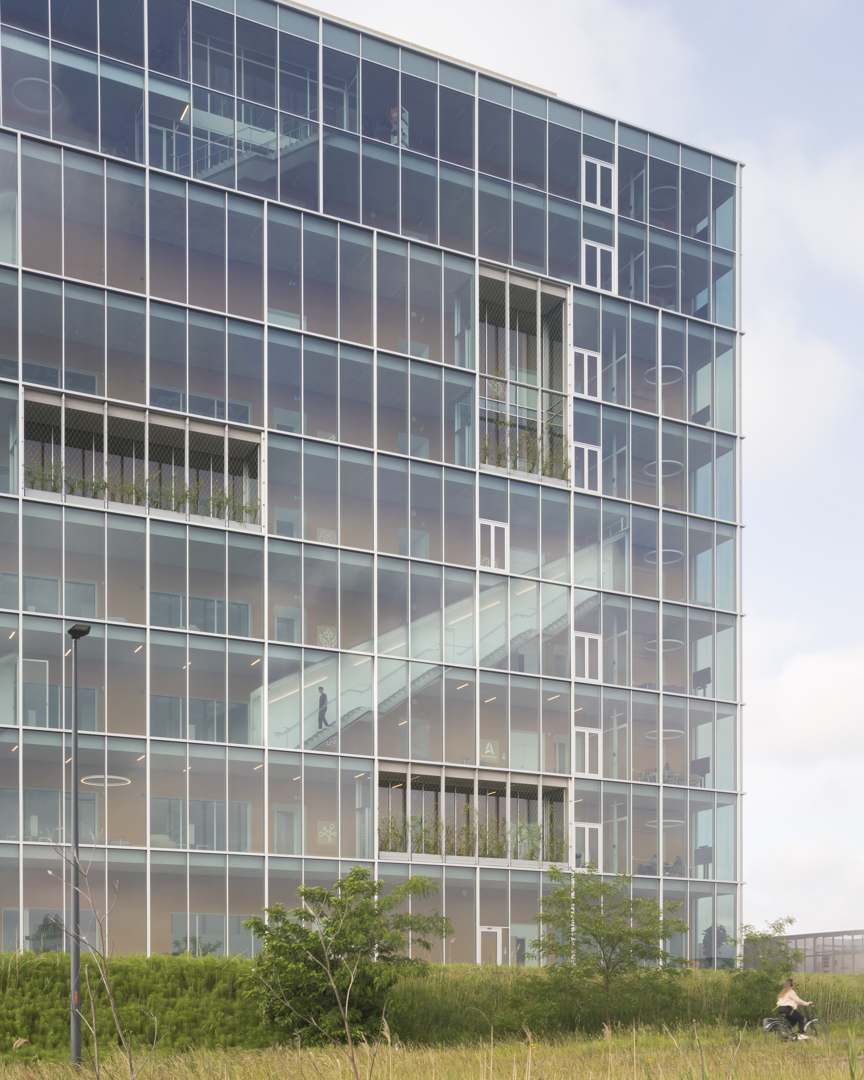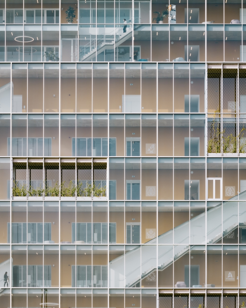 Omdat het project strikte functionaliteit omzet in architectuur met meerwaarde. Incubator en hoofdkantoor worden niet enkel gestapeld, maar geestelijk en ruimtelijk gekoppeld door de interactieve schil: een systeem van circulatie, trappen, proeftuinen, vergaderplekken en collectieve functies dat ontmoeting en kennisdeling activeert. Het gebouw is een heldere landmark langs de E40—billboard en scherm—maar fungeert tegelijk als buffer die rust biedt aan de concentratiezones. De gevel- en volumewerking maken de programmatische tweeledigheid leesbaar en geven de campus een sterke identiteit. Het resultaat is een compacte, robuuste, flexibele en toekomstgerichte typologie voor biotech, waar performantie en cross-collaboration samenvallen.