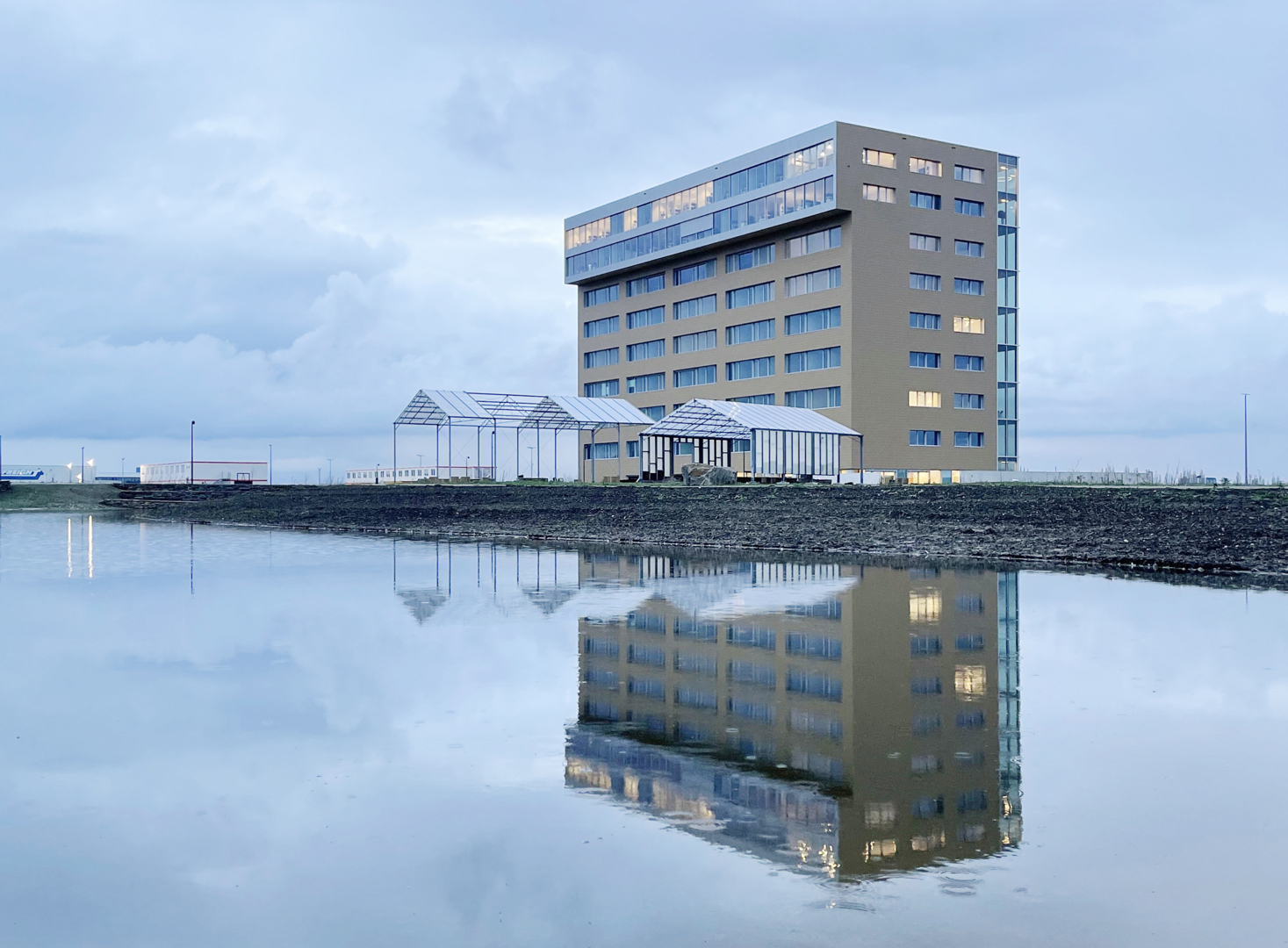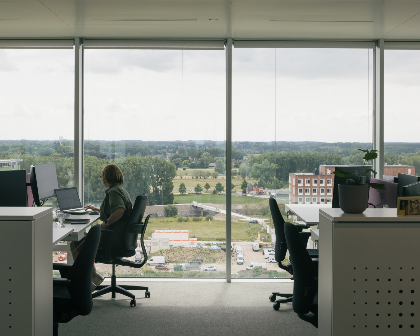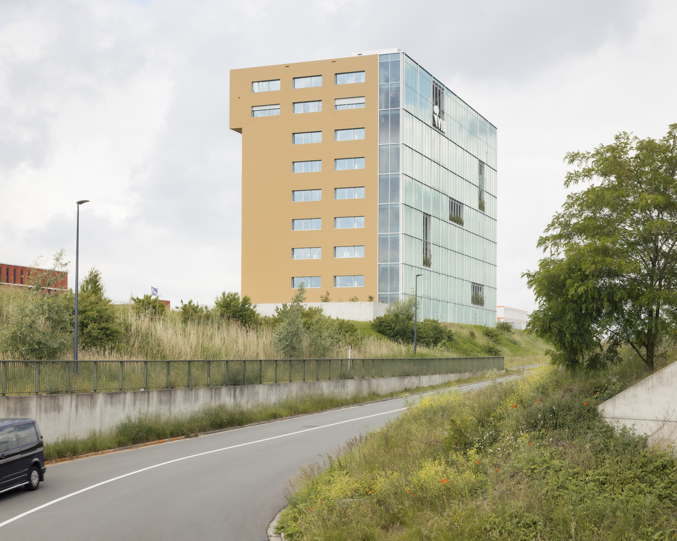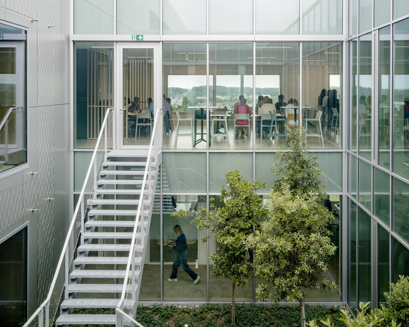 Omdat het project strikte functionaliteit omzet in architectuur met meerwaarde. Incubator en hoofdkantoor worden niet enkel gestapeld, maar geestelijk en ruimtelijk gekoppeld door de interactieve schil: een systeem van circulatie, trappen, proeftuinen, vergaderplekken en collectieve functies dat ontmoeting en kennisdeling activeert. Het gebouw is een heldere landmark langs de E40—billboard en scherm—maar fungeert tegelijk als buffer die rust biedt aan de concentratiezones. De gevel- en volumewerking maken de programmatische tweeledigheid leesbaar en geven de campus een sterke identiteit. Het resultaat is een compacte, robuuste, flexibele en toekomstgerichte typologie voor biotech, waar performantie en cross-collaboration samenvallen.