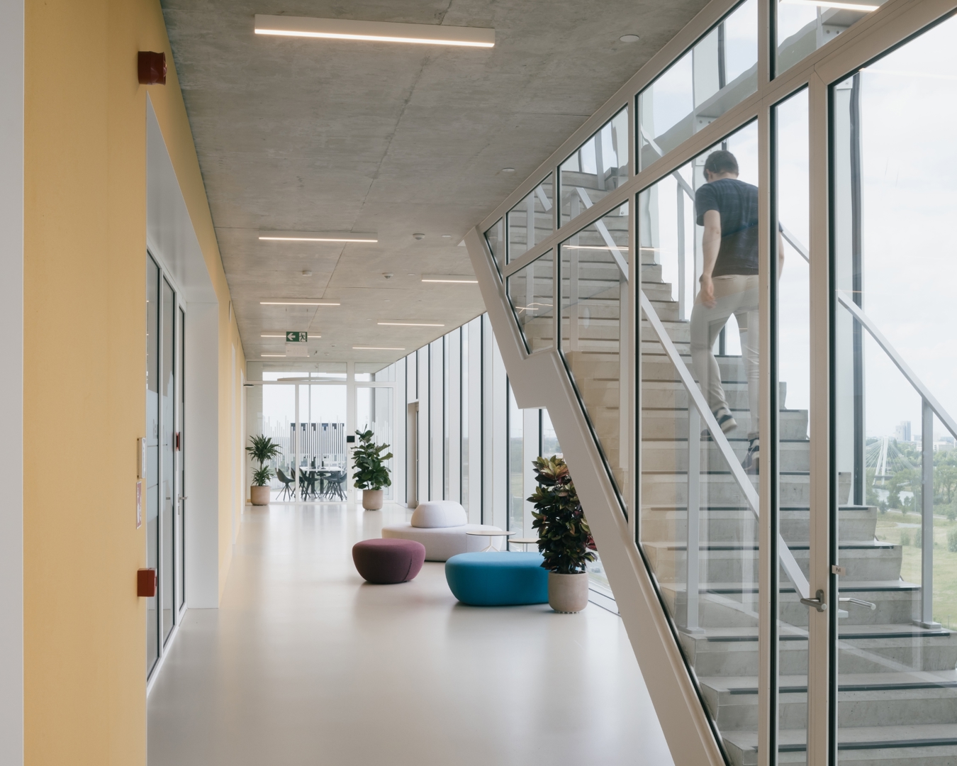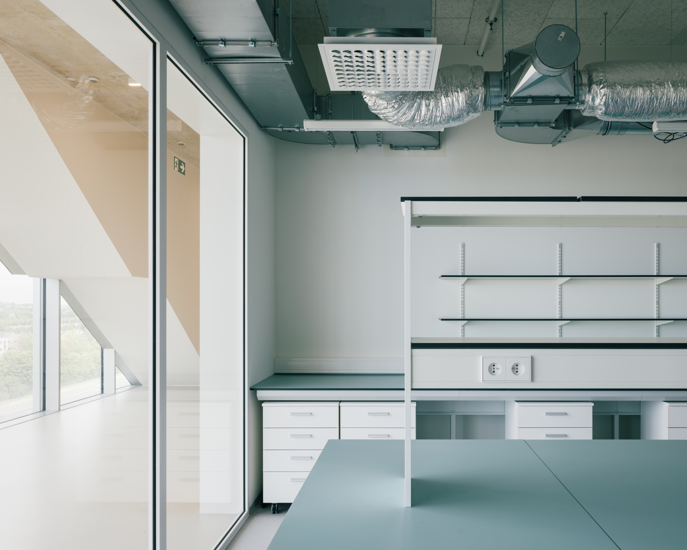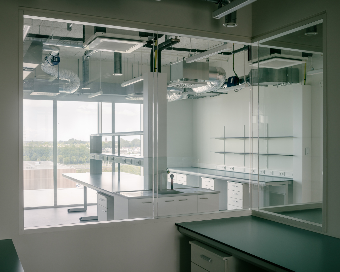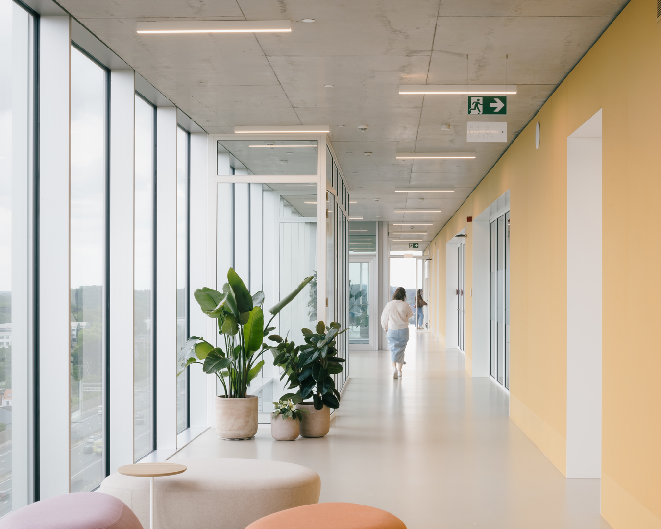 De uitdaging was het verzoenen van een zwaar technisch repetitief programma met identiteit, leesbaarheid en complexe omgeving langs de E40. Het antwoord is een “machine” met een logische programmastapeling en modules die eenvoudig kunnen schakelen en loskoppelen. Planopbouw volgt de daglichtgradiënt: kantoren aan de gevel, labo’s in tweede lijn, support centraal. Langs de autosnelweg organiseert een glazen interactieve schil de verticale circulatie en gedeelde functies. Zo wordt gang meer dan circulatie: ze verbindt verdiepingen en gebruikers, faciliteert informele ontmoeting en stimuleert cross-collaboration. De hyperefficiënte organisatie van de incubatoren stelde in staat deze ongevraagde, maar nu al onmisbare, surplus te bieden. Ze vormt eveneens een billboard voor startup bedrijven.