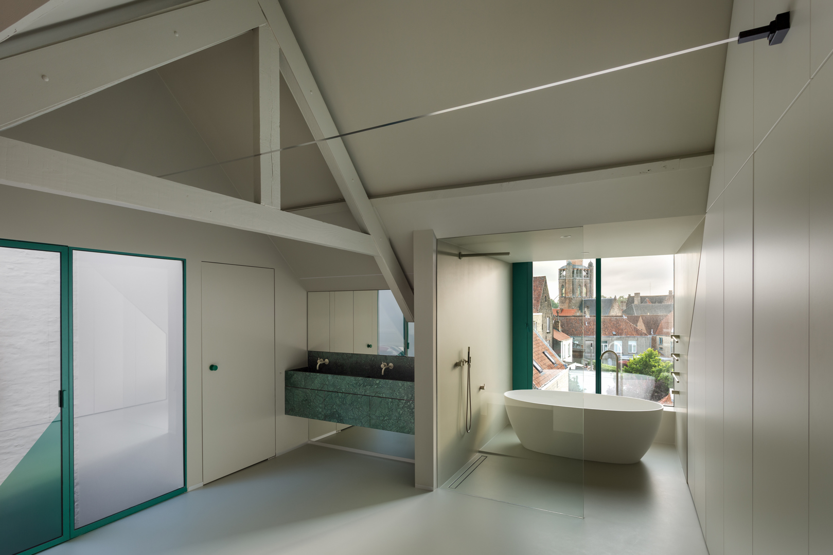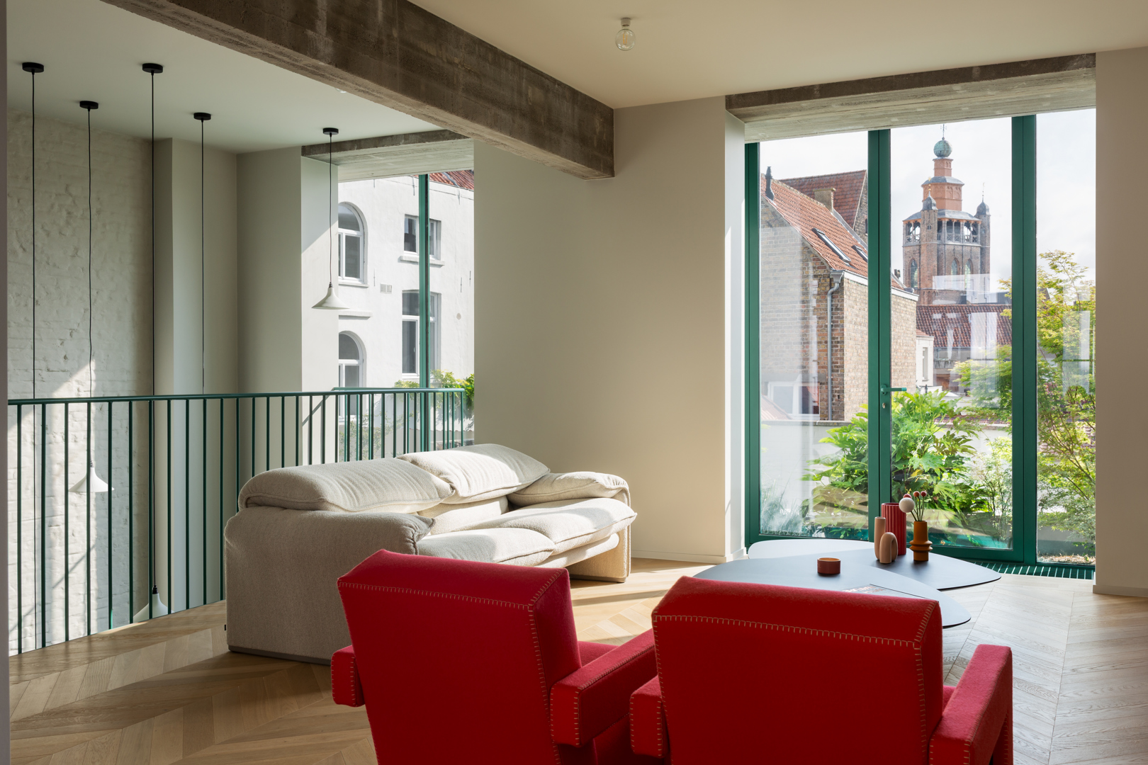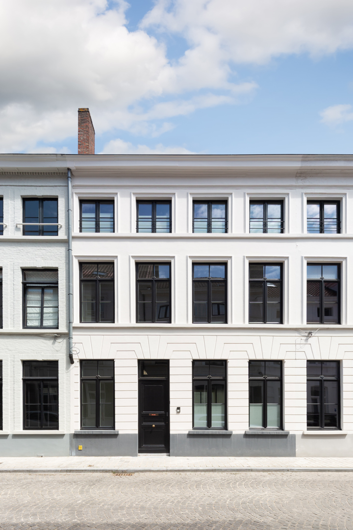 Initieel wilde de bouwheer een viertal vakantiewoningen realiseren, maar dit strookte niet met de strenge voorschriften in het Unesco-beschermde Brugge. Daarom werd gekozen voor één ruime, luchtige stadswoning, geschikt voor levenslang wonen, met lift over de vier bouwlagen. Door de beperkte footprint werden de onderste verdiepingen opengewerkt en deels uitgehold, waardoor een sterke verticale interactie ontstond. De diagonale aanbouw optimaliseert keuken, terras en binnentuin en laat maximaal licht binnen. Authentieke en nieuwe elementen worden verbonden via zichtbare betonstructuren en groene accenten.