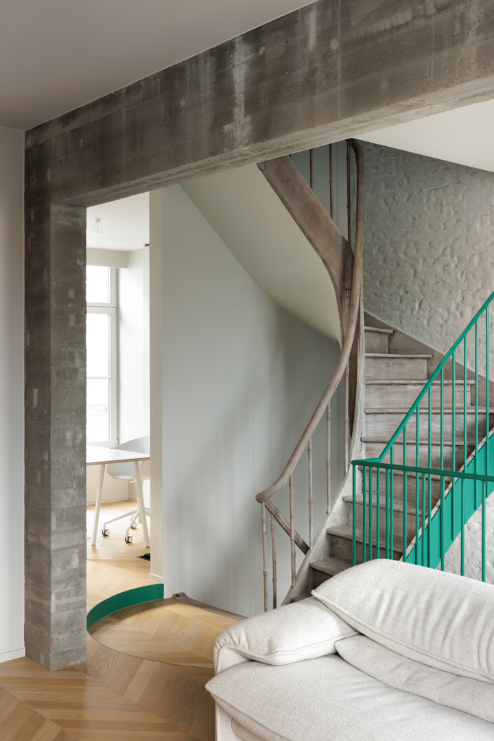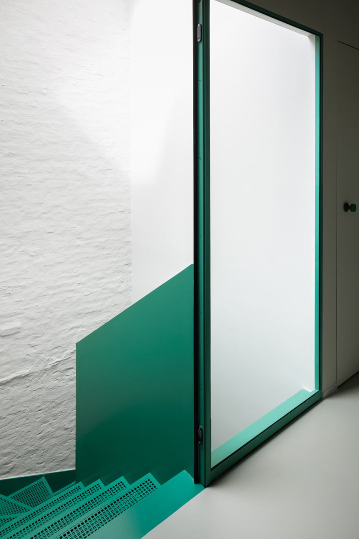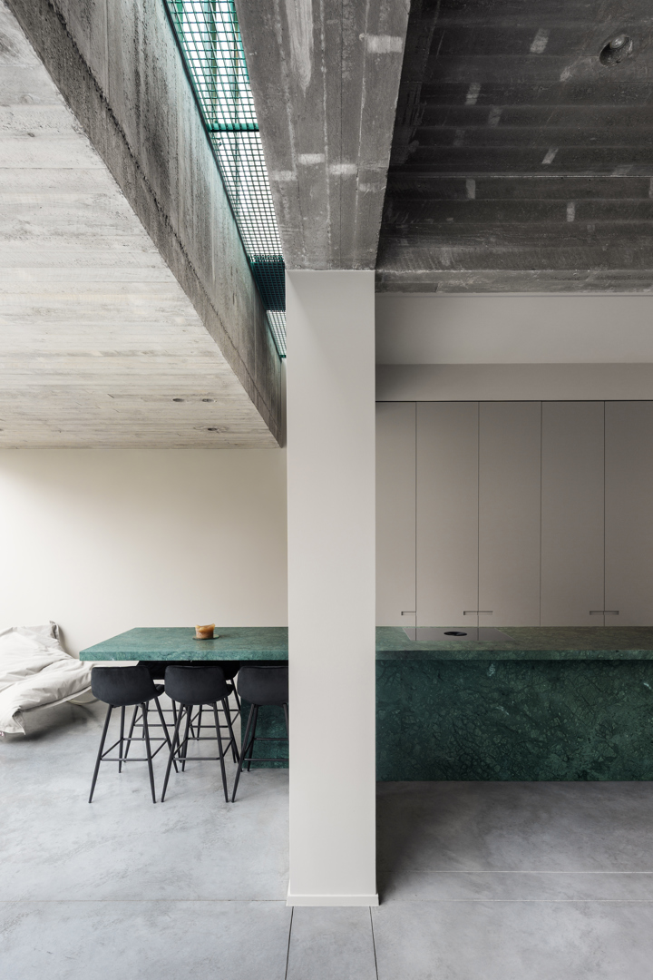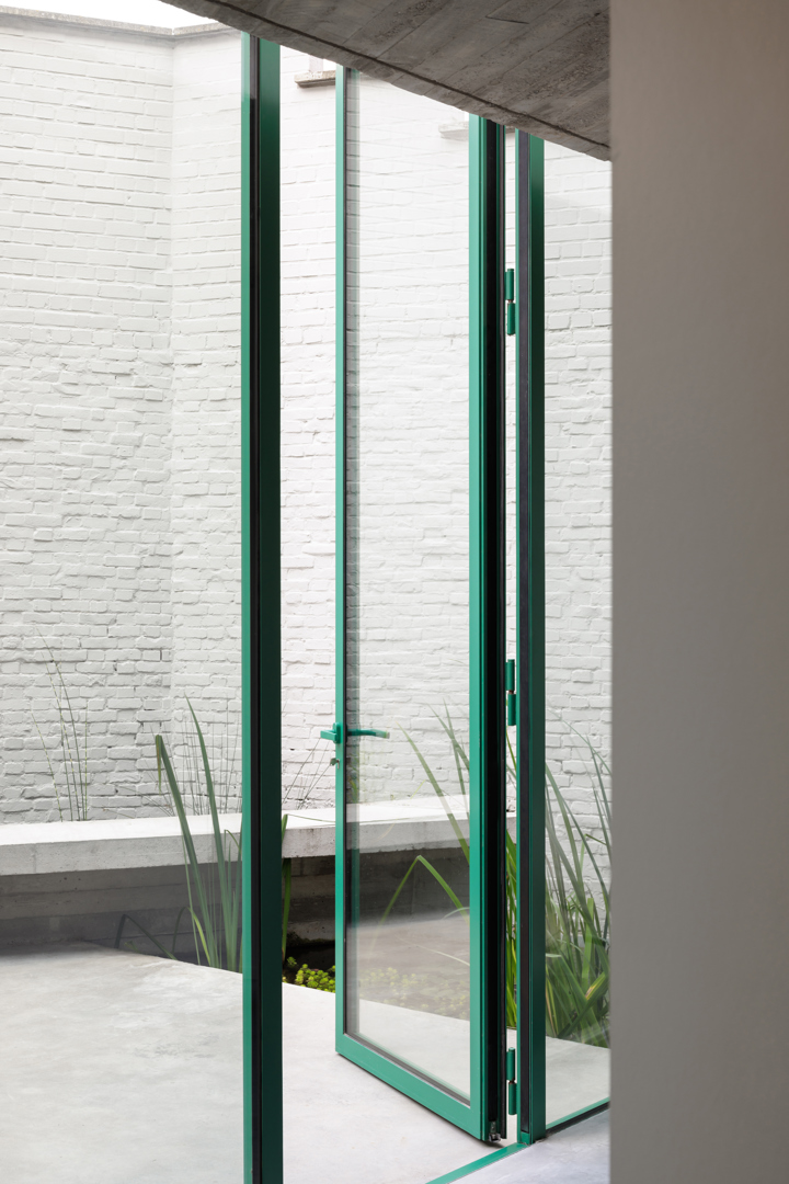 Initieel wilde de bouwheer een viertal vakantiewoningen realiseren, maar dit strookte niet met de strenge voorschriften in het Unesco-beschermde Brugge. Daarom werd gekozen voor één ruime, luchtige stadswoning, geschikt voor levenslang wonen, met lift over de vier bouwlagen. Door de beperkte footprint werden de onderste verdiepingen opengewerkt en deels uitgehold, waardoor een sterke verticale interactie ontstond. De diagonale aanbouw optimaliseert keuken, terras en binnentuin en laat maximaal licht binnen. Authentieke en nieuwe elementen worden verbonden via zichtbare betonstructuren en groene accenten.