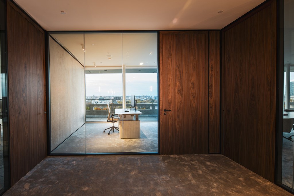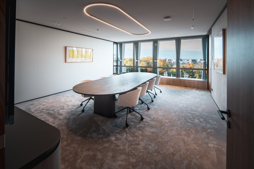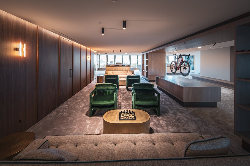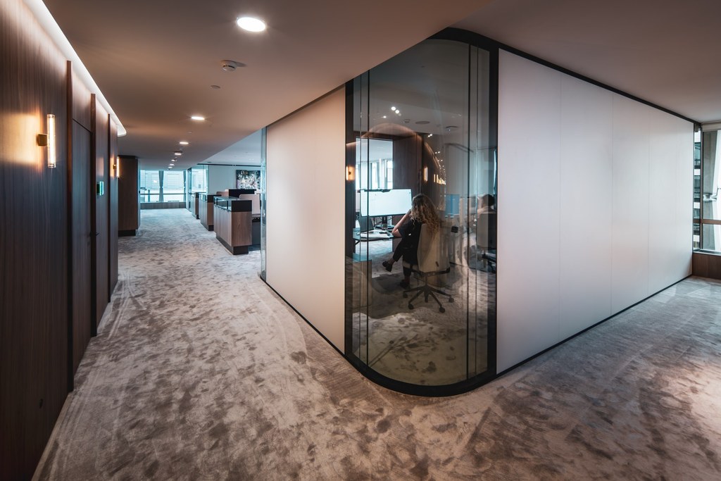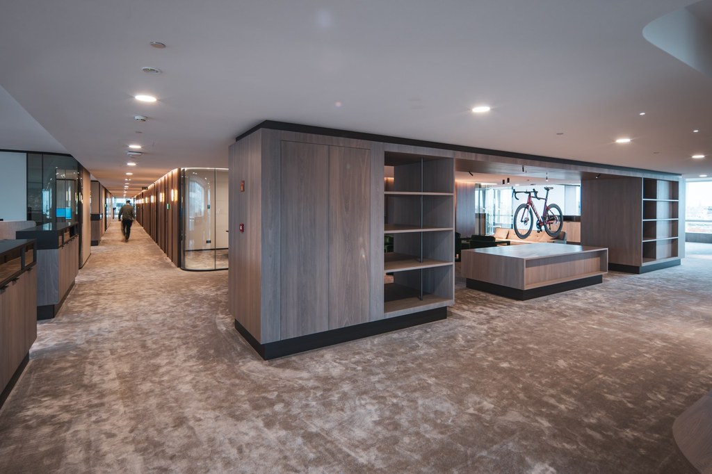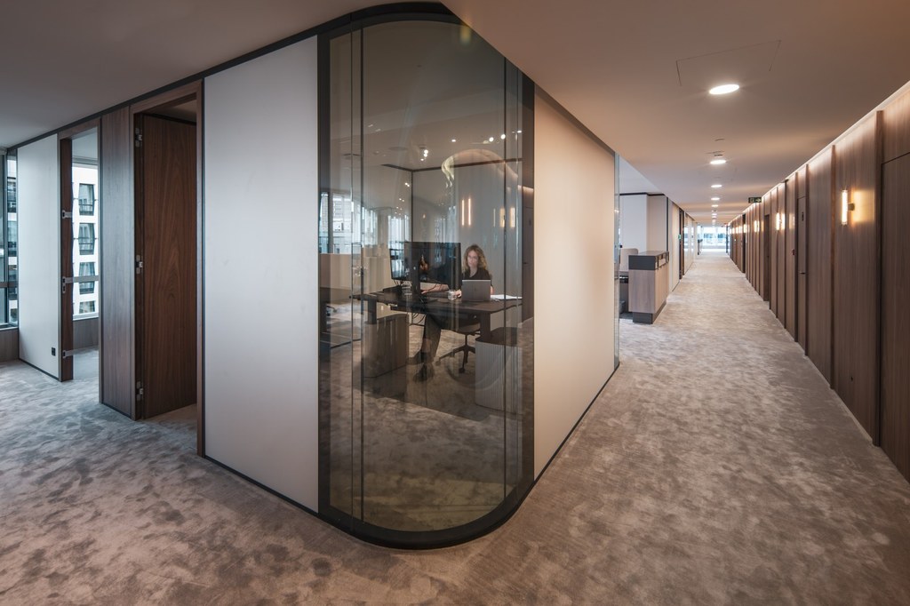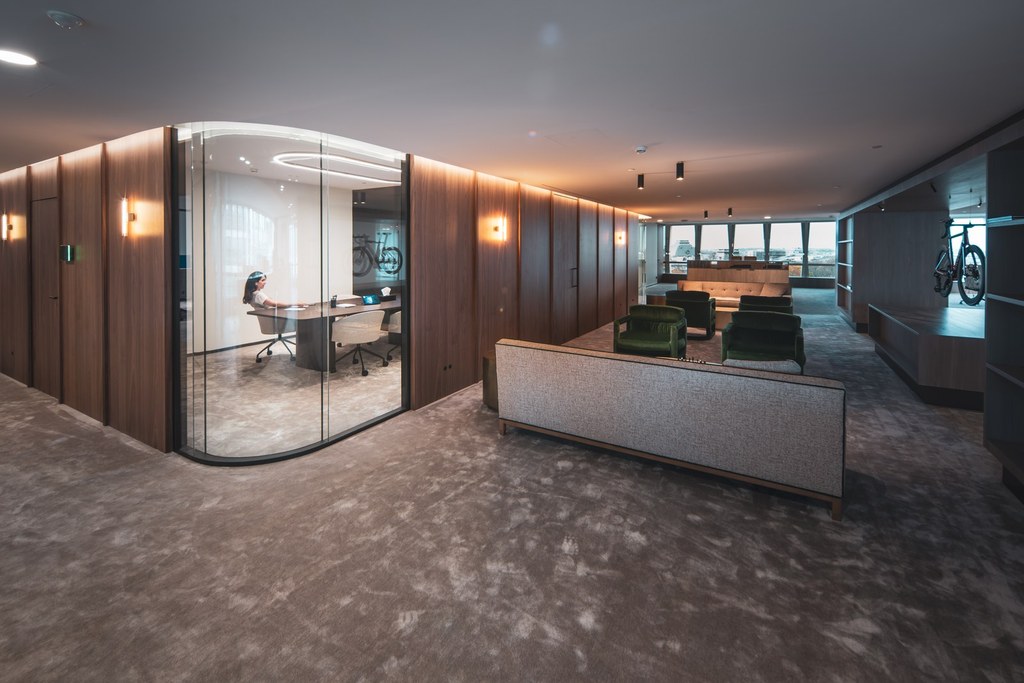 De grootste uitdaging was om een klassiek kantoorruimte te transformeren in een unieke en performante omgeving. De architectonische oplossing is gebaseerd op gebogen geometrie die de scherpe hoeken vervangt door vloeiende lijnen, waardoor informele ontmoetingen en een organisch parcours worden bevorderd. Het gebruik van gebogen transparante glazen wanden versterkt de lichtverspreiding en de verbinding tussen de zones. Het technische succes vereiste millimeterprecisie, met name voor het buigen van hout en de vervaardiging van gebogen glas, zodat de complexiteit verdwijnt voor de zuiverheid van de lijn. Deze aanpak verzacht de ruimtelijke perceptie en biedt een gevoel van ruimhartigheid op de kruispunten.