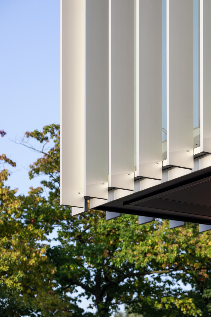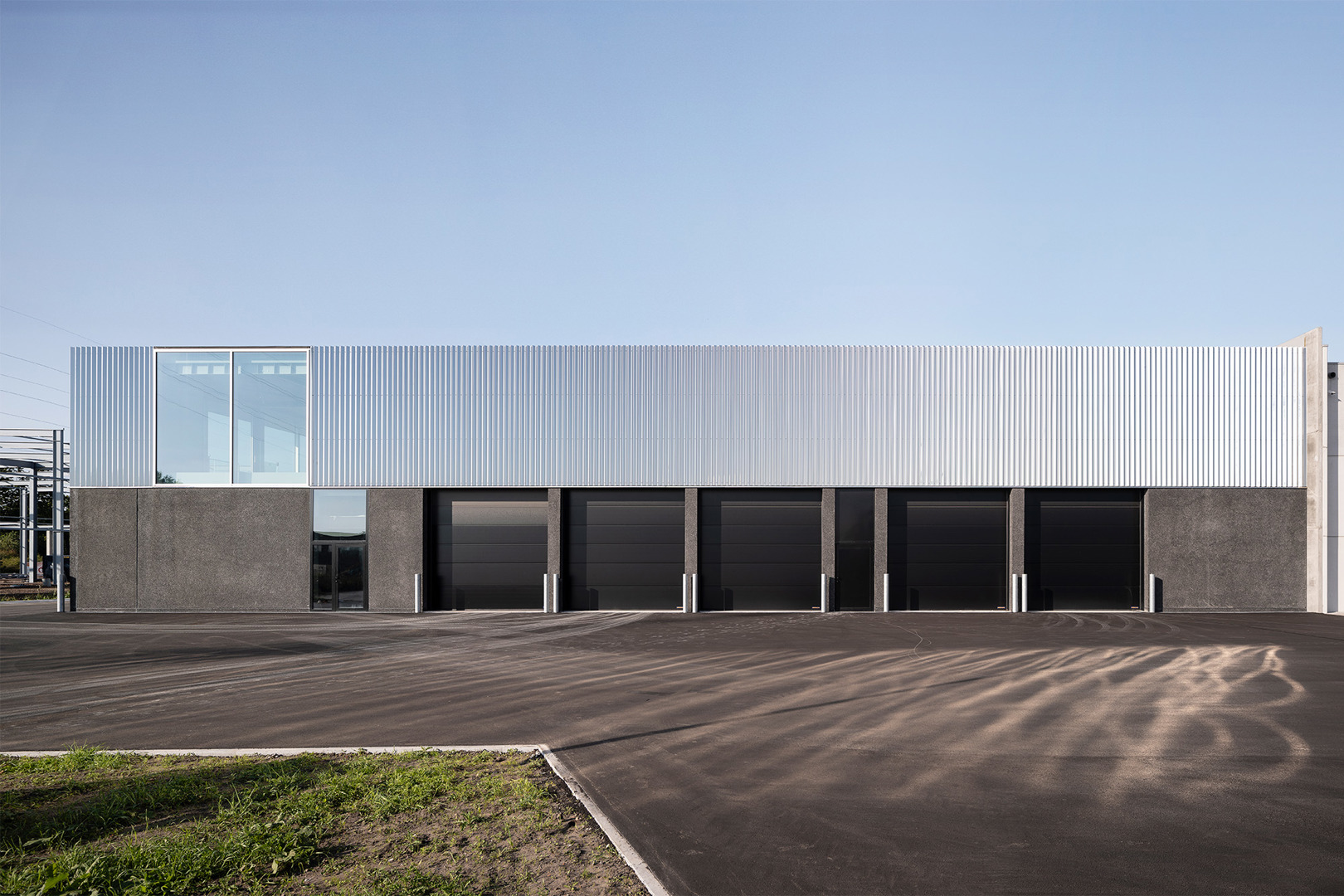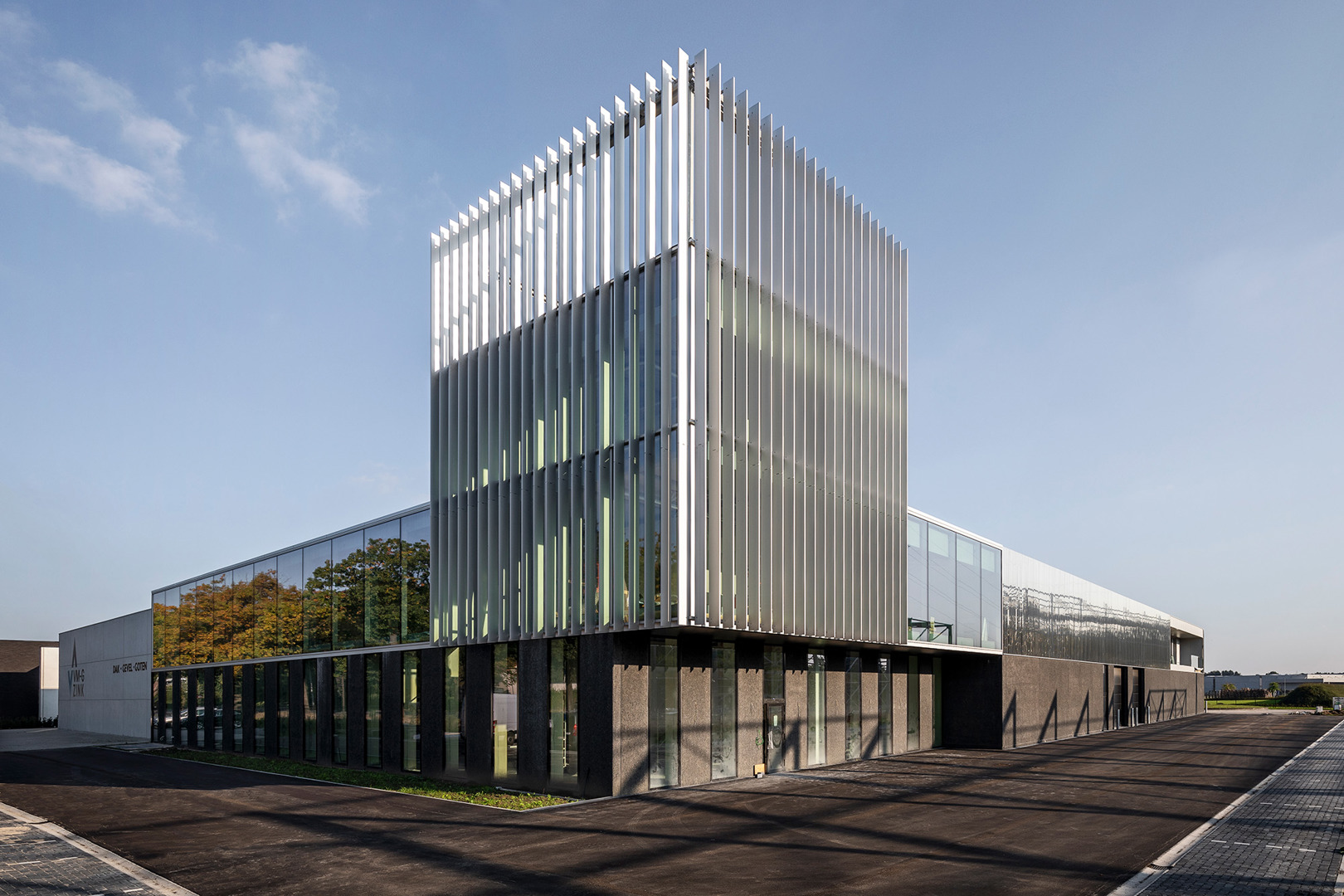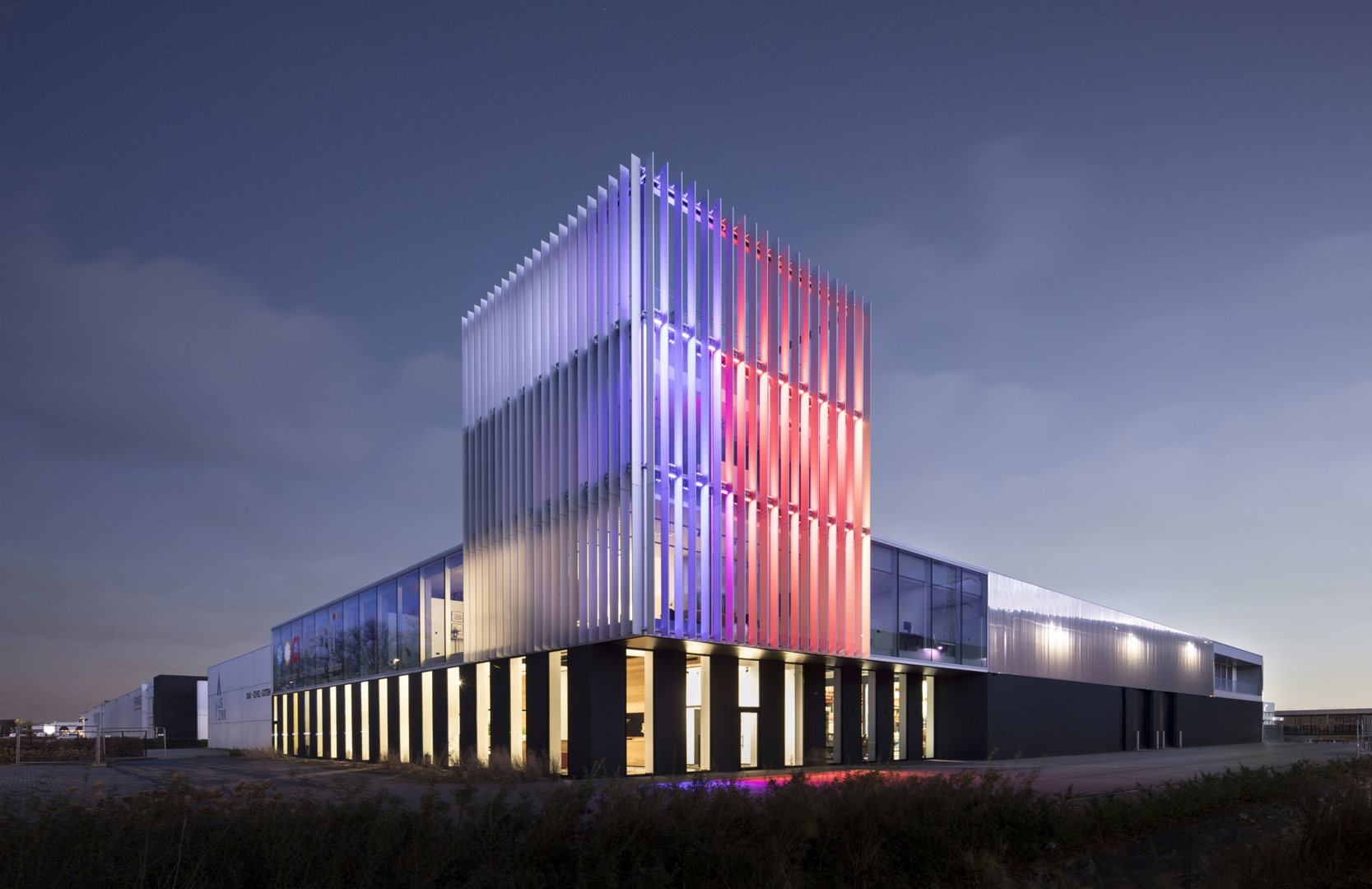 De grootste uitdagingen waren het overstijgen van louter functionele industriebouw, het creëren van een herkenbare toegangspoort en het verweven van zeer uiteenlopende functies in één coherent volume. Door een strak, abstract basiselement te combineren met strategische uitsnedes en transparante hoeken ontstaan duidelijke adressen en zichtrelaties. Het verticale lamellenvolume met geïntegreerde verlichting markeert de inkom en versterkt de identiteit van het gebouw, zonder de functionele werking te verstoren.