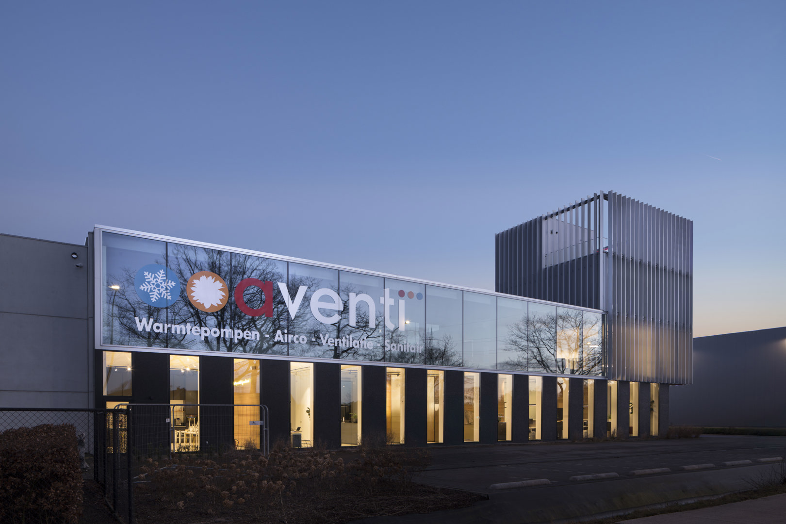Het ontwerp voor het nieuwe gebouw van Aventi verenigt bedrijfshal, kantoor en conciërgewoning in één helder, hedendaags volume. Als markant punt langs een strategische invalsweg van Beerse koppelt het functionaliteit aan architecturale expressie. De spiegelende inox gevel, donkere betonplint en transparante hoeken vormen een krachtig geheel dat sterk inspeelt op de omgeving. Een uitgesproken hoogteaccent boven de inkom bevat vergaderruimtes en is bekleed met metalen lamellen die de verticaliteit benadrukken en doorlopen tot boven het dakterras. ’s Nachts worden ze uitgelicht met LED-spots, wat de herkenbaarheid versterkt en de rol als toegangspoort tot Beerse benadrukt.