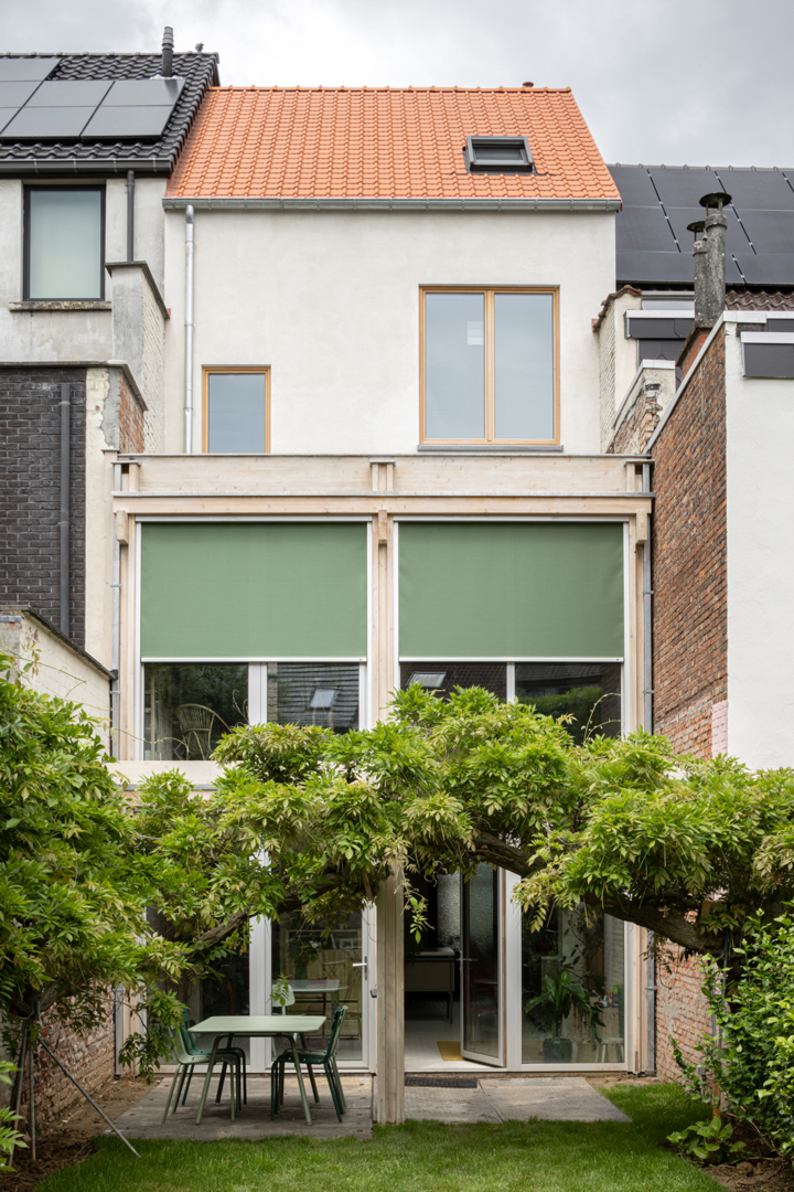 De uitdaging was het inpassen van het uitgebreid programma en tegelijk een beperkte footprint behouden om de tuin te maximaliseren. Het was een zoektocht naar natuurlijk licht en een sterke connectie met de tuin. Bestaande aanbouwen maken plaats voor een compacte houtskelet. De opengewerkte traphal verbindt alle niveaus en maakt zo deel uit van de leefruimtes. De nieuwe aanbouw brengt daglicht diep in de woning en versterkt de relatie tussen de verdiepingen. Aan de tuinzijde vormt een uitloper van de structuur een ondersteuning voor de blauwe regen, deze vormt een buitenkamer als verlengde van het interieur. Het hellend dak wordt opgehoogd voor extra volume en bruikbare opp., als een elegante top-up. De ruimtes zijn flexibel en kunnen zich aanpassen aan veranderende noden van het gezin.