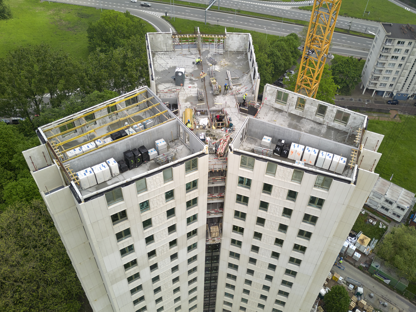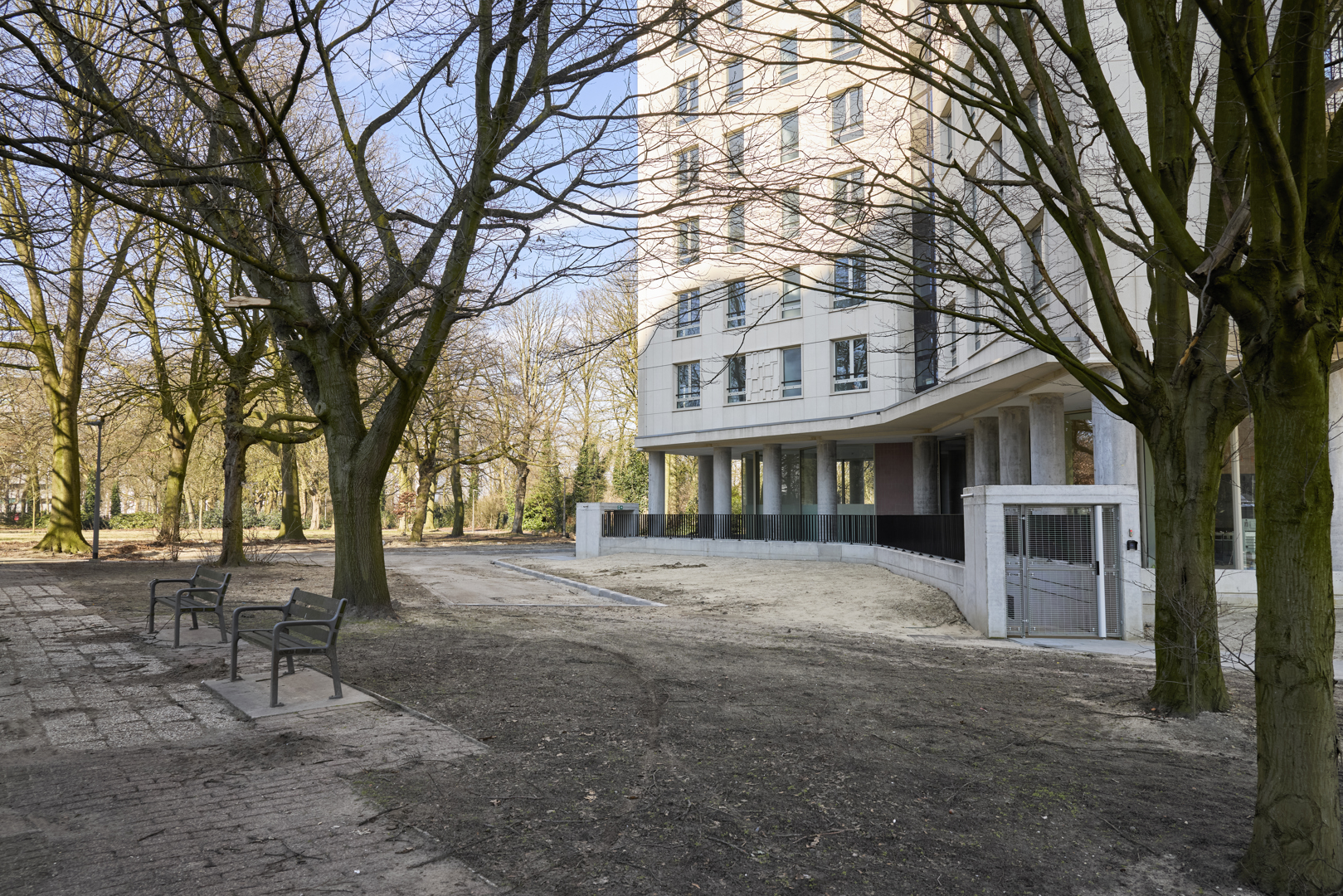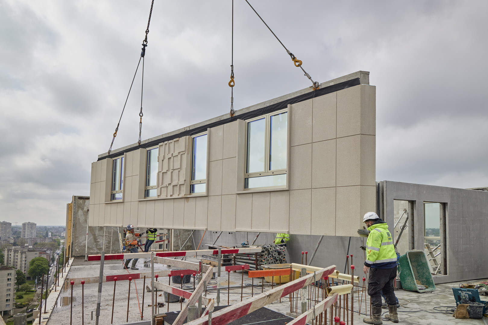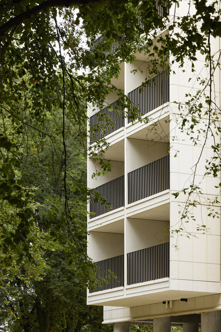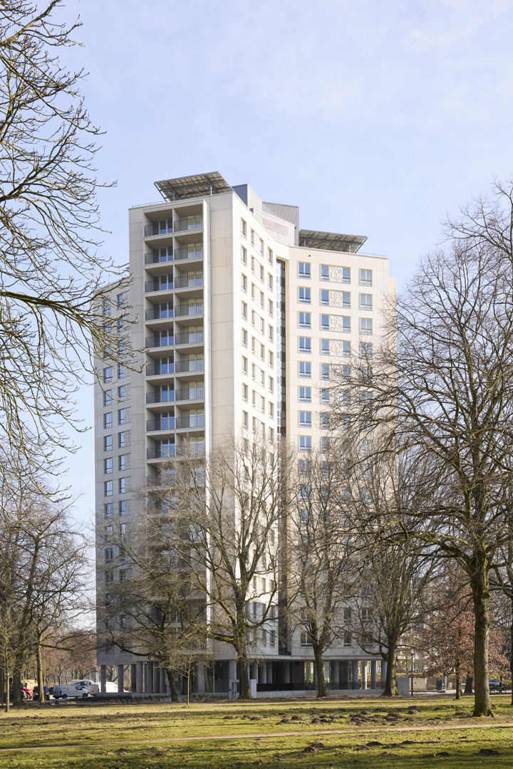 Reconstructie is geen evidente keuze, maar wel pragmatisch wanneer transformatie van het origineel ontoereikend bleek. We kozen voor een actualisatie in de geest van Smolderen, zonder letterlijke imitatie. De torens zullen er bijna hetzelfde uitzien, voldoen aan de huidige normen, BEN en CO2-neutraal worden. Door optimalisatie van het plan realiseren we opnieuw 96 appartementen per toren. Oppervlaktenormen zijn strikt toegepast, met behoud van de generositeit van het oorspronkelijke concept: edel materiaalgebruik, een transparant gelijkvloers, riante inkomhallen, gemeenschappelijke ruimtes, royale trappen en liftbordessen met zicht op park, stad en Schelde. Voor een getrouwe en energetisch performante reconstructie van de gevels werden betonnen sandwichpanelen met carbonwapening toegepast