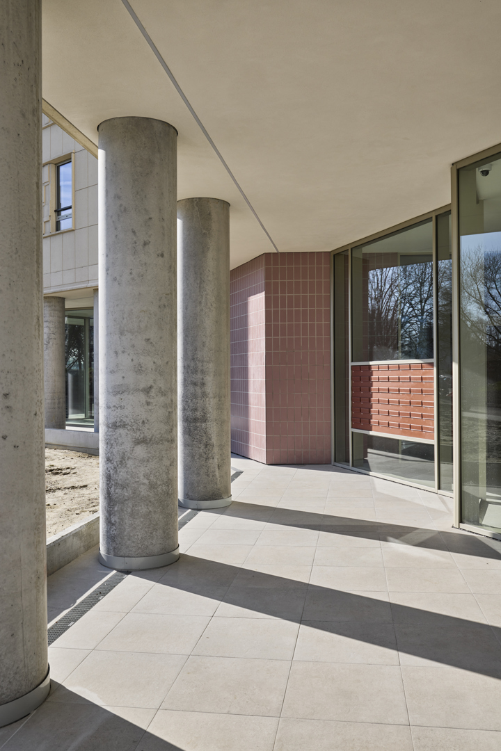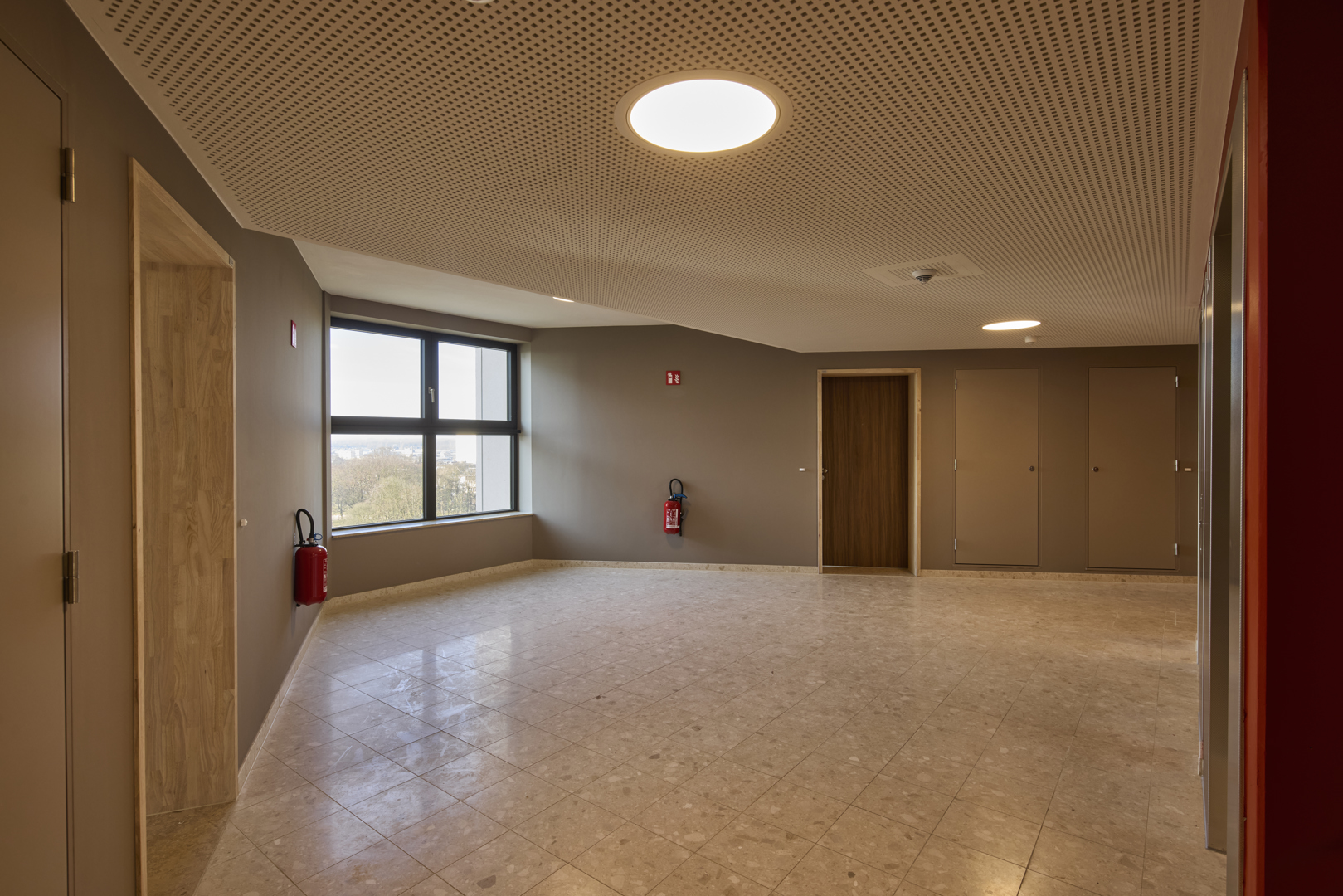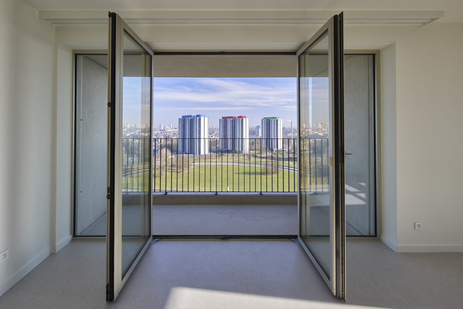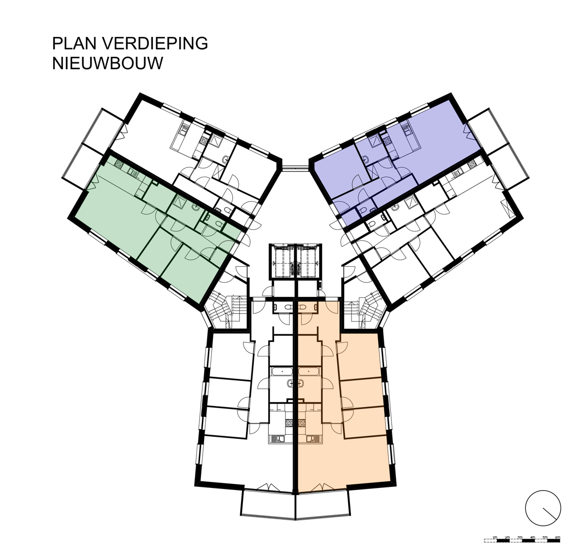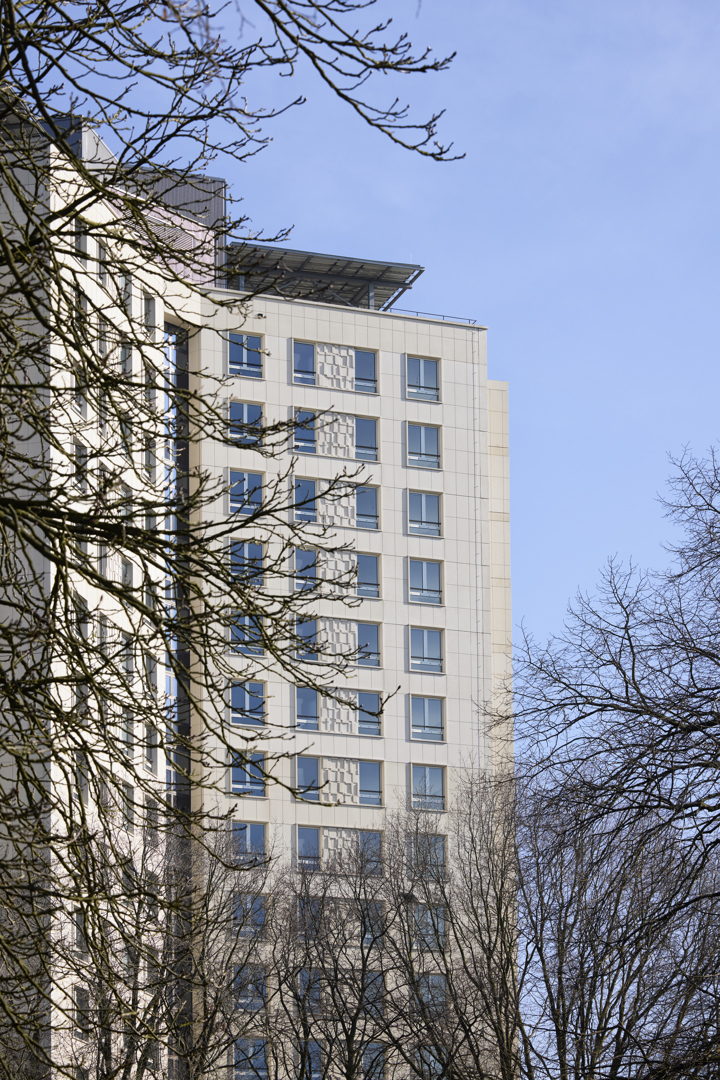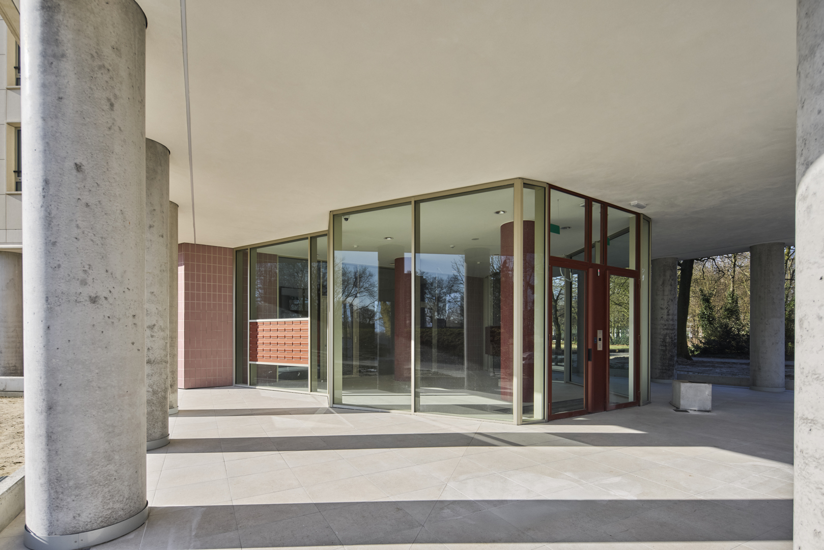 Reconstructie is geen evidente keuze, maar wel pragmatisch wanneer transformatie van het origineel ontoereikend bleek. We kozen voor een actualisatie in de geest van Smolderen, zonder letterlijke imitatie. De torens zullen er bijna hetzelfde uitzien, voldoen aan de huidige normen, BEN en CO2-neutraal worden. Door optimalisatie van het plan realiseren we opnieuw 96 appartementen per toren. Oppervlaktenormen zijn strikt toegepast, met behoud van de generositeit van het oorspronkelijke concept: edel materiaalgebruik, een transparant gelijkvloers, riante inkomhallen, gemeenschappelijke ruimtes, royale trappen en liftbordessen met zicht op park, stad en Schelde. Voor een getrouwe en energetisch performante reconstructie van de gevels werden betonnen sandwichpanelen met carbonwapening toegepast