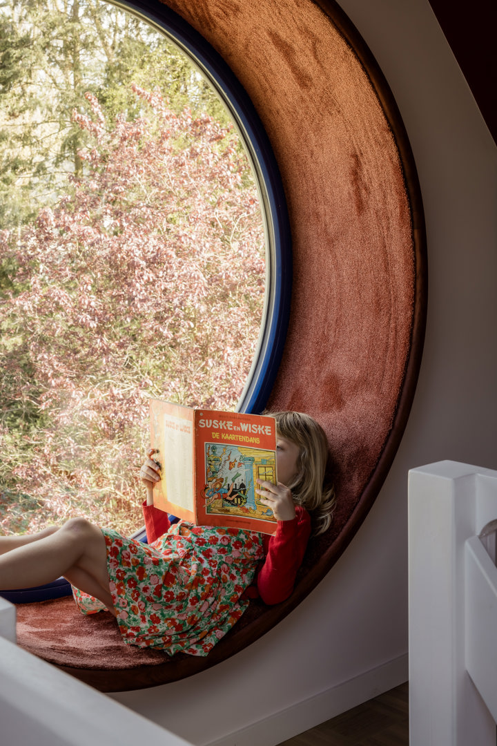 De duurzaamheid van Koningsmantel laat zich voelen in het aanwezige. Het bestaande volume wordt niet vergroot, maar intenser bewoond. Geen uitbreiding, geen nieuwe contour, geen bijkomend ruimtebeslag. Wat er al was, wordt aangesproken tot zijn volle capaciteit. Ook in gebruik ligt duurzaamheid besloten. Het meubel fixeert niet, maar suggereert. Het tapijt nodigt uit tot zitten, liggen, spelen. Afgeronde hoeken laten klimmen en glijden toe. Het ronde raam wordt een plek om in te verdwijnen. De ruimte groeit mee met het gezin. Zonder zichzelf te verliezen. Niet als eindpunt, maar als drager van tijd.