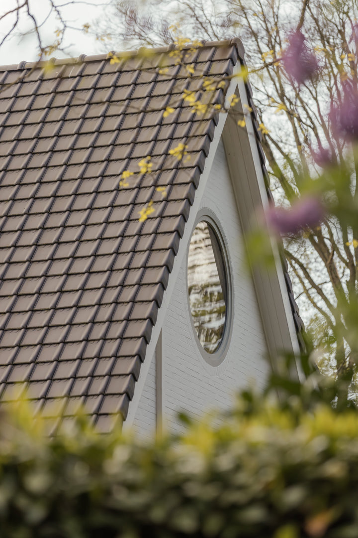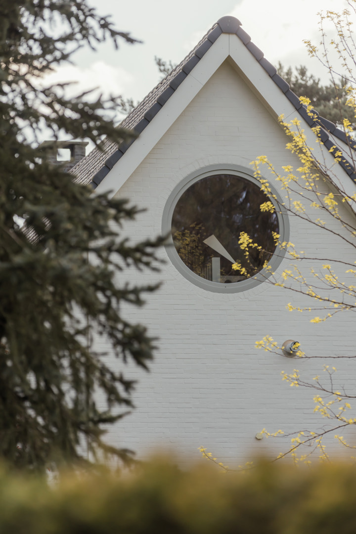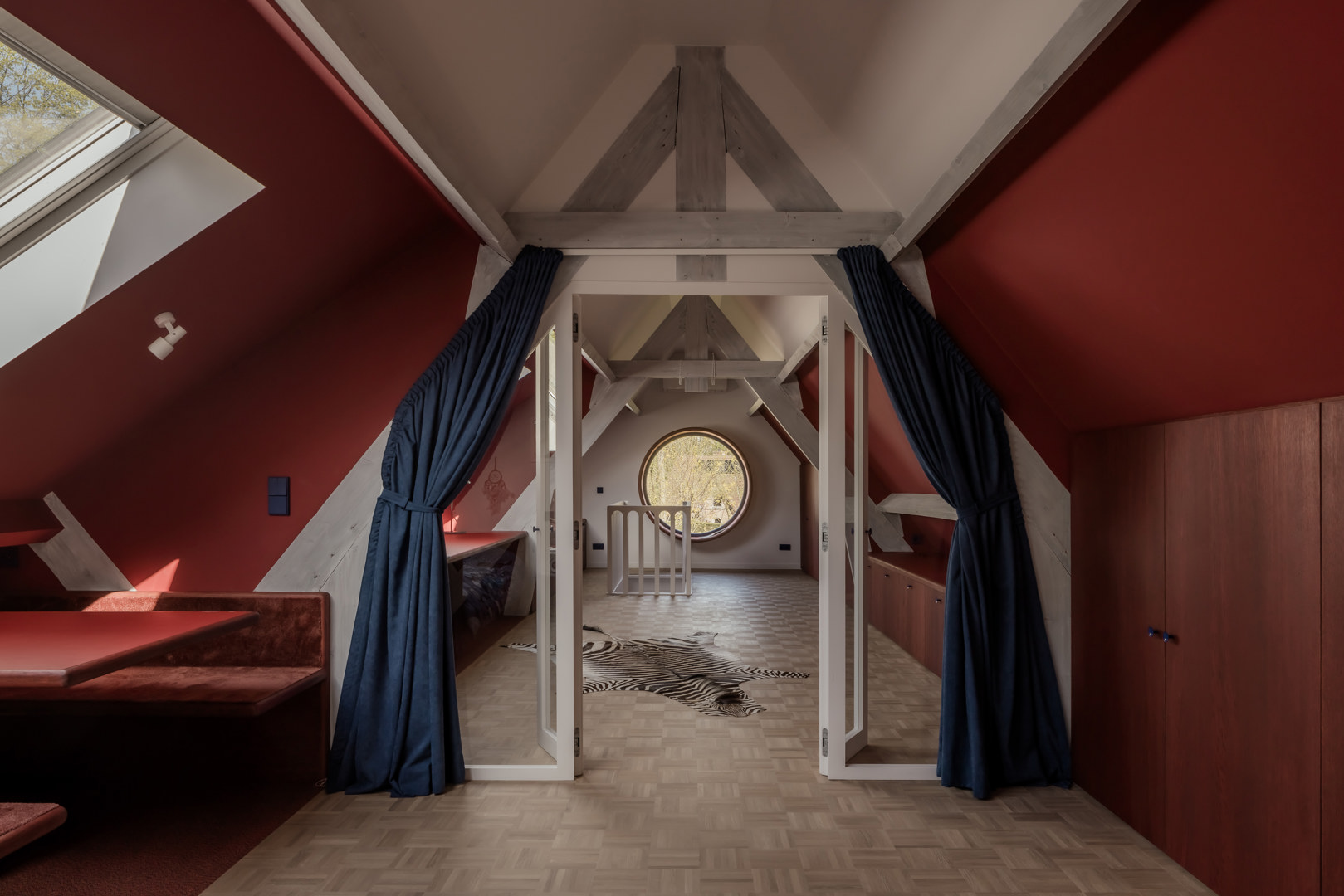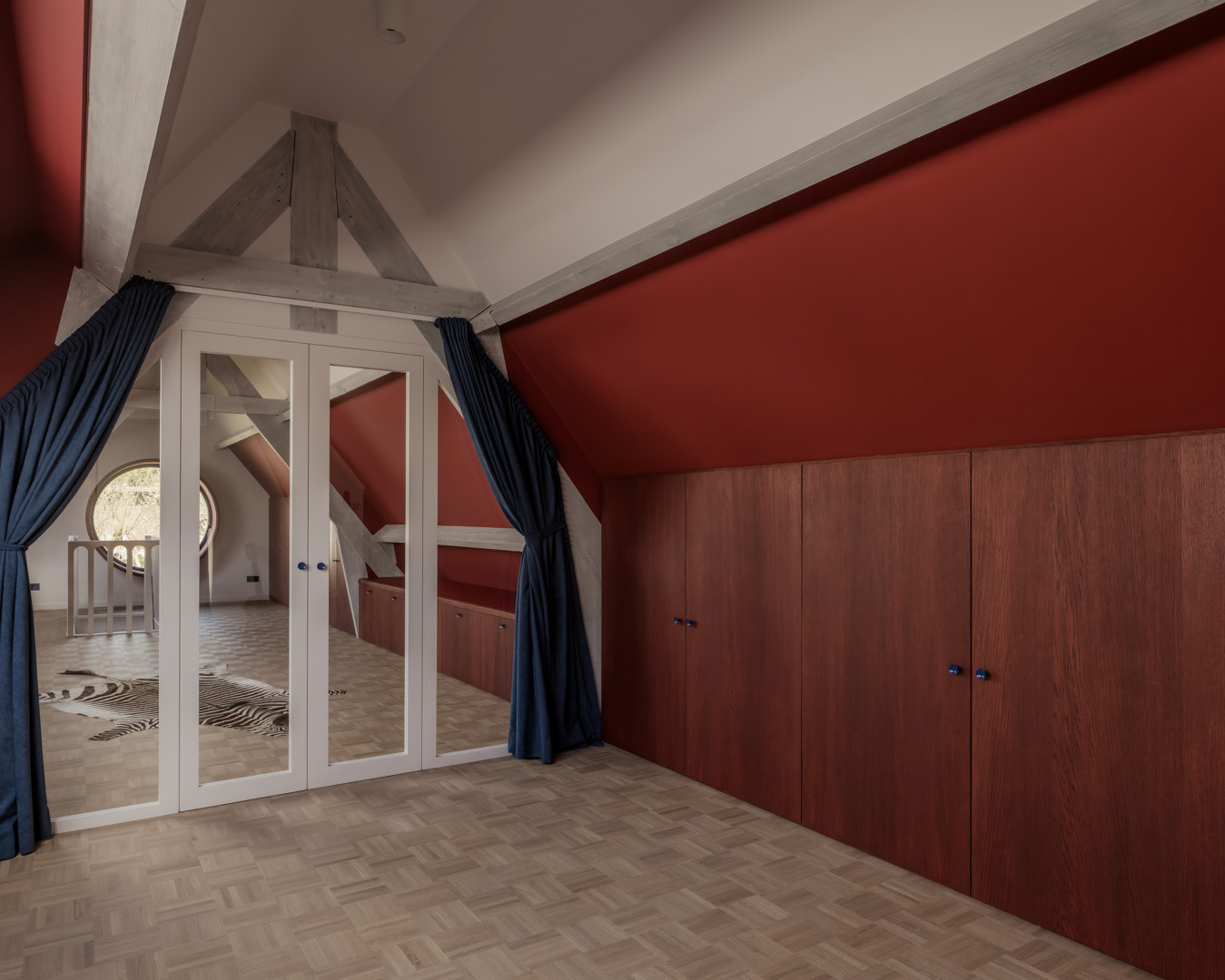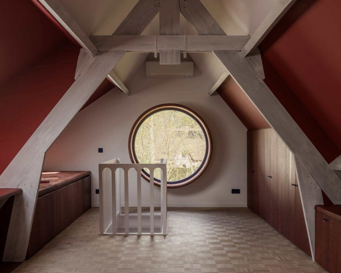 De kracht van de zolder lag in haar helderheid. De nok tekende een uitgesproken hoogte. De spanten verdeelden zonder te scheiden. Die leesbaarheid moest blijven. Een omvangrijk programma. Klassieke partitionering zou de continuïteit verbreken en de ruimte reduceren tot restzones. Daarom werd gekozen voor concentratie in plaats van verdeling. Alle vaste functies worden opgenomen in een doorlopend meubel. Een kinderkamer, een werkplek met geïntegreerde slaapmogelijkheid, een verhoogd platform en een opeenvolging van kasten als verdichting van de perimeter. Een bijkomende ingreep naar buiten toe. Waar voorheen enkel de hemel zichtbaar was, opent een rond raam in de topgevel een nieuw perspectief. De tuin als deel van het interieur. De ruimte blijft leesbaar. Maar niet langer gesloten.
