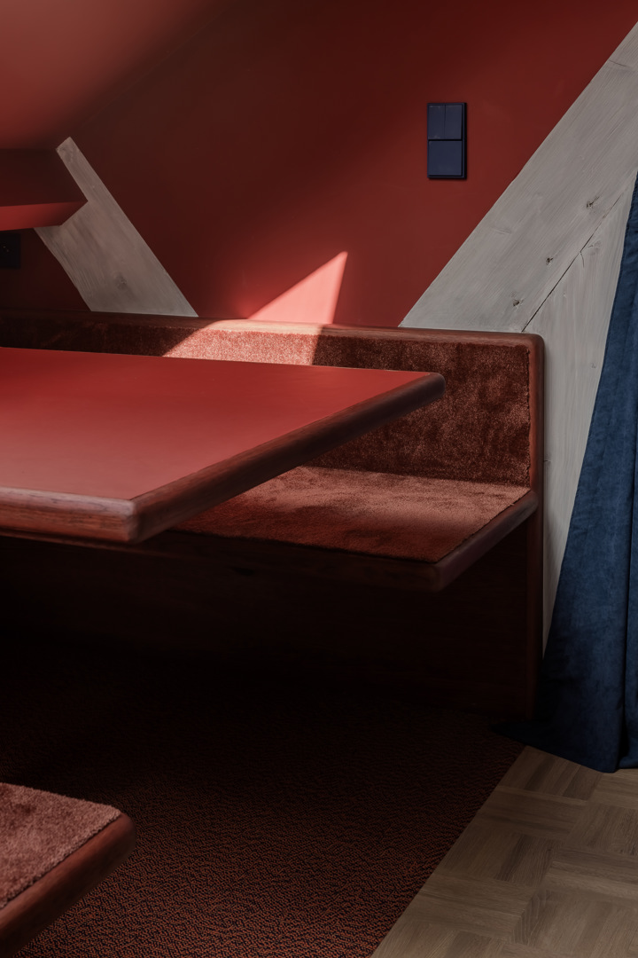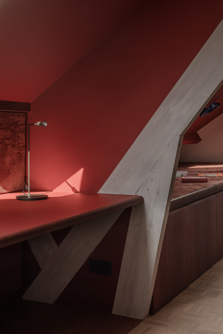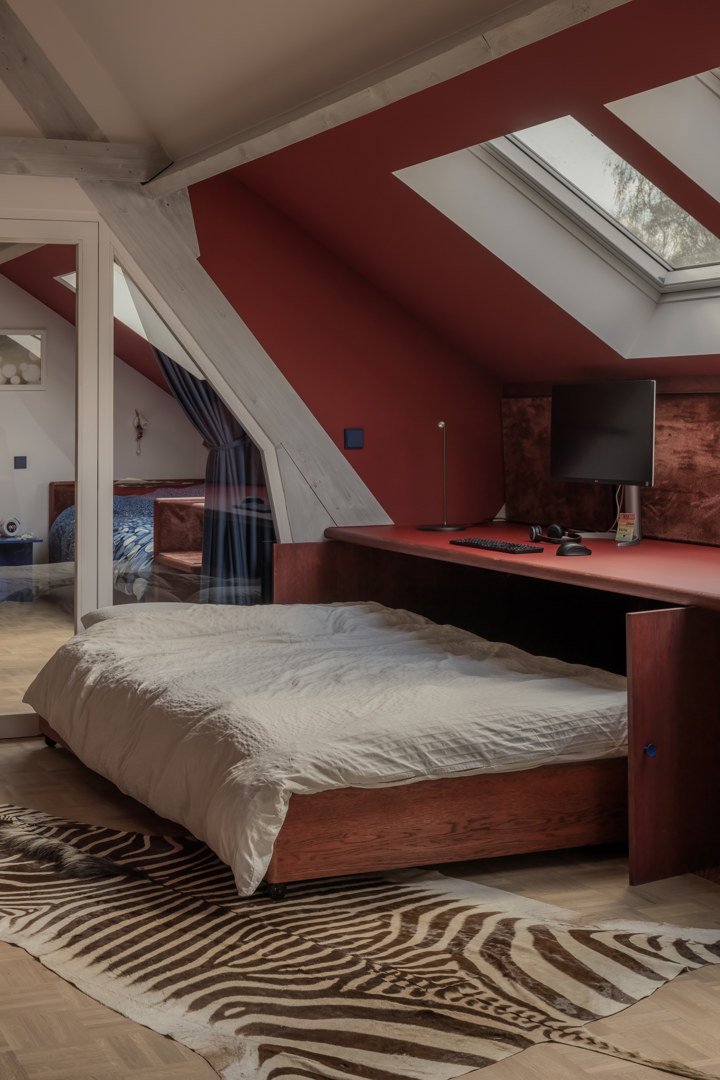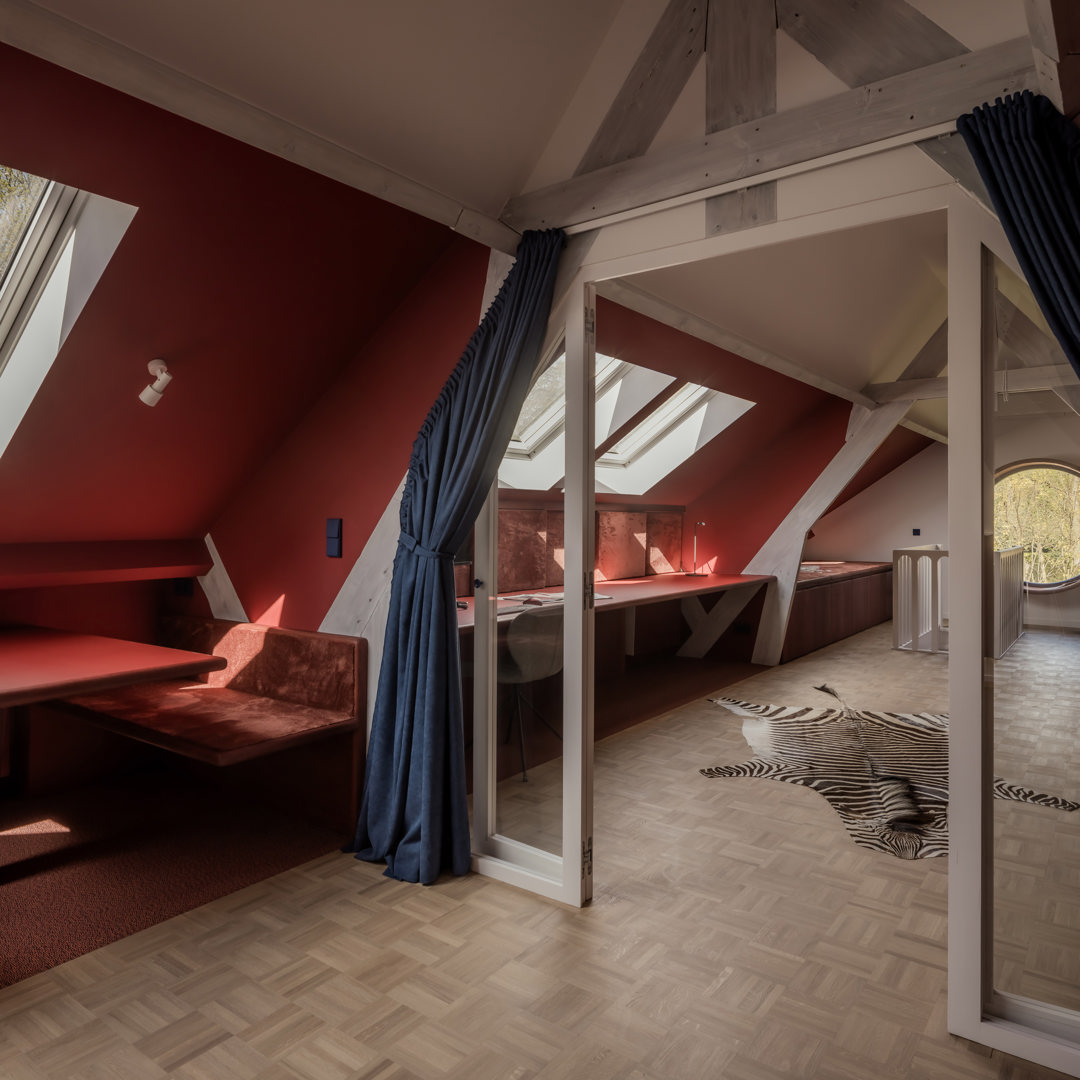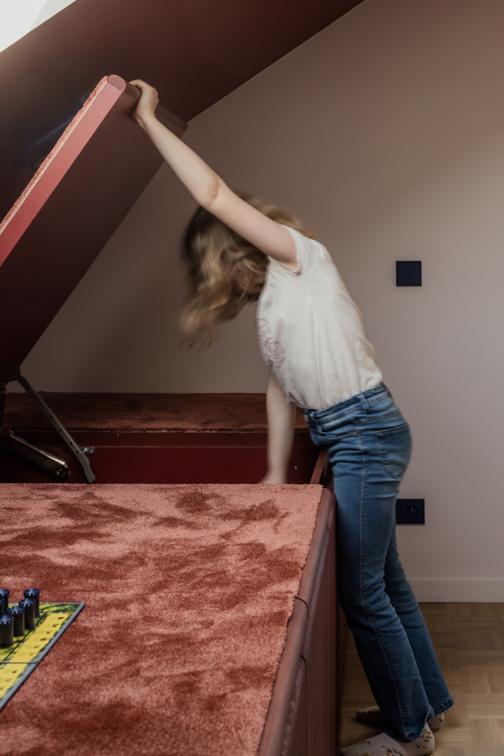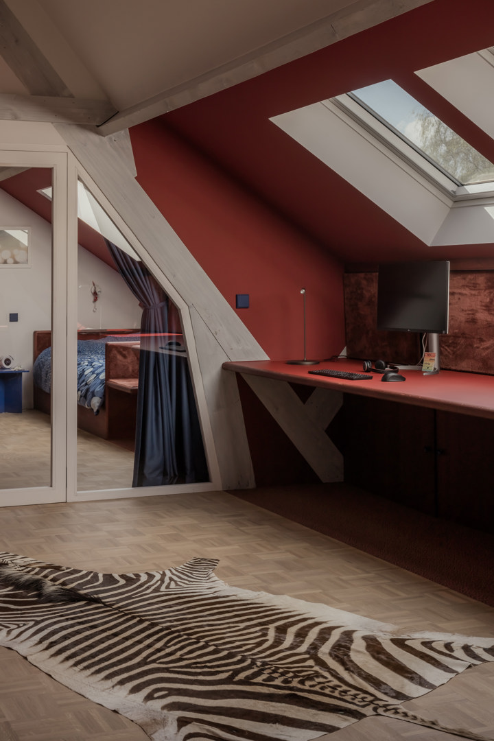 Onder het hellende dak van deze woning lag een royale zolderverdieping. Een open volume, gedragen door twee spanten, waar hoogte verschijnt en langzaam weer verdwijnt. Het was een informele plek. Gebruikt, maar onbestemd. Het gezin groeide. Vier kinderen. Nieuwe noden. Een bijkomende slaapkamer, een werkplek, ruimte om te slapen na nachtdiensten, en vooral een genereuze speelruimte. Alles moest samenkomen. De ingreep vertrekt vanuit het behoud van openheid. In plaats van kamers toe te voegen, wordt een langgerekt meubel ontwikkeld langs beide dakranden. Daar waar de hoogte vanzelf afneemt, nestelen zich bedden, werkplekken en opbergruimte. De centrale zone blijft beschikbaar. Een vrije ruimte, gedragen door het dak zelf. De zolder wordt geen verzameling kamers, maar een continu interieur.