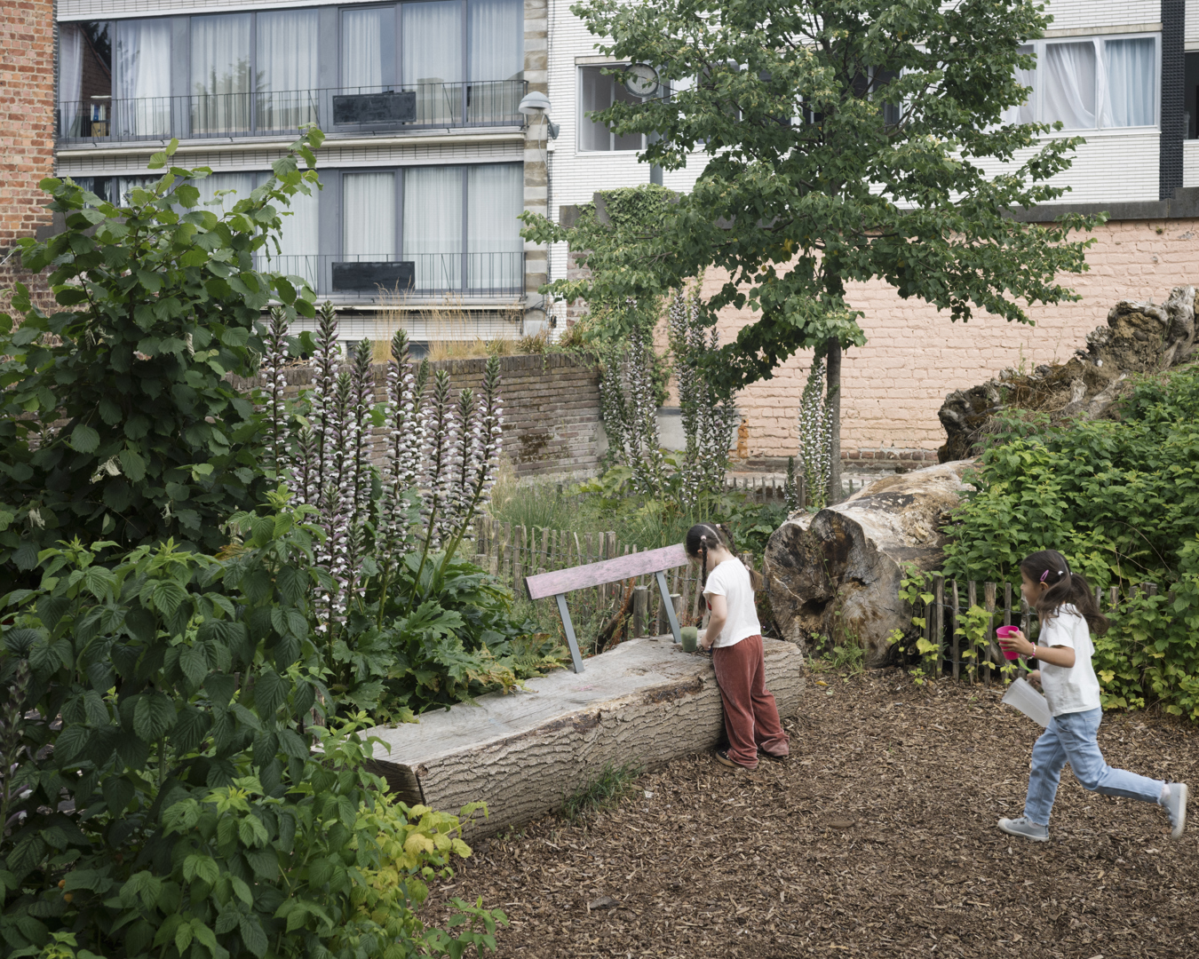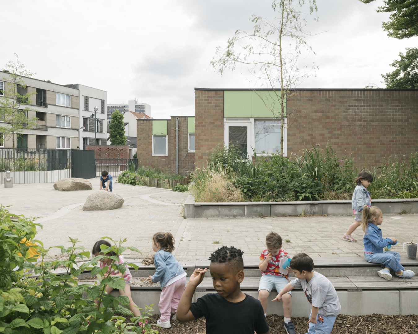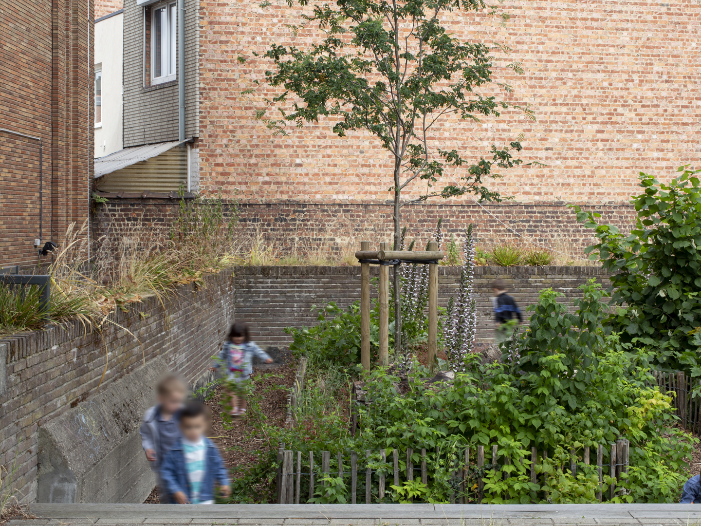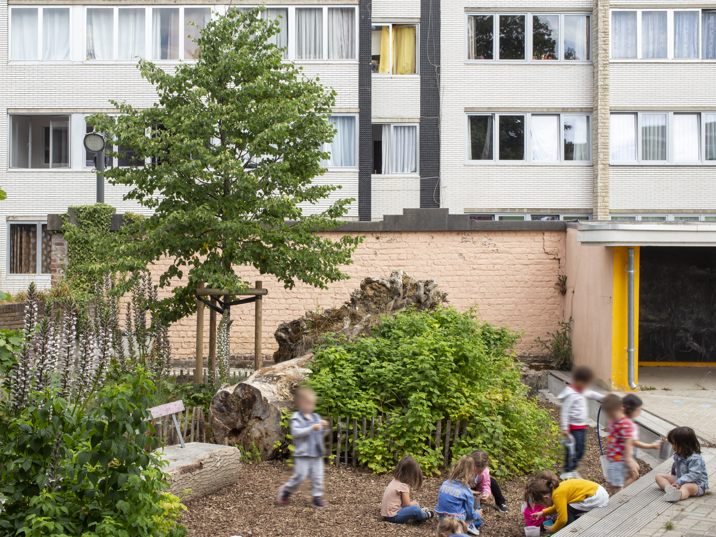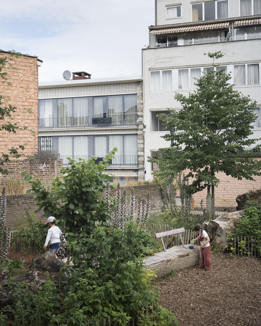 De herinrichting van de speelplaats biedt zowel een dynamische tuin als de inrichting van echte ecosystemen. Het is de bedoeling om dit nieuwe speellandschap niet te verankeren, maar een dynamisch parcours door tuinen aan te bieden. Deze weinig gedefinieerde structuren stimuleren de verbeelding en bewegingsvrijheid. Hierdoor krijgt informeel spel ruimte, waarbij het kind de dirigent wordt, vrij in zijn bewegen. Natuurlijke materialen en levende elementen maken de actie: vegetatie, topografie, waterspelen en stammen die blijven liggen voor de biodiversiteit creëren pedagogische steunen, vindingrijkheid en co-creatie.
