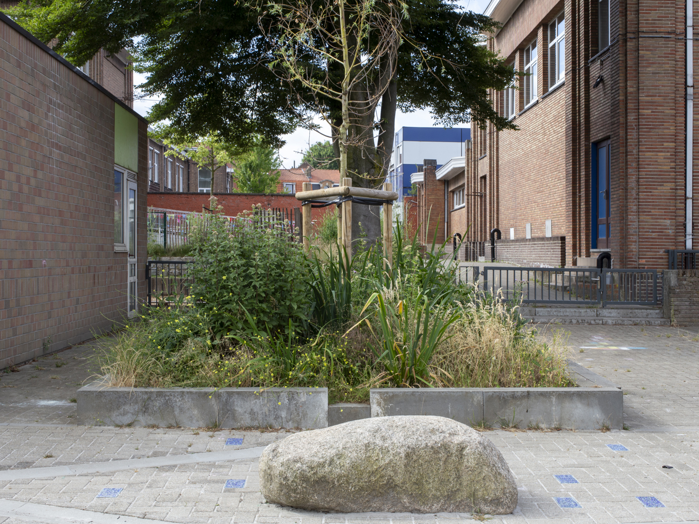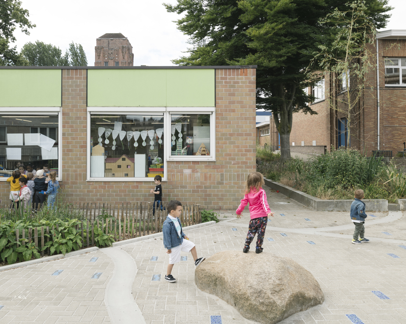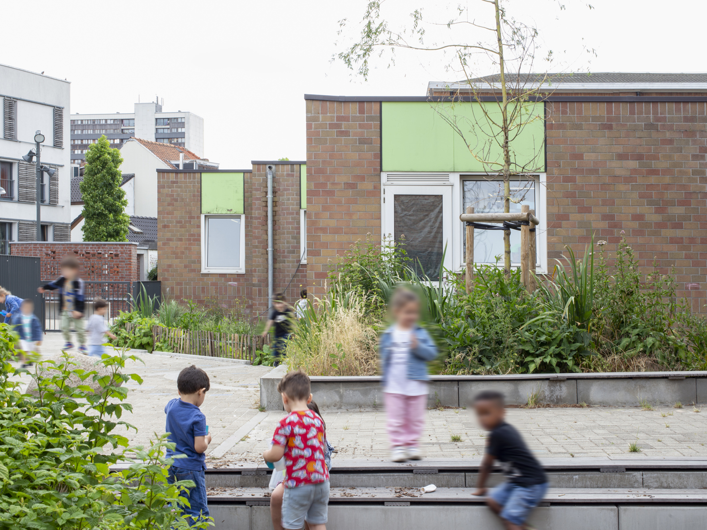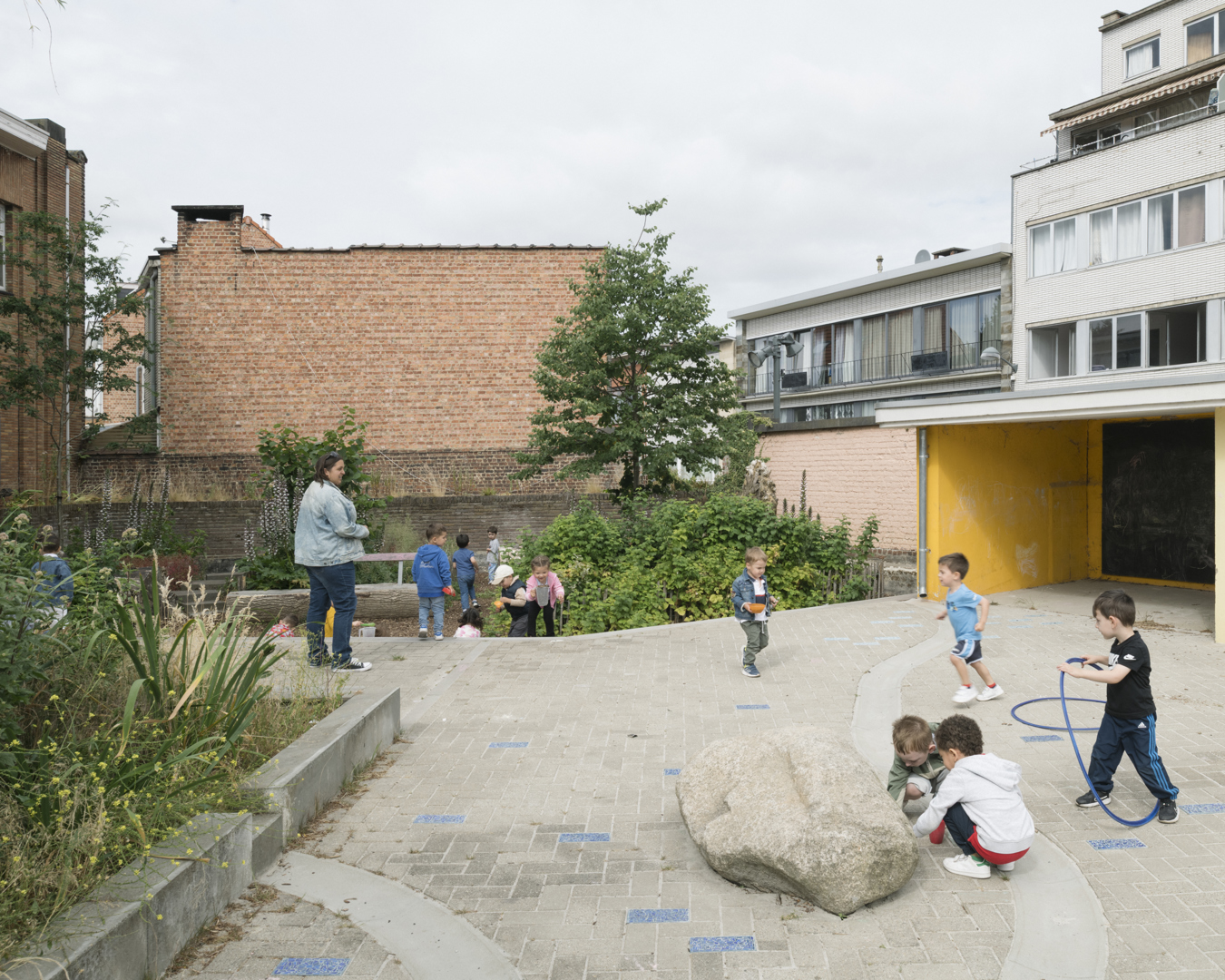 De herinrichting van de speelplaats biedt zowel een dynamische tuin als de inrichting van echte ecosystemen. Het is de bedoeling om dit nieuwe speellandschap niet te verankeren, maar een dynamisch parcours door tuinen aan te bieden. Deze weinig gedefinieerde structuren stimuleren de verbeelding en bewegingsvrijheid. Hierdoor krijgt informeel spel ruimte, waarbij het kind de dirigent wordt, vrij in zijn bewegen. Natuurlijke materialen en levende elementen maken de actie: vegetatie, topografie, waterspelen en stammen die blijven liggen voor de biodiversiteit creëren pedagogische steunen, vindingrijkheid en co-creatie.