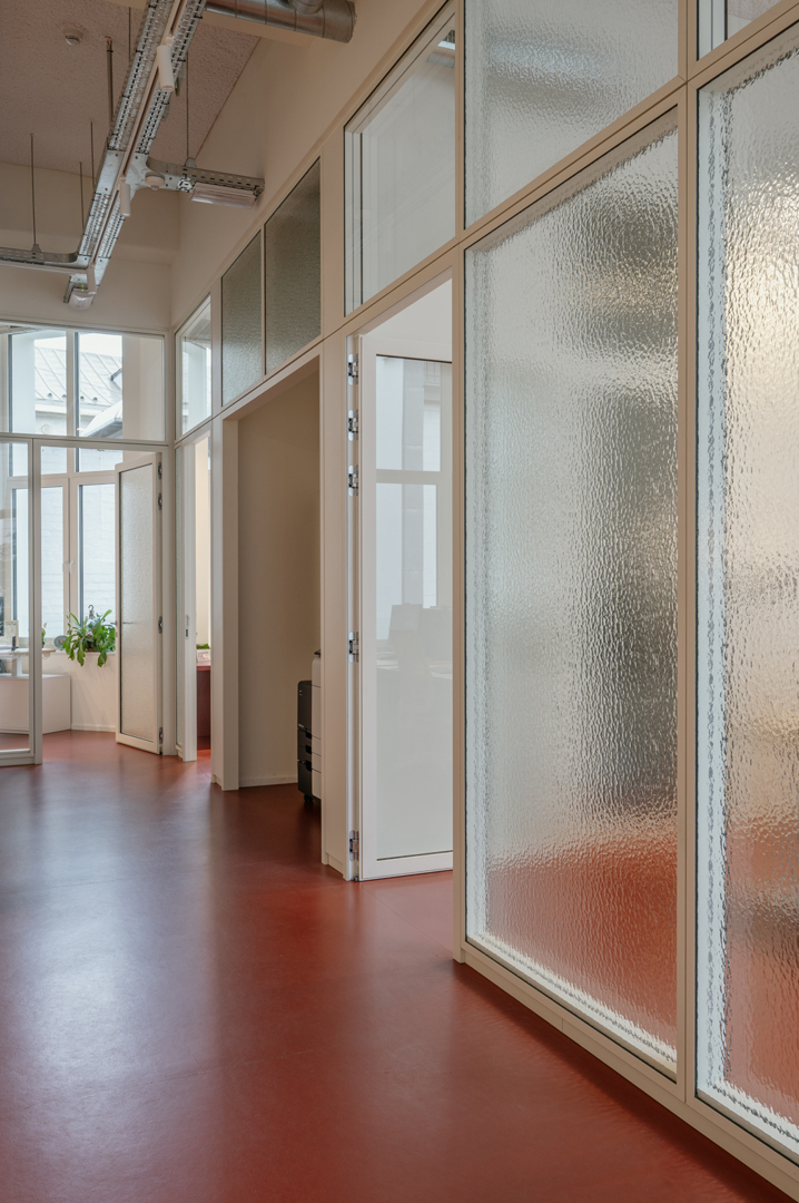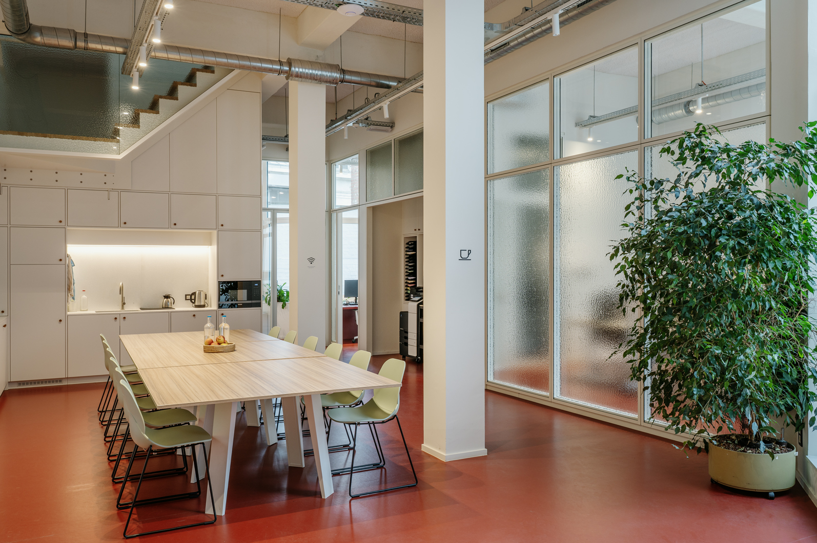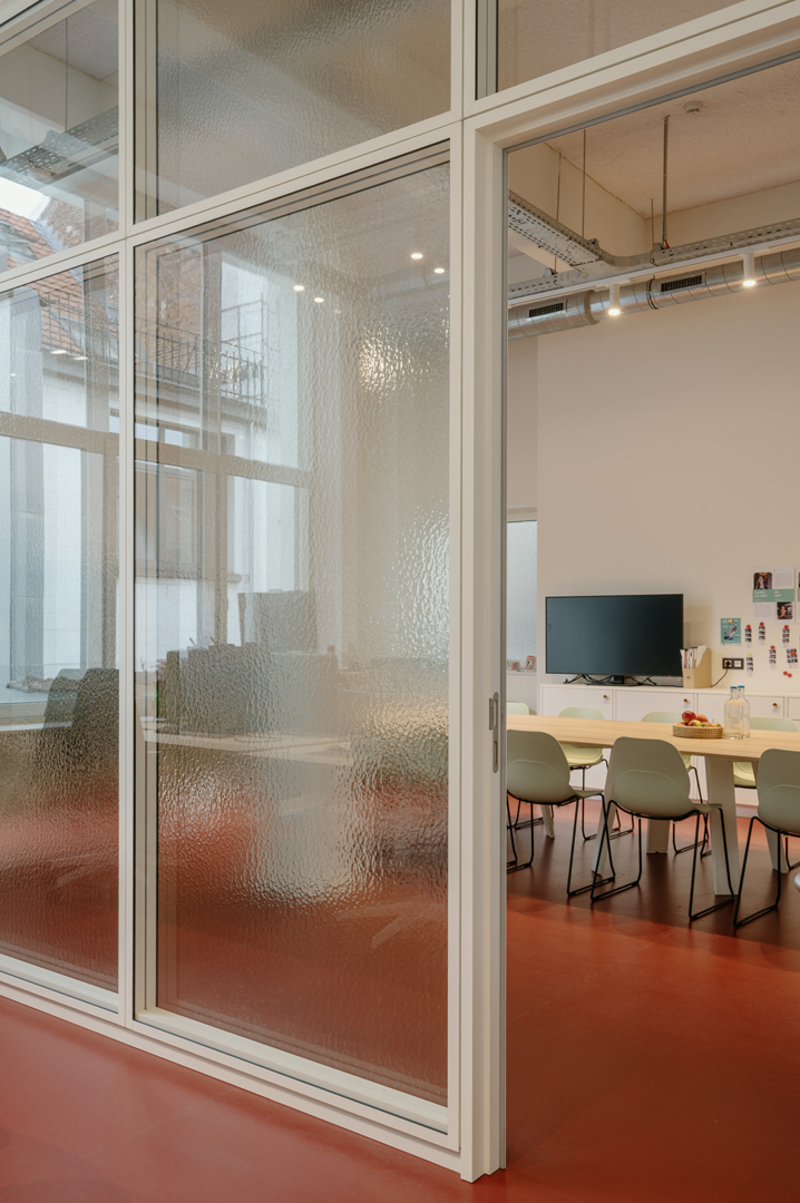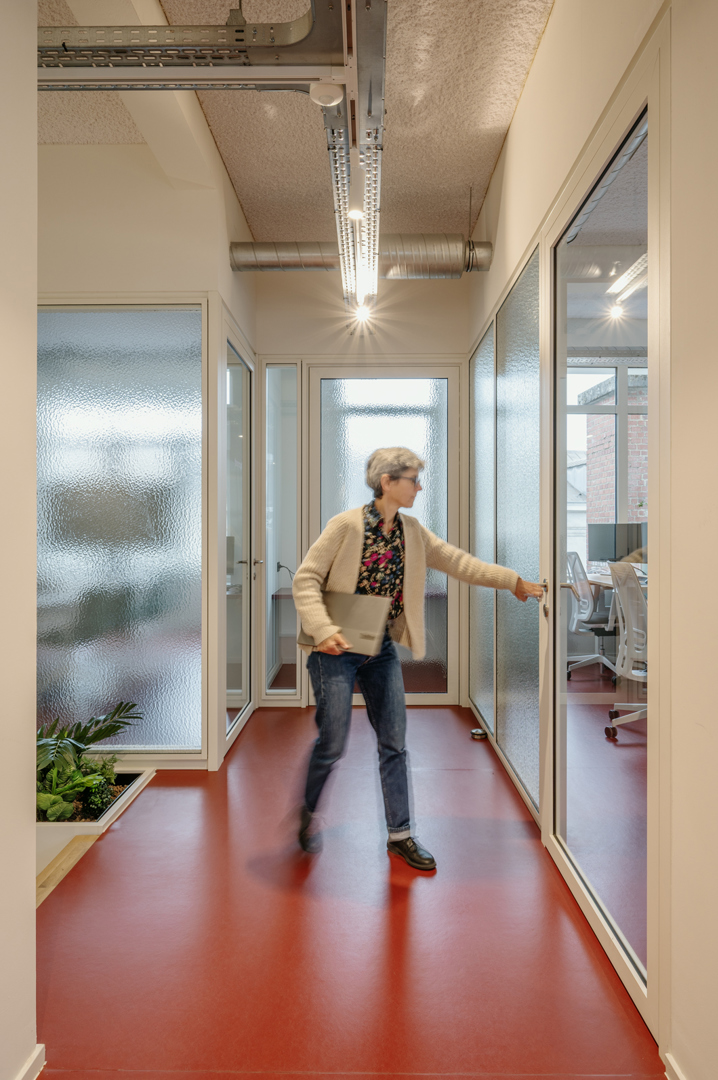 De belangrijkste uitdaging bestond erin om het kantoor efficiënter te organiseren en drie verdiepingen te herleiden tot twee, zonder in te boeten aan kwaliteit en gebruikscomfort. Dit werd opgelost via een doordachte herinrichting met een grotere densiteit én een gevarieerd aanbod aan werkplekken (open werkplekken, focusruimtes, vergaderzones). Tegelijk werd ingezet op een toekomstgericht en circulair gebouw: een passief geïsoleerde schil, performante technische uitrusting en demonteerbare materialen. Alle technieken blijven zichtbaar en aanpasbaar. Binnenwanden zijn volledig demonteerbaar en niet structureel, wat maximale flexibiliteit garandeert. Bijkomend werd het gebrek aan daglicht op de onderste verdieping opgelost door de introductie van een patio met natuurlijk licht en lucht.