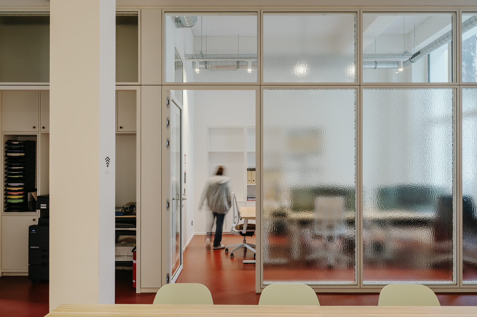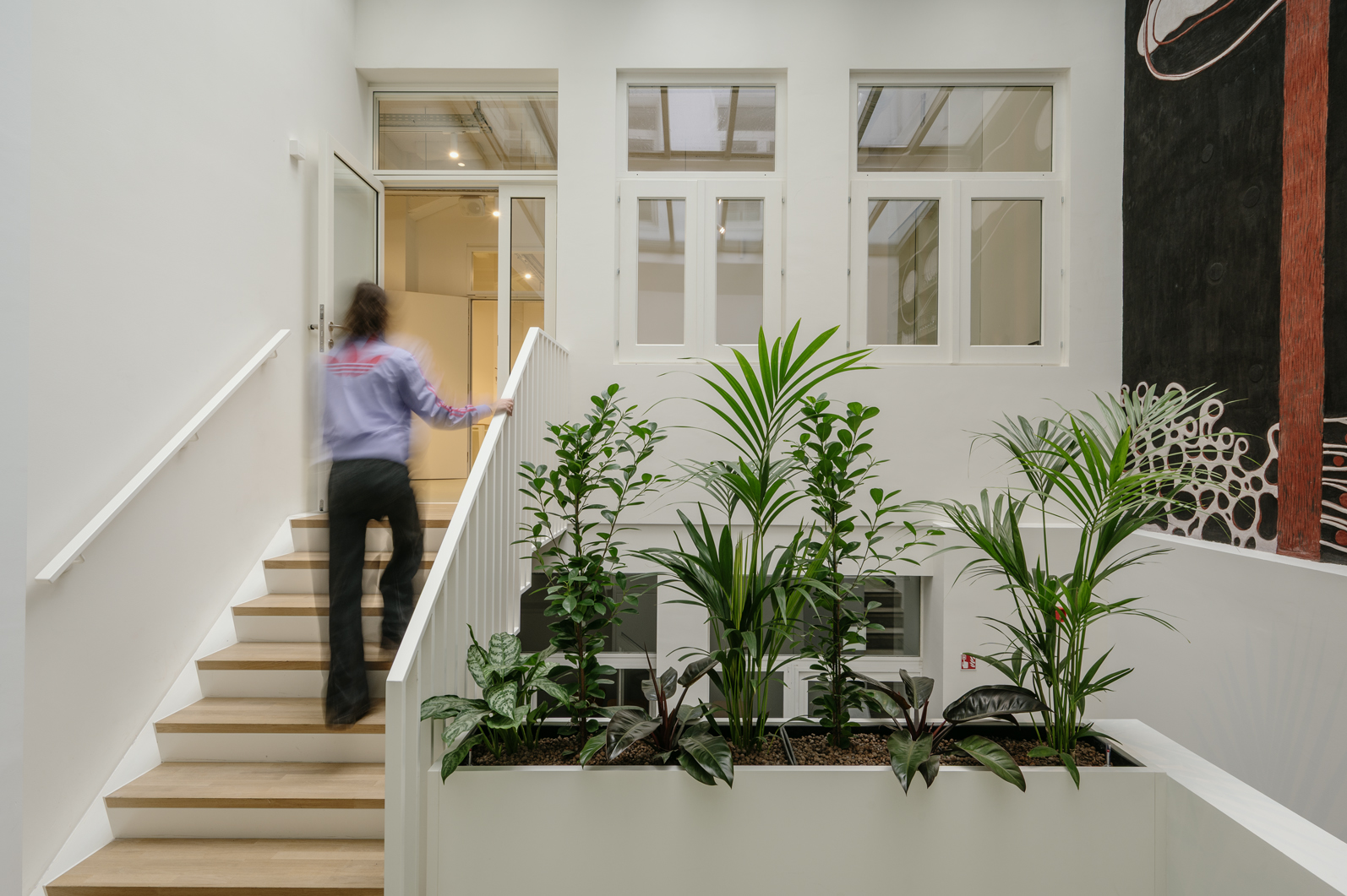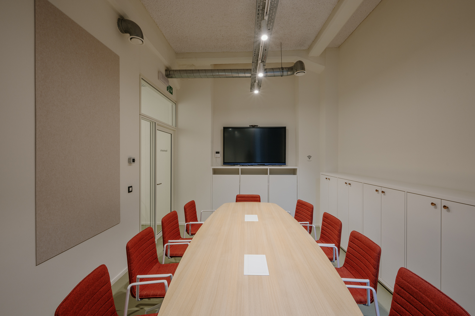 De belangrijkste uitdaging bestond erin om het kantoor efficiënter te organiseren en drie verdiepingen te herleiden tot twee, zonder in te boeten aan kwaliteit en gebruikscomfort. Dit werd opgelost via een doordachte herinrichting met een grotere densiteit én een gevarieerd aanbod aan werkplekken (open werkplekken, focusruimtes, vergaderzones). Tegelijk werd ingezet op een toekomstgericht en circulair gebouw: een passief geïsoleerde schil, performante technische uitrusting en demonteerbare materialen. Alle technieken blijven zichtbaar en aanpasbaar. Binnenwanden zijn volledig demonteerbaar en niet structureel, wat maximale flexibiliteit garandeert. Bijkomend werd het gebrek aan daglicht op de onderste verdieping opgelost door de introductie van een patio met natuurlijk licht en lucht.