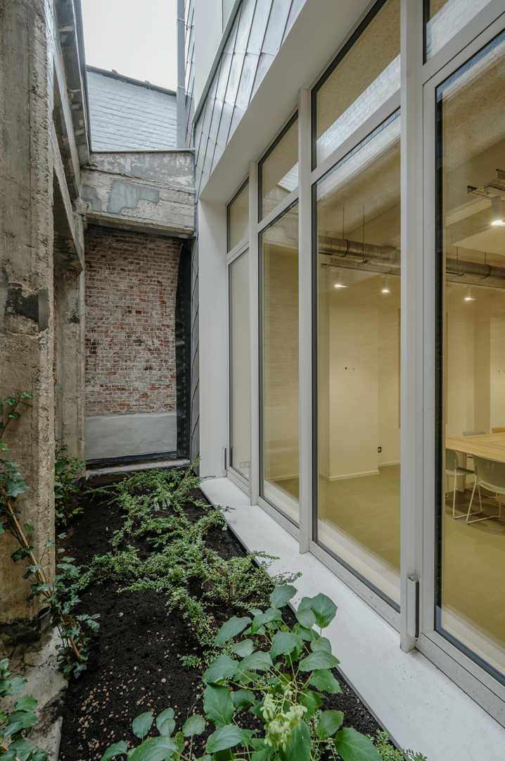 Dit project verdient een Architectura-award door zijn integrale en toekomstgerichte benadering van renovatie. Het combineert een doorgedreven circulaire strategie – met demonteerbare wanden, herbruikbare materialen en zichtbare, aanpasbare technieken – met hoge energetische prestaties volgens passiefprincipes. De slimme herorganisatie reduceert het ruimtegebruik van drie naar twee verdiepingen en introduceert een rijke variatie aan werkplekken die hedendaagse en toekomstige werkvormen ondersteunen. De ingreep versterkt bovendien daglicht, ruimtelijke kwaliteit en sociale interactie, onder meer via de introductie van een patio. Het project toont hoe bestaande gebouwen duurzaam, flexibel en architecturaal kwalitatief kunnen worden getransformeerd.