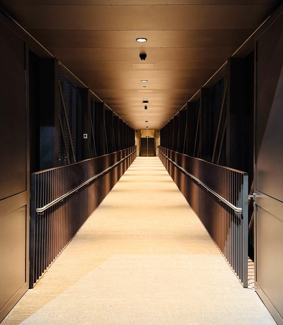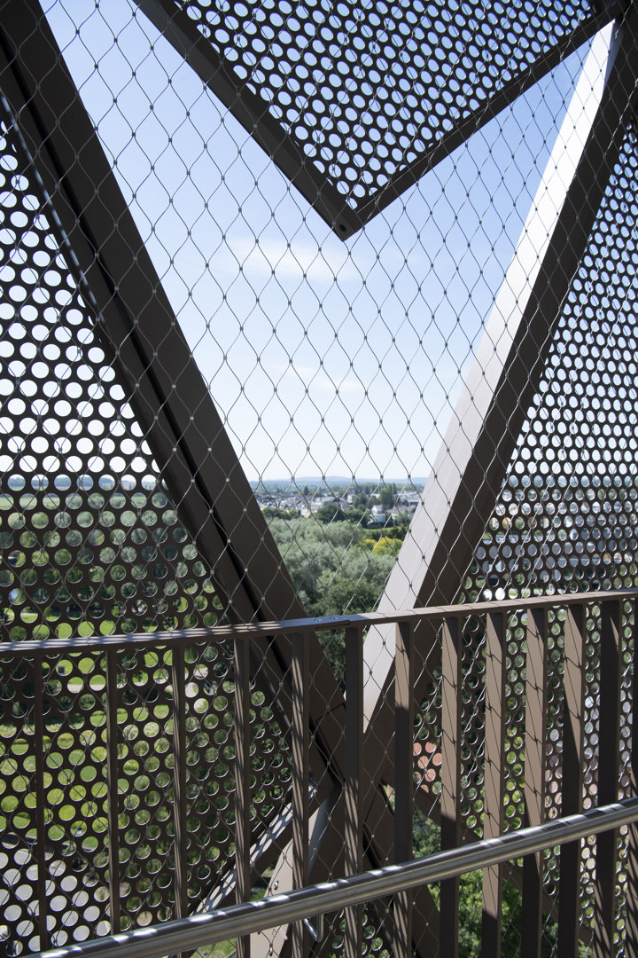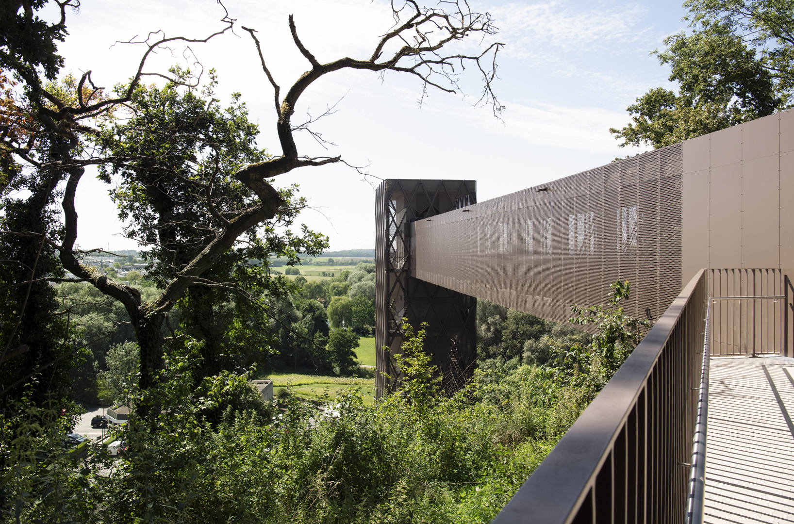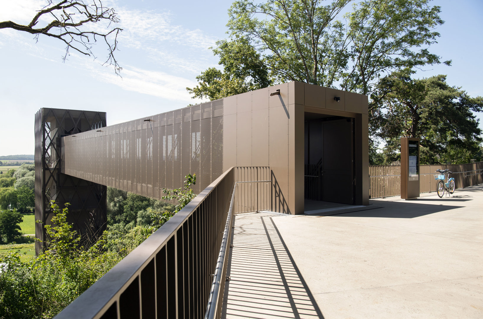 De belangrijkste uitdagingen bestonden uit het beheersen van de moeilijke topografie, het oversteken van een beschermd groengebied zonder bouwkundige interventie, evenals het positioneren van de loopbrug door de dichte bebossing. Om hieraan te voldoen, werd de metalen structuur van de loopbrug, met een lengte van bijna 40 m, in één stuk geprefabriceerd, ter plekke gebracht en met een speciale kraan door de bomen gehesen en op zijn twee steunen geplaatst, zonder schade aan het natuurlijke milieu.