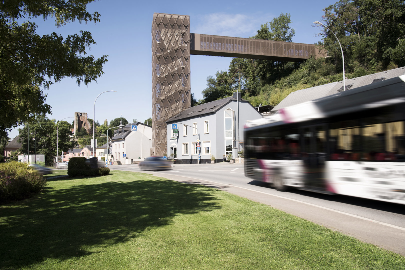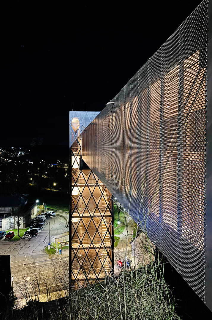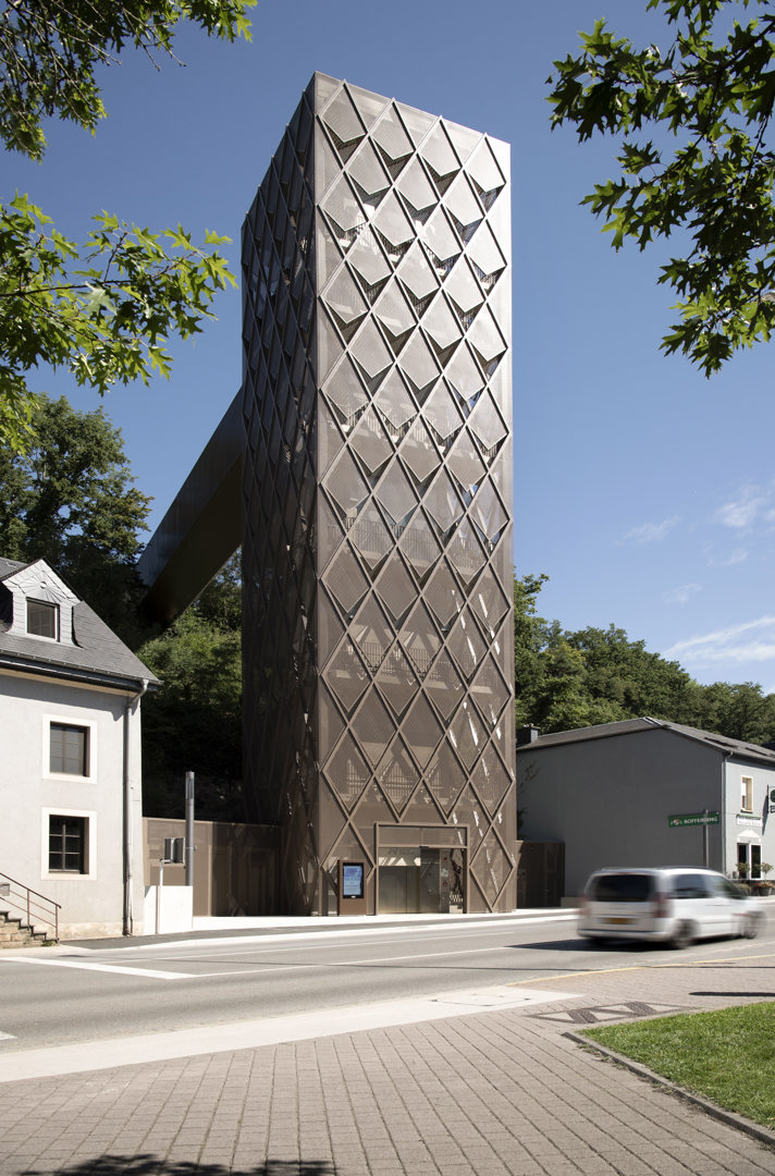 De lift van de Holleschbierg verenigt op opmerkelijke wijze architectuur, techniek en functionaliteit. Zijn heldere en identiteitsvolle architecturale taal komt tot uiting in het strakke zichtbare beton, de leesbare metalen constructie en de zorgvuldig ontworpen prefab gevelpanelen die precisie in uitvoering en kwaliteit van materialen combineren. De geperforeerde aluminium gevel biedt, zowel bij het stijgen als dalen, visuele spelletjes en transparanties van de omgeving. Dankzij een zorgvuldig uitgewerkt verlichtingsconcept wordt de toren, ook 's avonds, een markant baken. Tegelijkertijd draagt het project bij aan de duurzaamheid en revitalisatie van het centrum van Hesperange door zachte mobiliteit te faciliteren, wat het gebruik van de openbare ruimte verbetert.