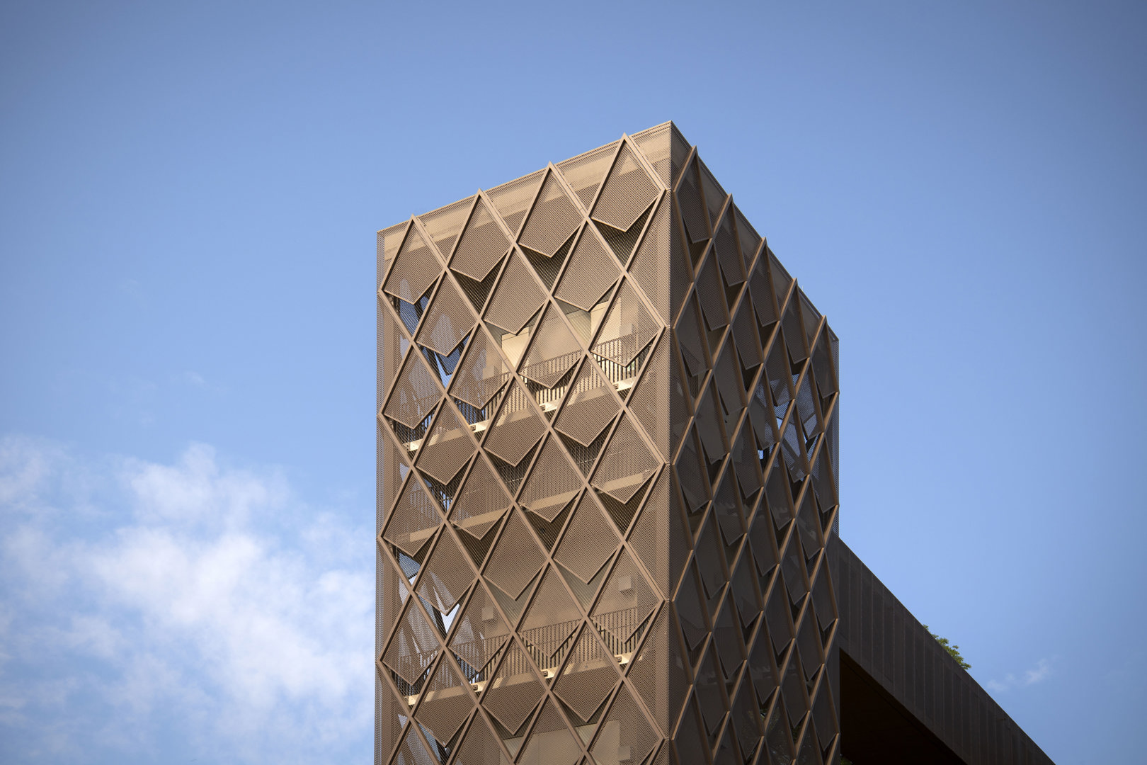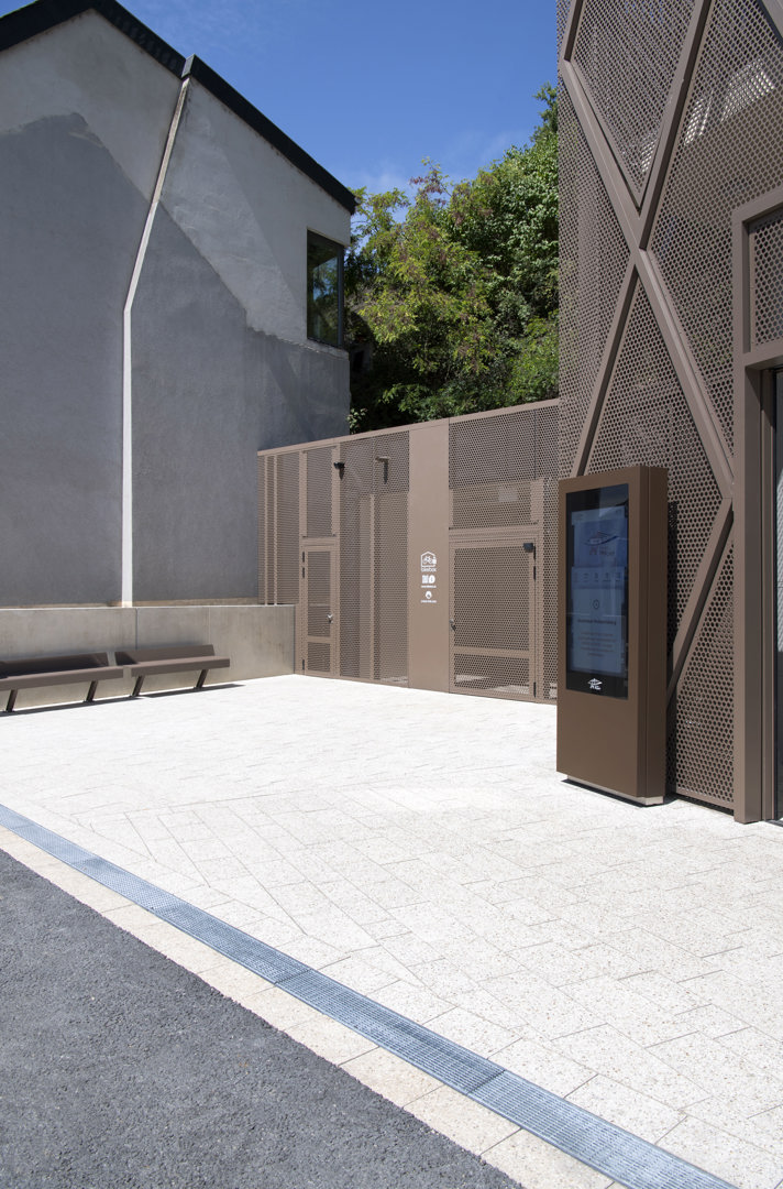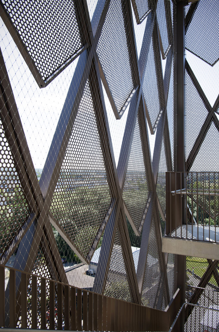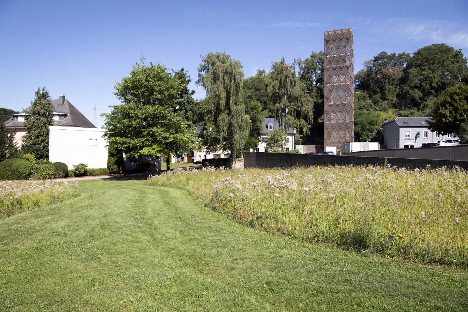 De lift van de Holleschbierg verenigt op opmerkelijke wijze architectuur, techniek en functionaliteit. Zijn heldere en identiteitsvolle architecturale taal komt tot uiting in het strakke zichtbare beton, de leesbare metalen constructie en de zorgvuldig ontworpen prefab gevelpanelen die precisie in uitvoering en kwaliteit van materialen combineren. De geperforeerde aluminium gevel biedt, zowel bij het stijgen als dalen, visuele spelletjes en transparanties van de omgeving. Dankzij een zorgvuldig uitgewerkt verlichtingsconcept wordt de toren, ook 's avonds, een markant baken. Tegelijkertijd draagt het project bij aan de duurzaamheid en revitalisatie van het centrum van Hesperange door zachte mobiliteit te faciliteren, wat het gebruik van de openbare ruimte verbetert.