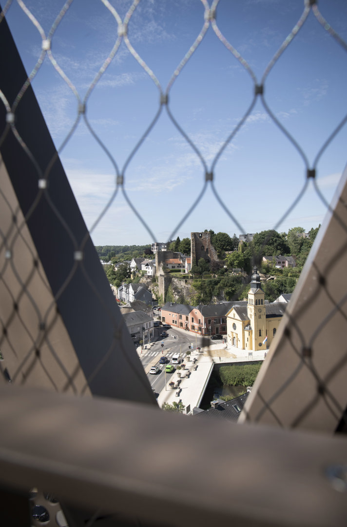 De loopbrug steekt de talud over zonder extra tussentijdse steunen, wat het behoud van de bestaande vegetatie mogelijk maakt. Het gebruik van regionaal staal en duurzame materialen zoals beton en aluminium garandeert een lange levensduur. Het gebruik van recyclebaar aluminium spaart middelen dankzij een mogelijke hergebruik. Prefabricage en volledig geschroefde assemblages verminderen het materiaalverbruik en maken eventuele latere aanpassingen mogelijk. De bevordering van zachte mobiliteit benadrukt tevens het duurzame karakter van het project. In het kader van de ontwikkeling van het centrum naar een Shared Space, draagt de lift van de Holleschbierg bij aan het verminderen van gemotoriseerd verkeer in het centrum en aan het vereenvoudigen van verbindingen voor voetgangers en fietsers.