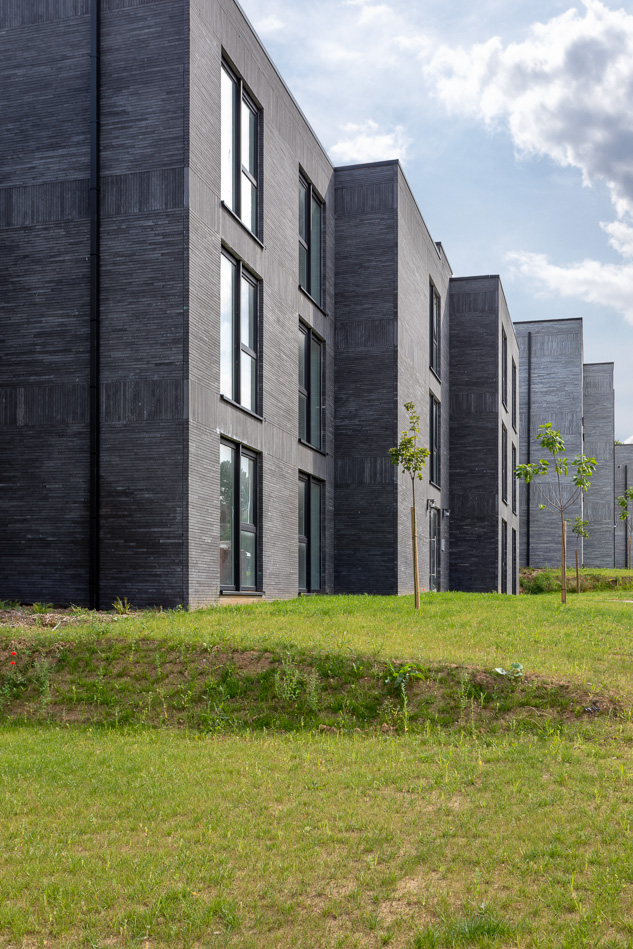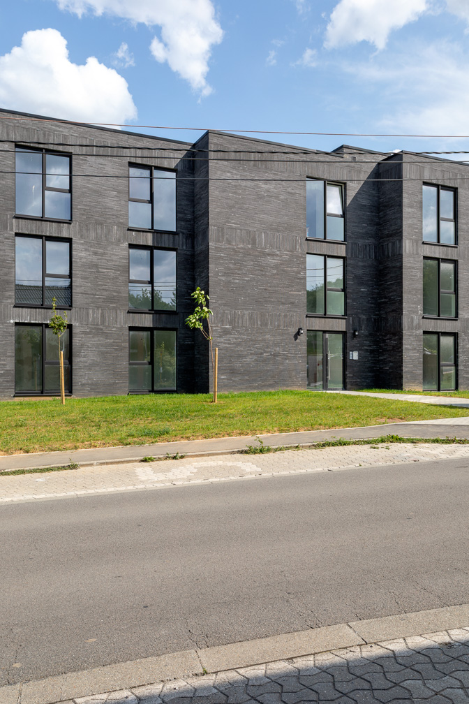 De grootste uitdaging bestond erin deze wijk in Marcinelle te verdichten zonder het uitzicht op het Bois du Prince en het Bois du Casier te belemmeren. Om deze openheid te behouden, hebben we afgezien van een monolithisch blok en gekozen voor drie afzonderlijke volumes. De architectuur volgt de natuurlijke helling van 5 % en past haar afmetingen aan voor een vloeiende overgang. We hebben de landschappelijke uitdaging aangepakt met het concept van het ‘geleende landschap’, waarbij we de bosvegetatie tot aan de straat hebben doorgetrokken met inheemse soorten en een groene greppel. Ten slotte maakt de ondergrondse parkeergarage ruimte vrij aan de oppervlakte, wat zorgt voor een leefomgeving waar dichtheid en openheid samengaan om de semi-open identiteit van de locatie te respecteren.