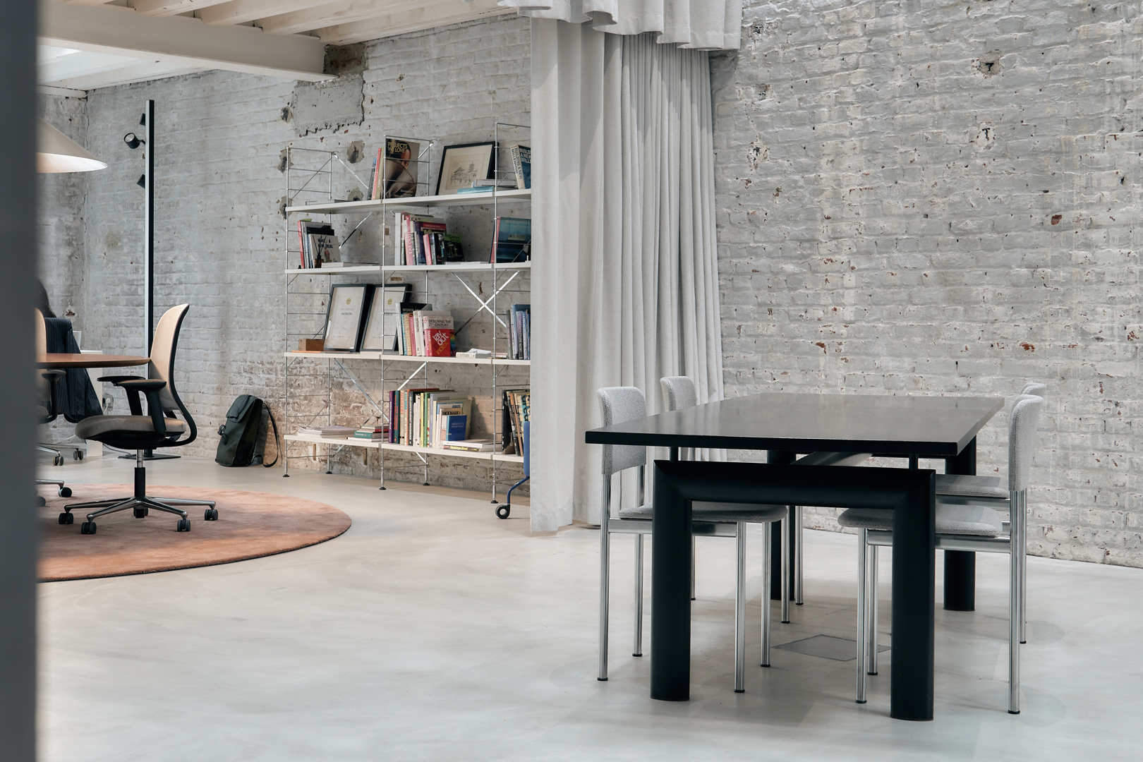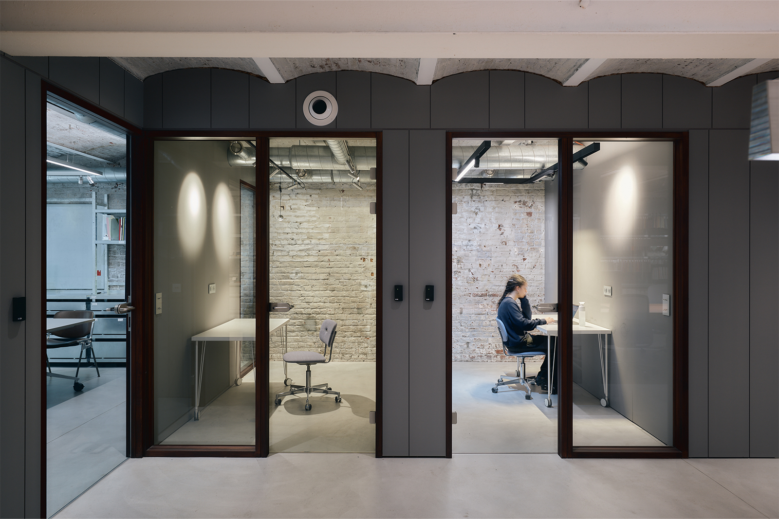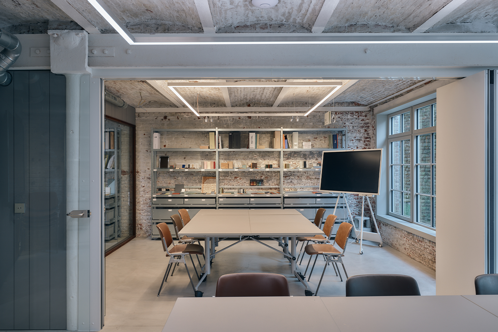De uitdaging was het creëren van een ultra-professionele omgeving via drie functies. 1. Technische expertise: modulaire expositiemodules onder hoogwaardige verlichting (CRI 98+). 2. Comfort: de coworking geeft voorrang aan ergonomie via diverse werkposten en sferen. 3. Scenografische modulariteit: de evenementenruimte wordt gedefinieerd door een monumentaal textiel omhulsel: mobiele gordijnen die fungeren als soepele wanden en het volume transformeren naargelang het gebruik. Dit systeem zorgt voor een verstilde akoestiek en een boeiend contrast met het ruwe beton. Het geheugen van de plek — met getint schrijnwerk en originele bakstenen die door de gepatineerde verf zichtbaar blijven — gaat in dialoog met een neutraal grijs palet voor een zuivere waarneming.