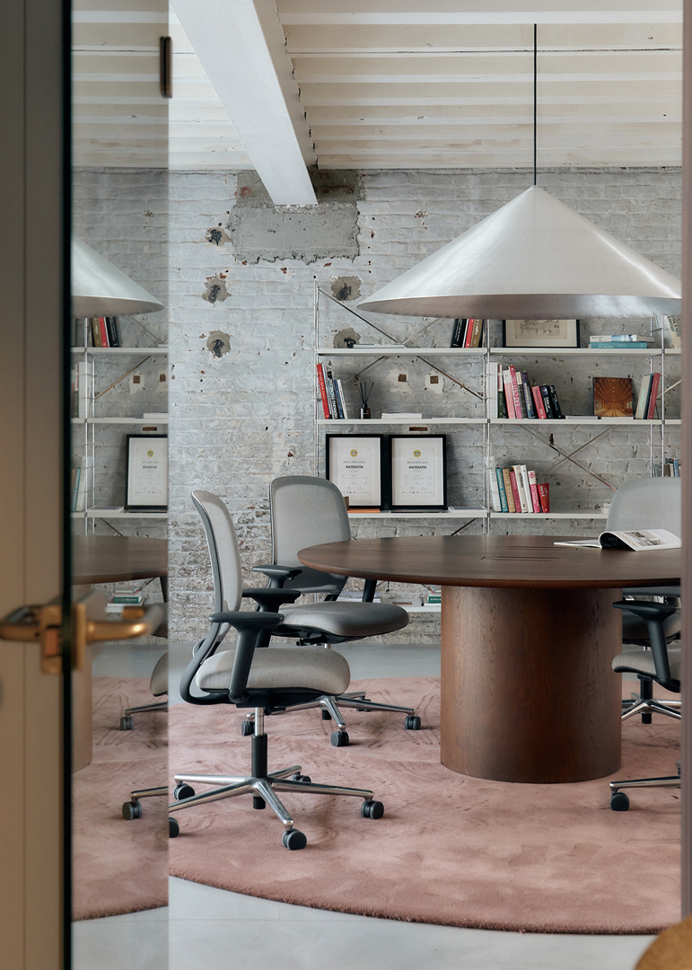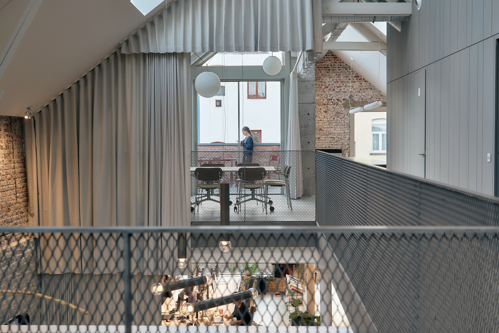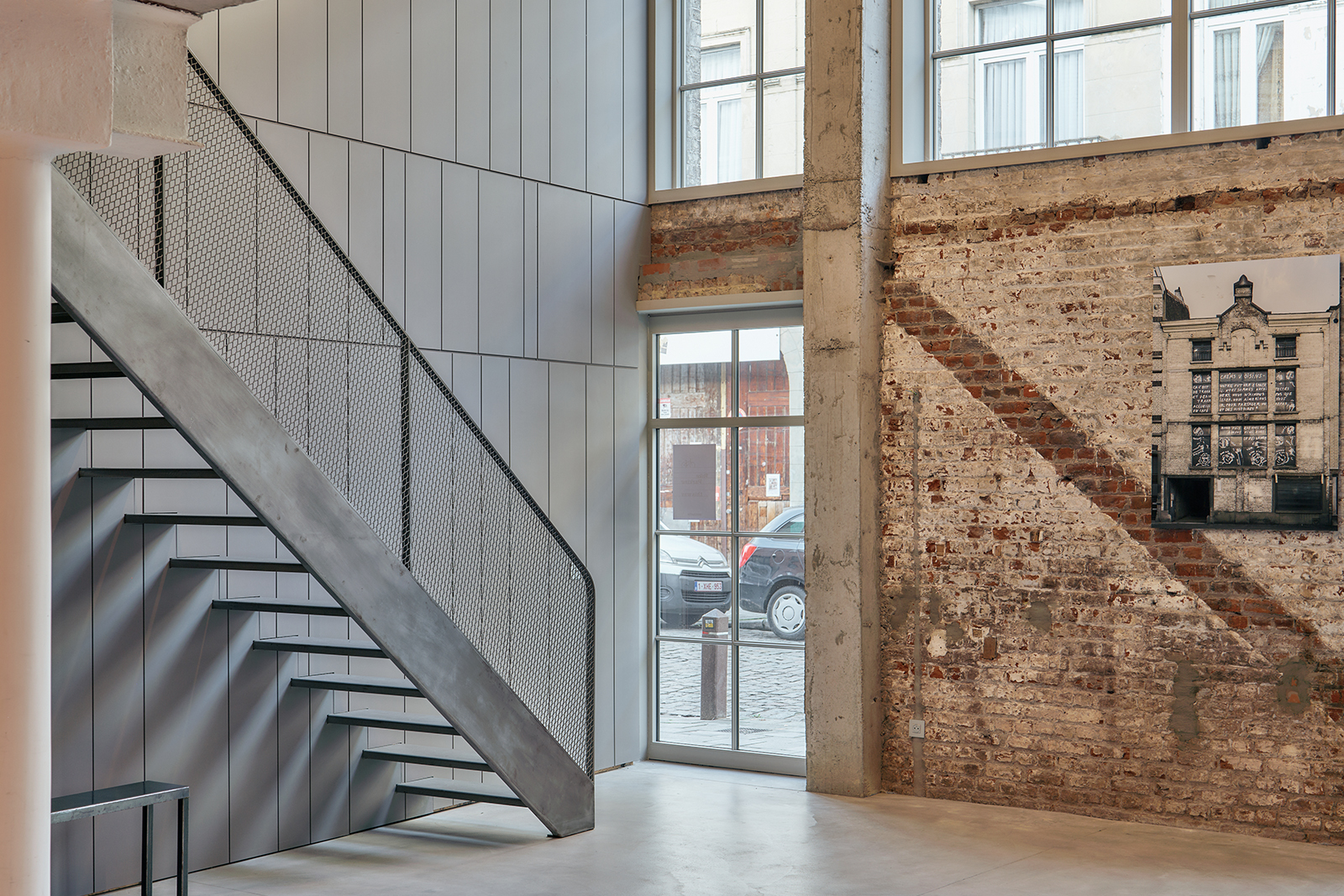 De eerste uitdaging was licht: we offerden 10% van de oppervlakte op voor drie strategische doorbraken (dubbele hoogte op het gelijkvloers, een vide op de 2e verdieping en een terras op de 3e). De tweede uitdaging was het combineren van opslag, expositie en werk binnen een beperkte oppervlakte. We beantwoordden dit met een ruimtelijk systeem rond een centrale as, die de circulatie en het programma organiseert voor een intuïtieve navigatie en efficiënt ruimtegebruik. Ten slotte creëerden we een identiteit die het industriële karakter viert via technische neutraliteit. Deze visie zet stalen en bewoners centraal zonder een dominante stijl op te leggen. De discrete integratie van technieken (energie/ventilatie) wijkt voor de structuur, zodat de brute materialiteit van de plek kan spreken.