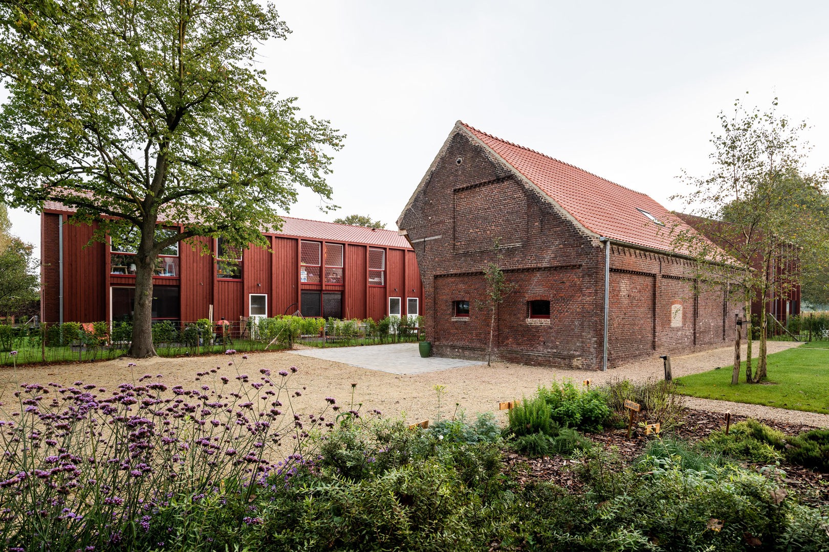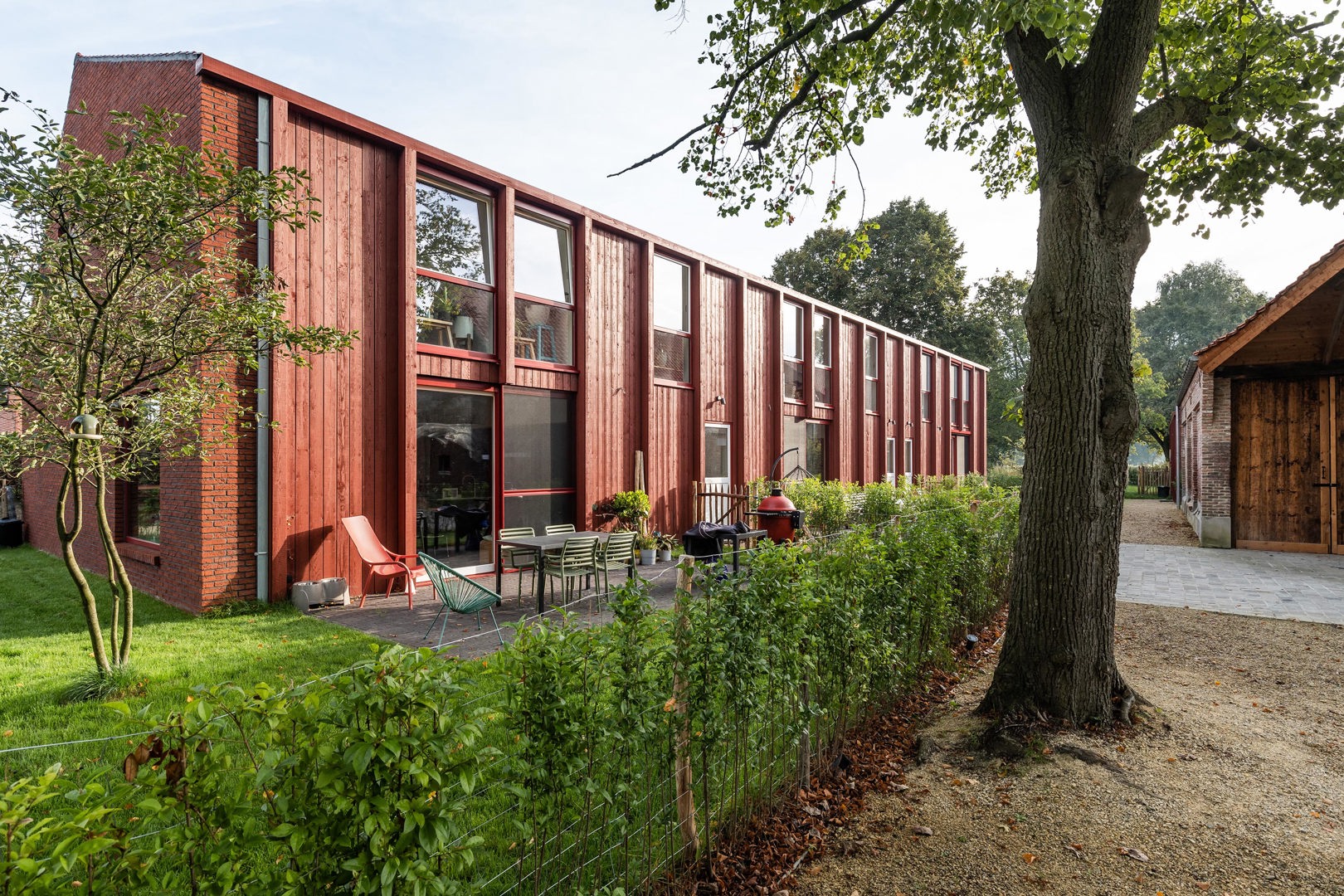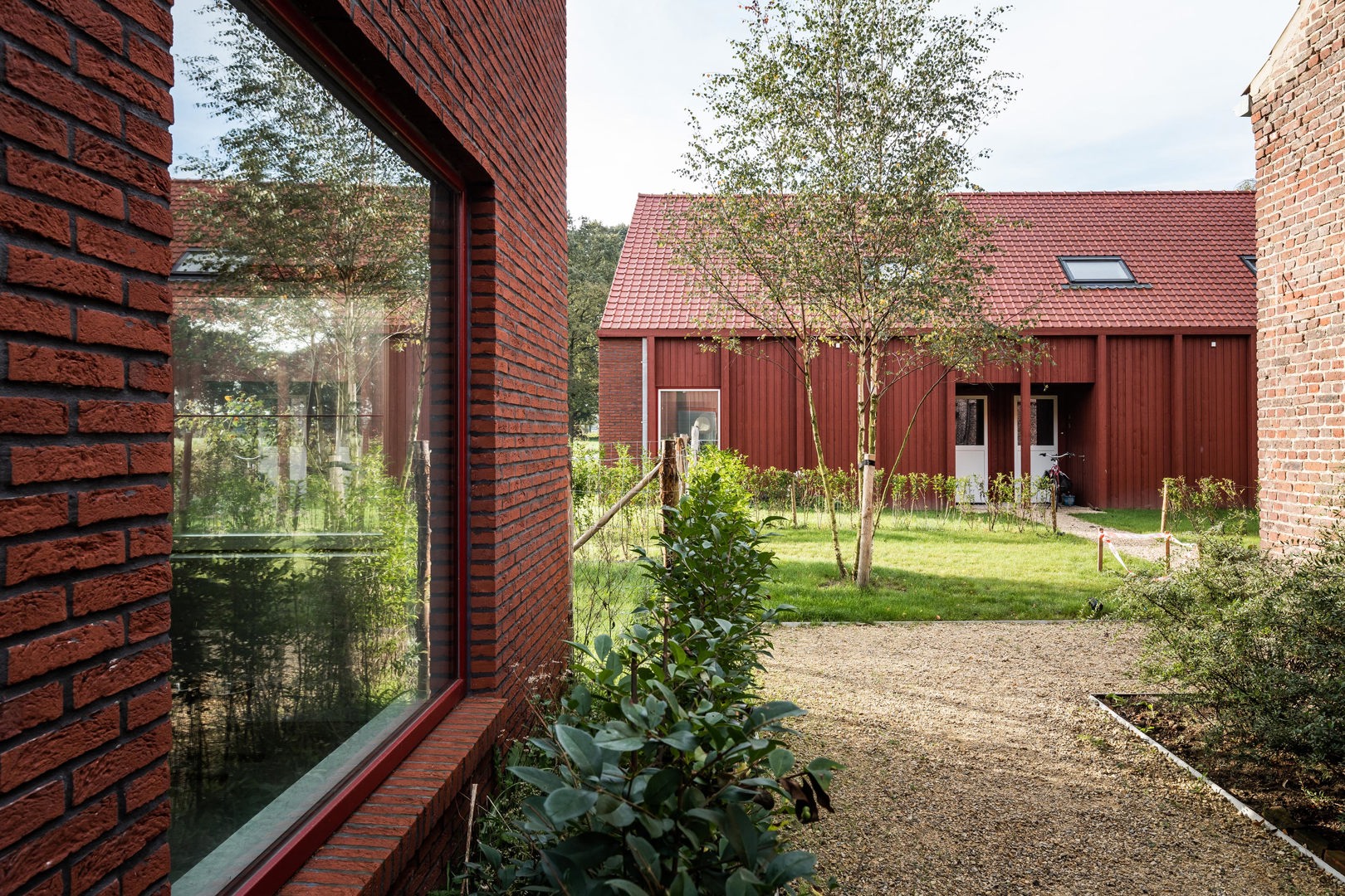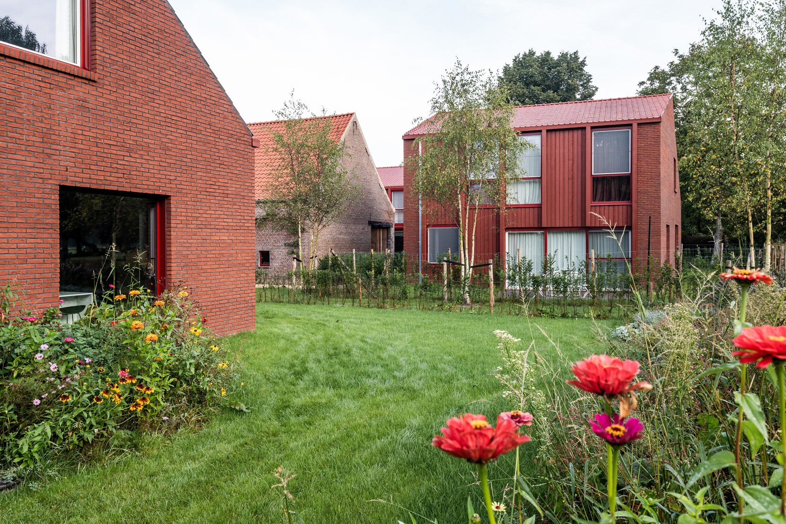 De ontwerpopdracht was een voormalige Kempische schuursite te transformeren tot een collectief woonproject dat privacy, ontmoeting en duurzame woonkwaliteit combineert. De nieuwe volumes zijn parallel geplaatst aan de bestaande schuur, haaks op de straat, waardoor doorzicht naar het landschap ontstaat en de zonoriëntatie optimaal wordt. Autoverkeer wordt beperkt tot de noordelijke toegang, met overdekte parkeerzones geïntegreerd. Wonen gebeurt rond een gemeenschappelijke buitenruimte met kruidentuin, speeltuin, zwemvijver en buurtschuur, waar bewoners samenkomen, werken en gasten ontvangen. Privaat en collectief vloeien in elkaar over, met minimale verharding en zachte groene scheidingen.