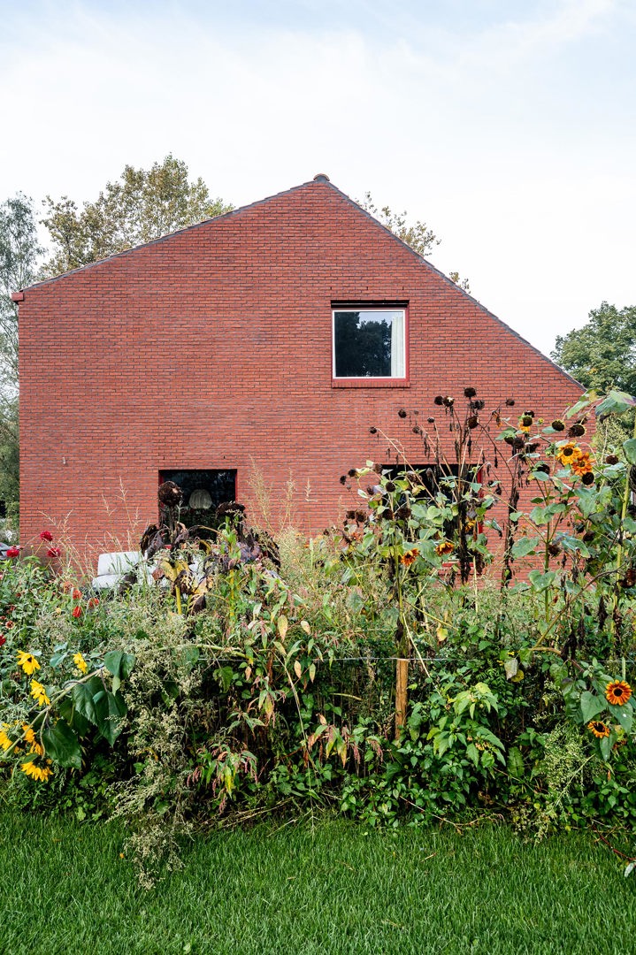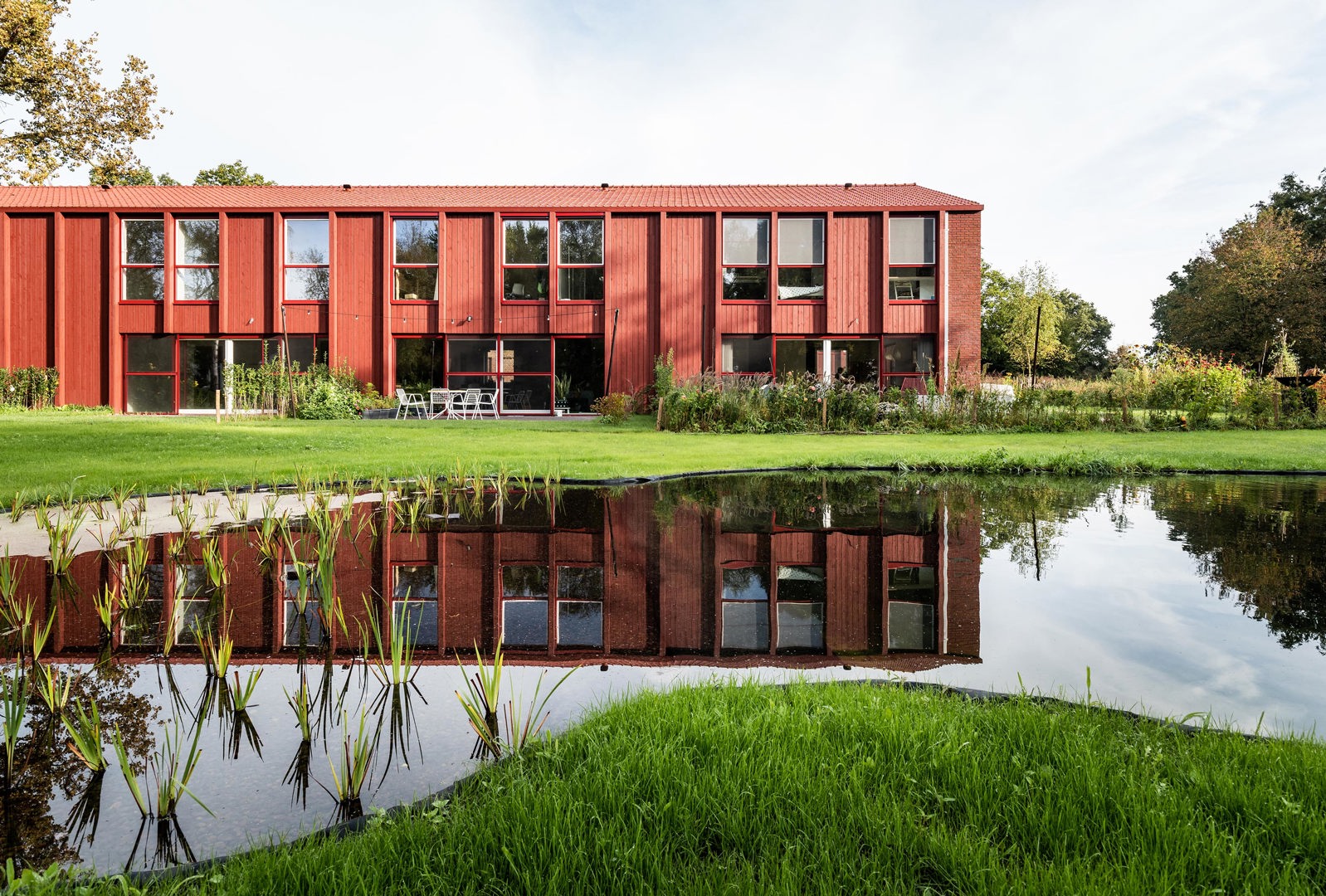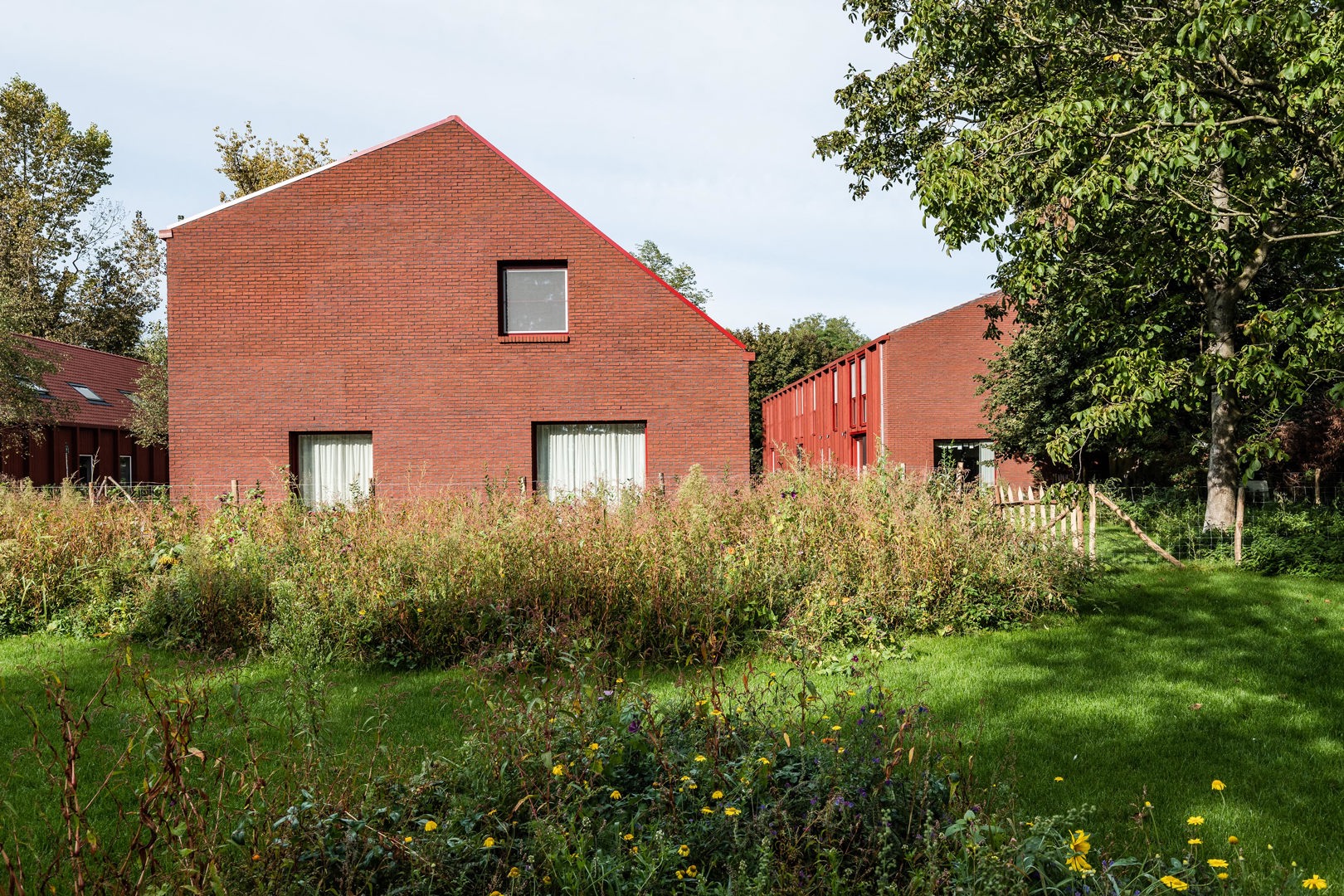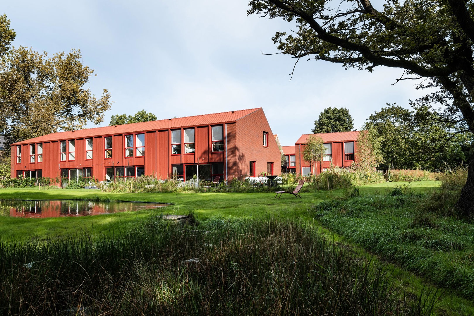 De ontwerpopdracht was een voormalige Kempische schuursite te transformeren tot een collectief woonproject dat privacy, ontmoeting en duurzame woonkwaliteit combineert. De nieuwe volumes zijn parallel geplaatst aan de bestaande schuur, haaks op de straat, waardoor doorzicht naar het landschap ontstaat en de zonoriëntatie optimaal wordt. Autoverkeer wordt beperkt tot de noordelijke toegang, met overdekte parkeerzones geïntegreerd. Wonen gebeurt rond een gemeenschappelijke buitenruimte met kruidentuin, speeltuin, zwemvijver en buurtschuur, waar bewoners samenkomen, werken en gasten ontvangen. Privaat en collectief vloeien in elkaar over, met minimale verharding en zachte groene scheidingen.