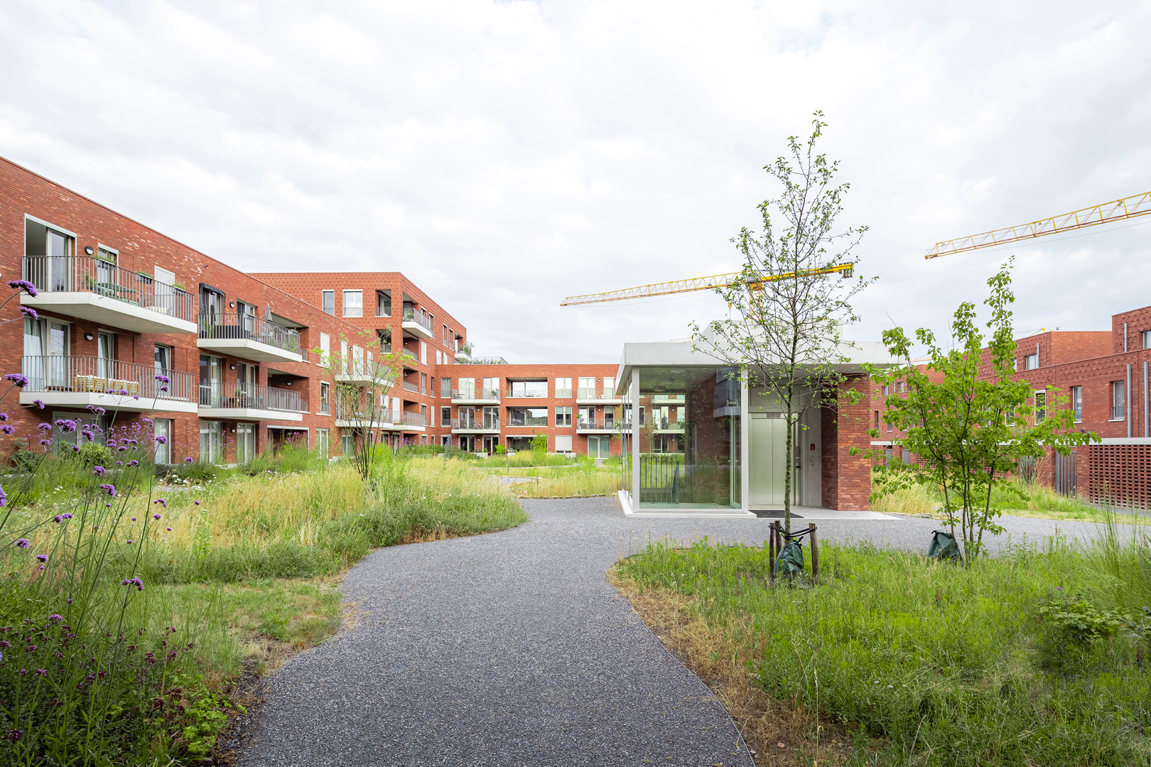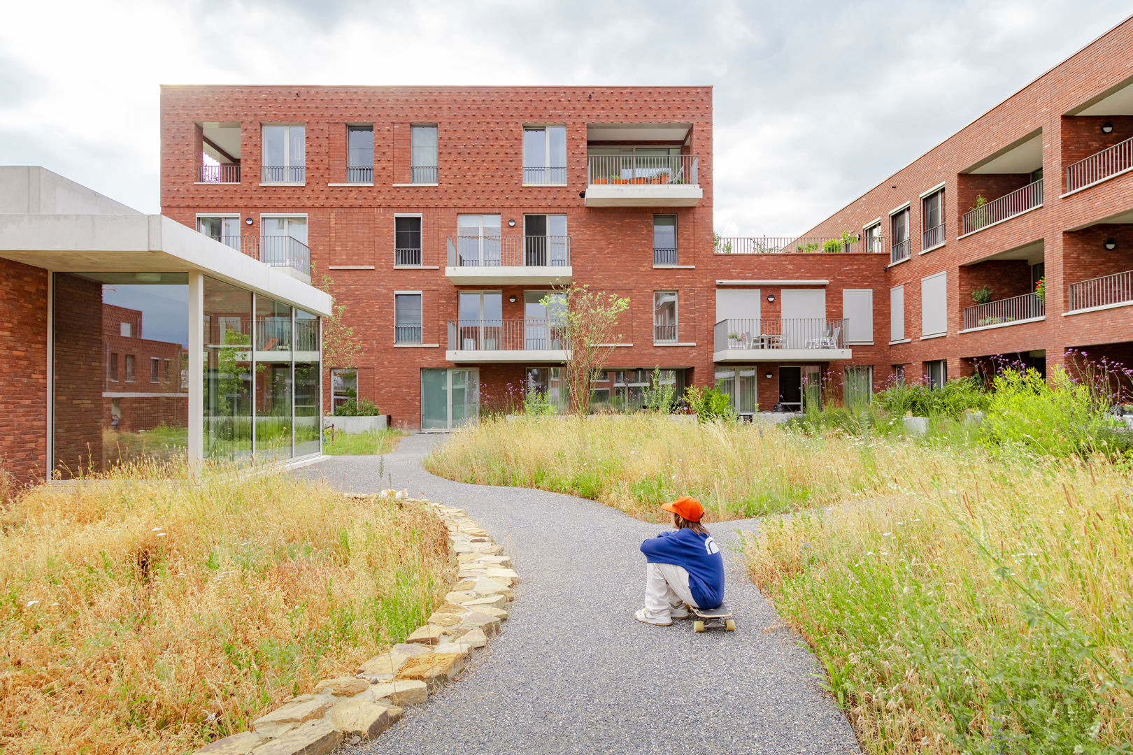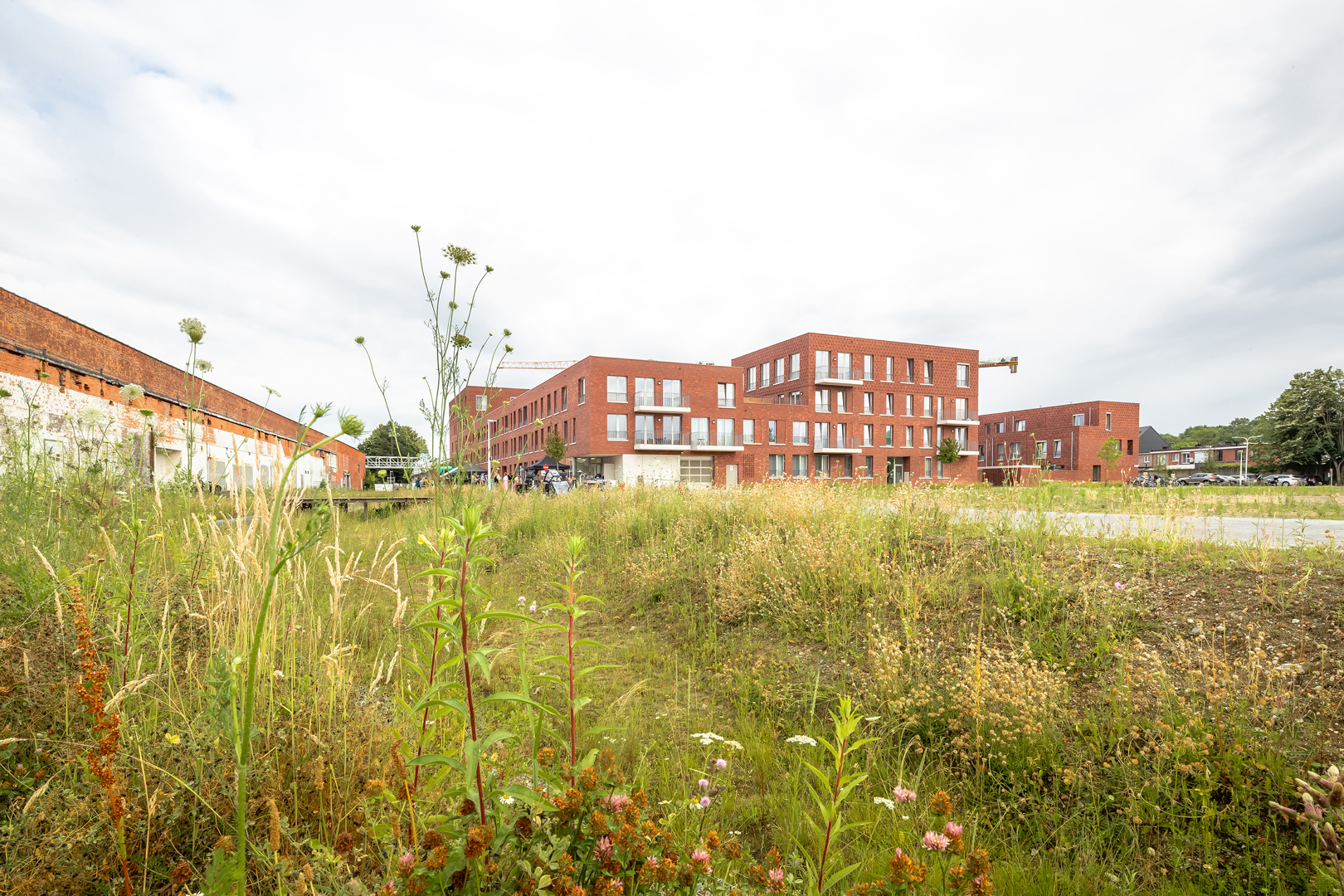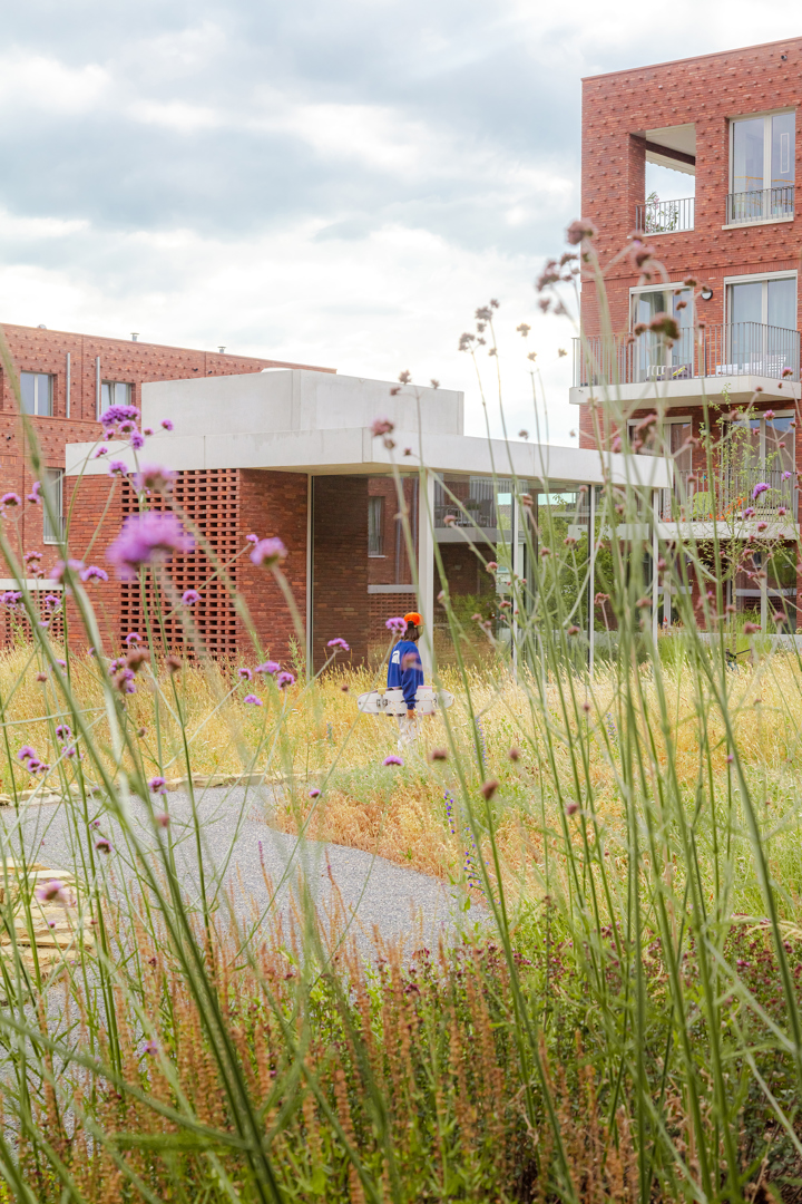 Minerve zet in op een toekomstgerichte en integrale duurzaamheidsaanpak. Fossiele brandstoffen worden volledig geweerd via een warmtenet dat restwarmte van de naburige industriële vestiging van Agfa Gevaert benut. Pionierswerk, want dit warmtenet is slechts het tweede in België waar een private onderneming warmte levert aan een woonwijk. Regenwater wordt maximaal hergebruikt en geïnfiltreerd via landschappelijke wadi’s die tegelijk rust- en recreatieplekken vormen. Daarnaast werd ingezet op circulair bouwen: 58.000 stenen van de oude loodsen werden gerecupereerd, gekuist en hergebruikt. Het principe van ‘groeiwoning’ maakt compacte woningen toekomstbestendig en betaalbaar. Dat zijn woningen van twee bouwlagen waar alles voorzien is om er op termijn nog een derde bouwlaag aan toe te voegen