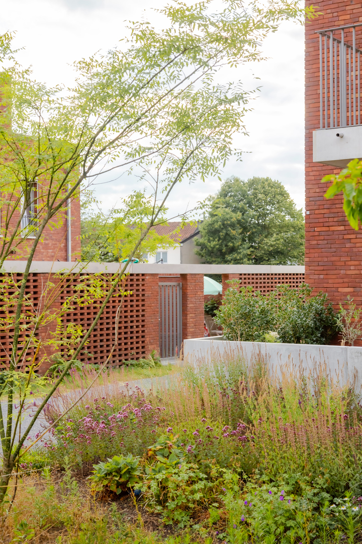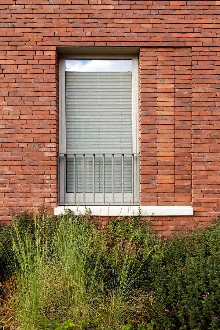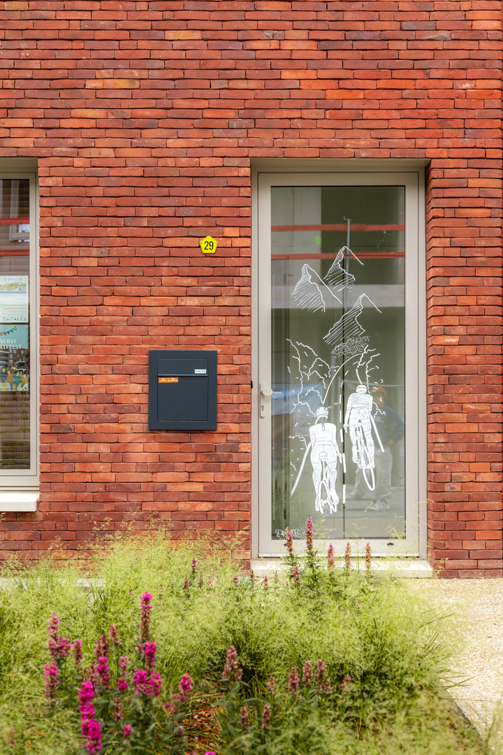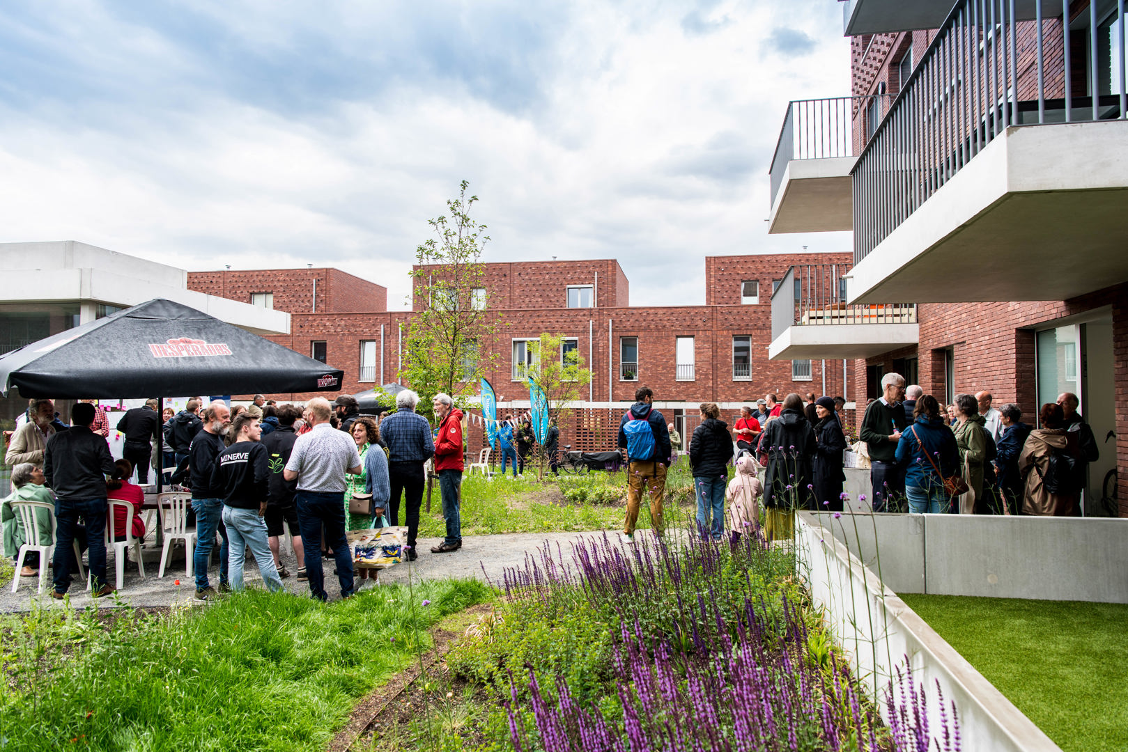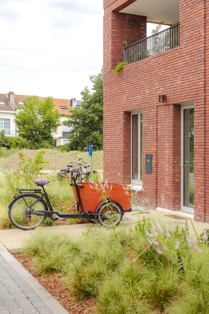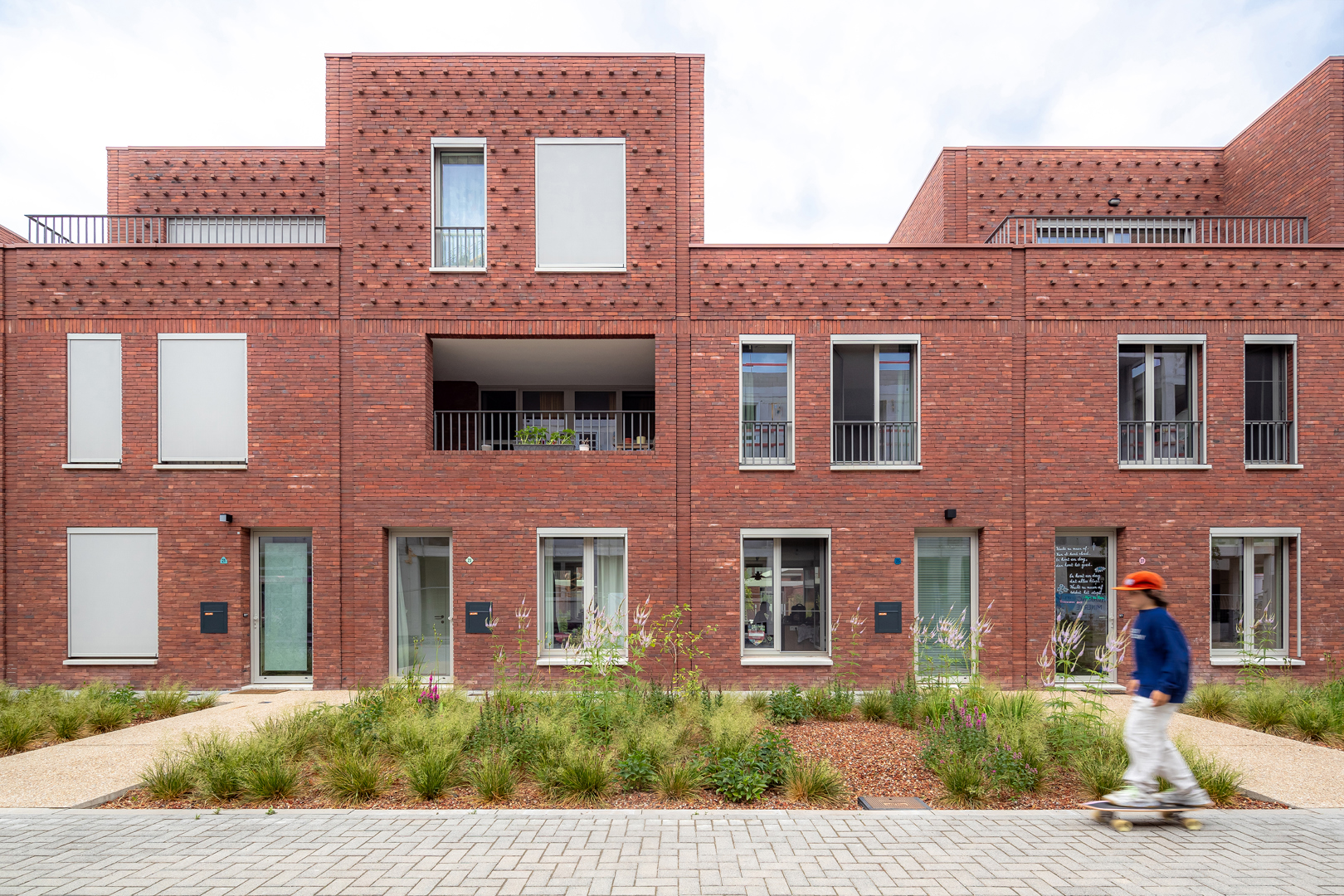 Minerve zet in op een toekomstgerichte en integrale duurzaamheidsaanpak. Fossiele brandstoffen worden volledig geweerd via een warmtenet dat restwarmte van de naburige industriële vestiging van Agfa Gevaert benut. Pionierswerk, want dit warmtenet is slechts het tweede in België waar een private onderneming warmte levert aan een woonwijk. Regenwater wordt maximaal hergebruikt en geïnfiltreerd via landschappelijke wadi’s die tegelijk rust- en recreatieplekken vormen. Daarnaast werd ingezet op circulair bouwen: 58.000 stenen van de oude loodsen werden gerecupereerd, gekuist en hergebruikt. Het principe van ‘groeiwoning’ maakt compacte woningen toekomstbestendig en betaalbaar. Dat zijn woningen van twee bouwlagen waar alles voorzien is om er op termijn nog een derde bouwlaag aan toe te voegen