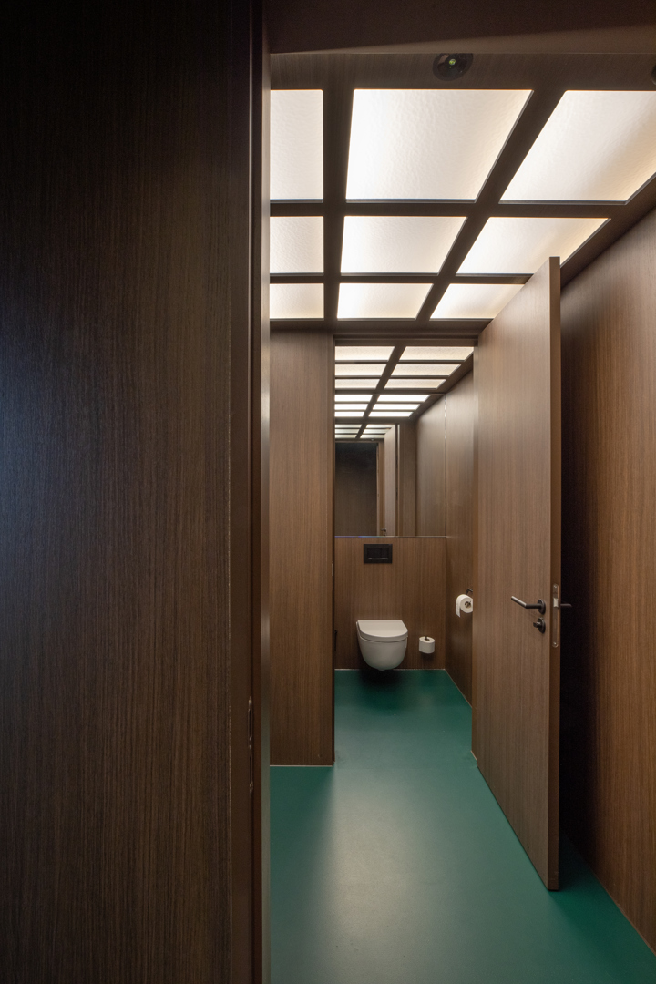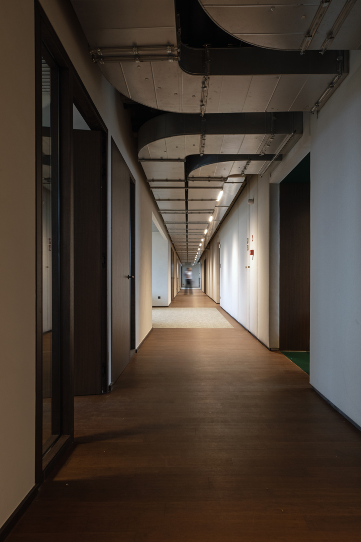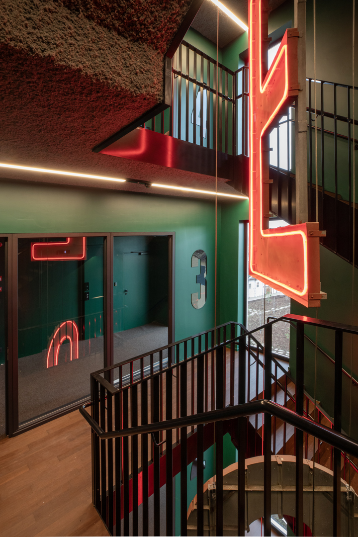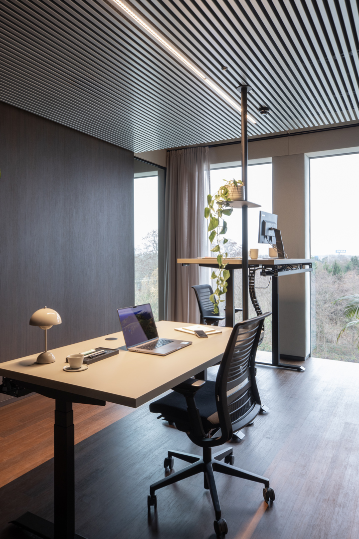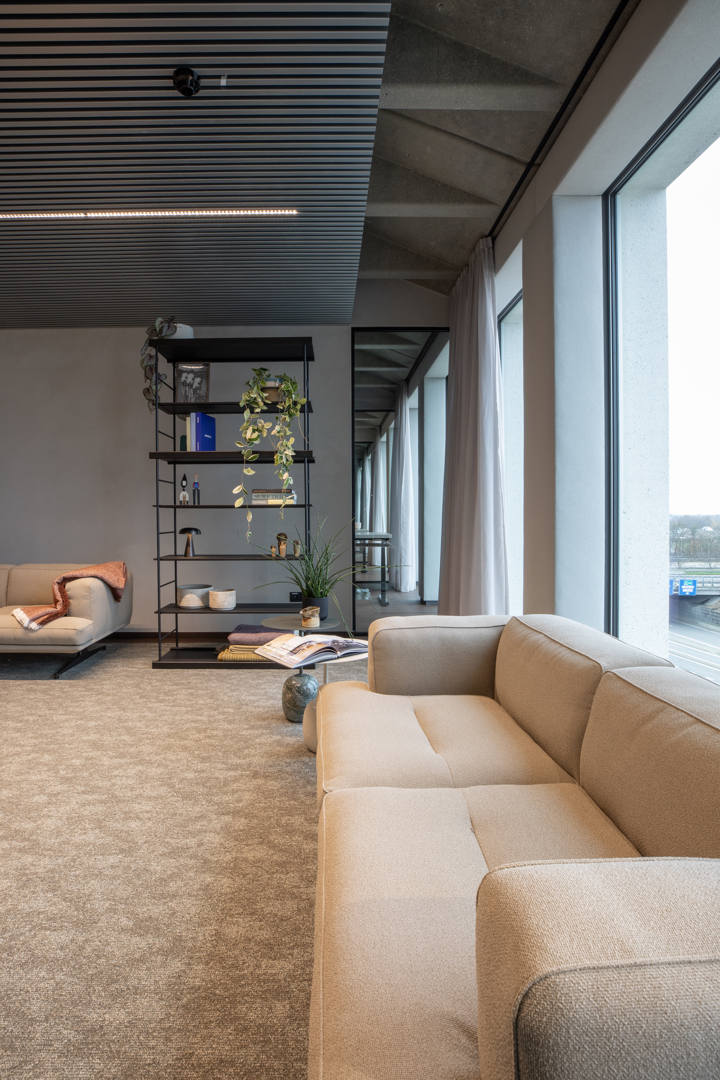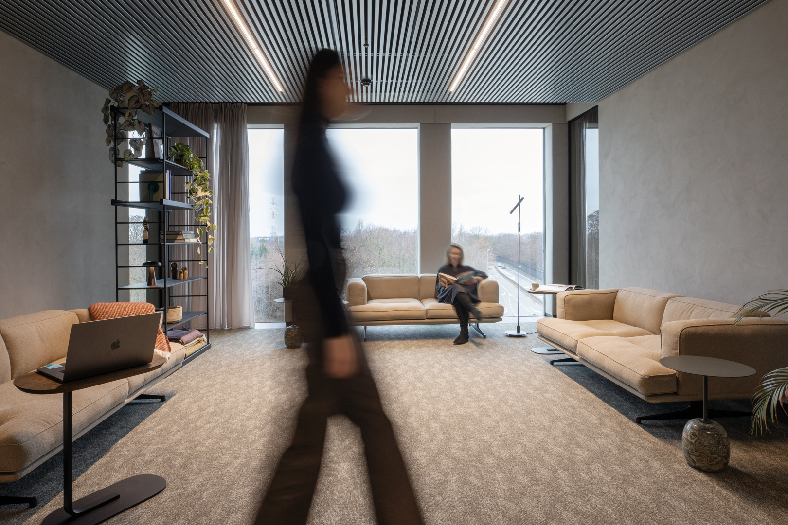 De grootste uitdaging was het onderbrengen van een hedendaags kantoorprogramma binnen de structuur van een bestaand en architecturaal uitgesproken gebouw. Daarbij moest een groot aantal individuele kantoren worden voorzien zonder verlies aan daglichtkwaliteit, ruimtelijkheid of akoestisch comfort. Door de bestaande draagstructuur als uitgangspunt te nemen, werd een efficiënte indeling ontwikkeld waarbij de kantoren langs de gevels liggen en de circulatie compact en logisch blijft. Tegelijk zorgt de verdeling van functies over verschillende niveaus voor een duidelijke hiërarchie tussen werkplekken en collectieve ruimtes.