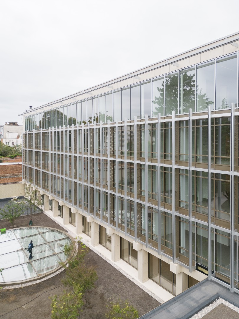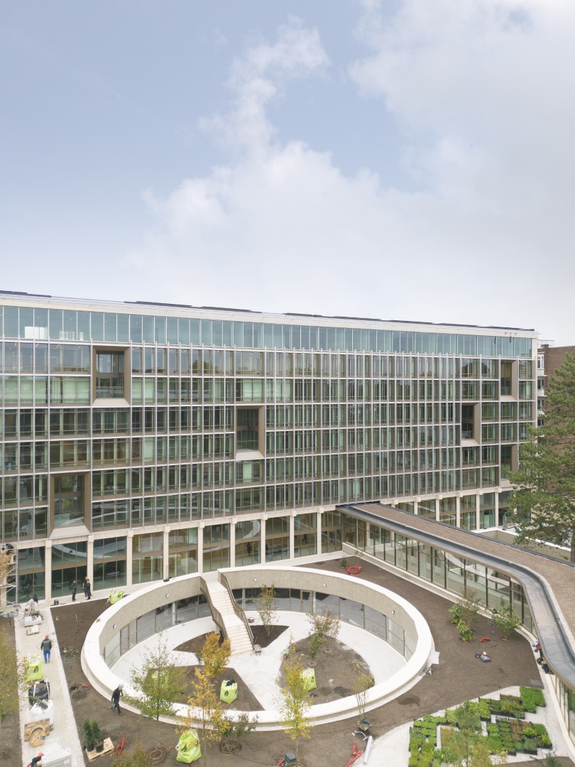 De opdracht bestond uit de transformatie van een iconisch jaren 70-kantorencomplex, voormalige kantoren Riziv, tot een duurzame en gezonde werkomgeving. Uitgangspunt was het behouden en versterken van de bestaande structuur, met ingrepen die flexibiliteit, comfort en circulariteit bevorderen. Onderbenutte ruimtes in de ondergrond kregen nieuwe functies zoals coworking, een fitness en een commerciële ruimte. De nieuwe, dubbelhoge transparante plint creëert een uitnodigend karakter en stimuleert interactie met de buurt. De relatie met de centrale tuin wordt hersteld, met aandacht voor daglicht en ruimtelijke beleving. In het hart van het project vormt een ontmoetingspaviljoen een centrale plek voor interactie, terwijl de geïntegreerde crèche bijdraagt aan het sociaal karakter van het project