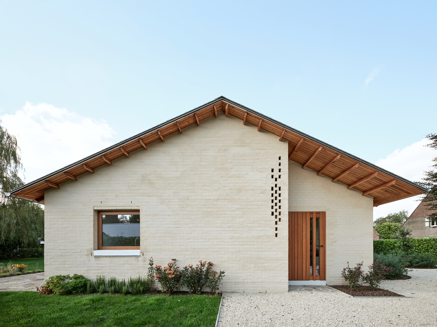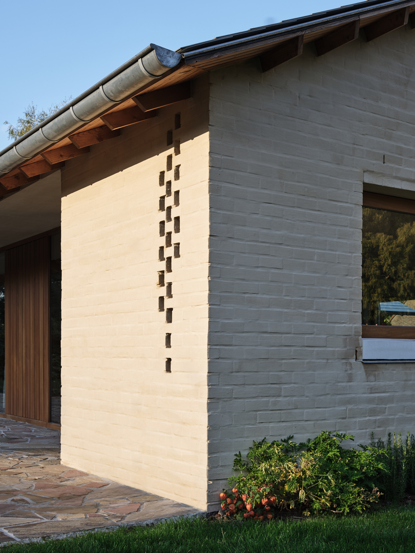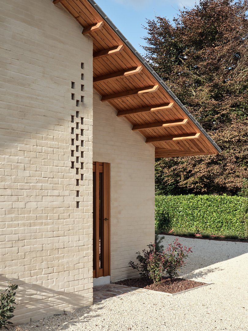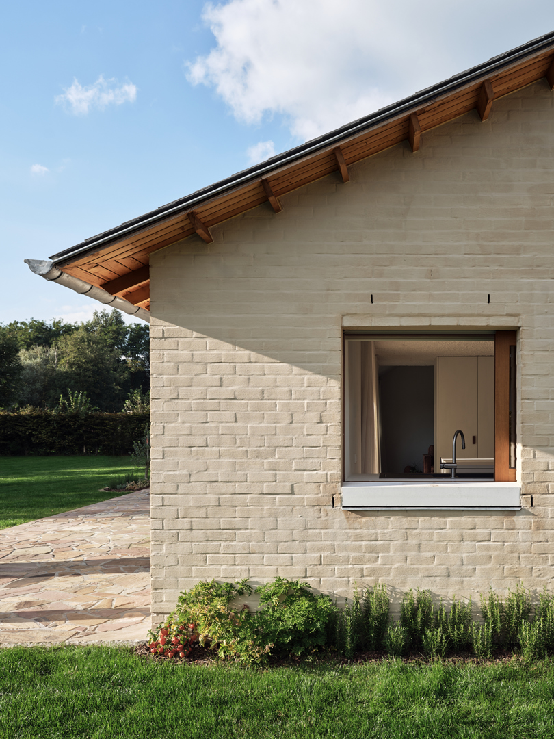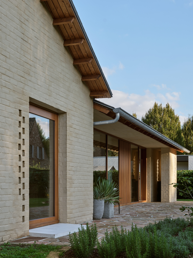 De grootste uitdaging was de uitgesproken horizontaliteit van de bungalow, die weinig variatie in ruimtebeleving toelaat. Dit werd opgelost via gerichte ingrepen op exterieur en interieur die elkaar versterken. De leefvleugel werd subtiel uitgebreid voor de keuken, raampartijen tot vloerniveau verlaagd voor een sterke tuinrelatie. Het plafond van de leefruimte werd opgetild tot in de nok, wat afwisseling in hoogte en openheid creëert. Compacte kernvolumes structureren het plan, terwijl dakramen en flexibel schrijnwerk zorgen voor licht, doorzichten en aanpasbaarheid.