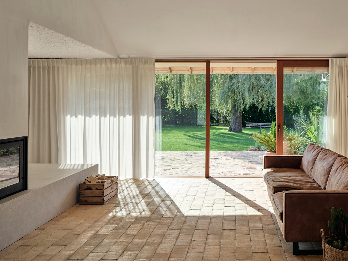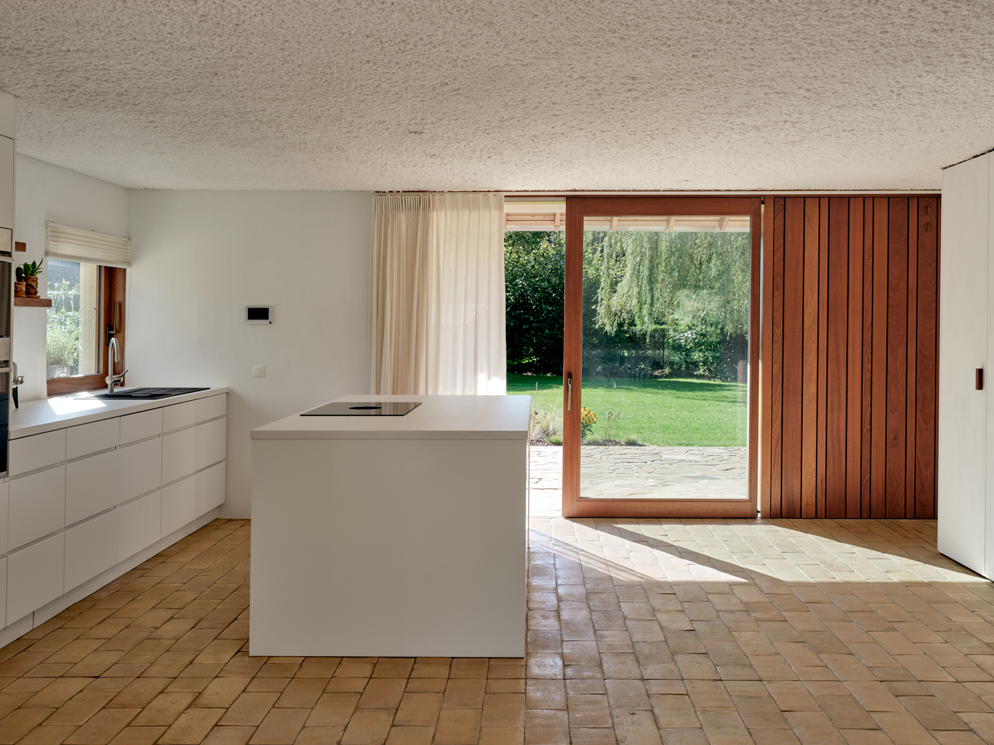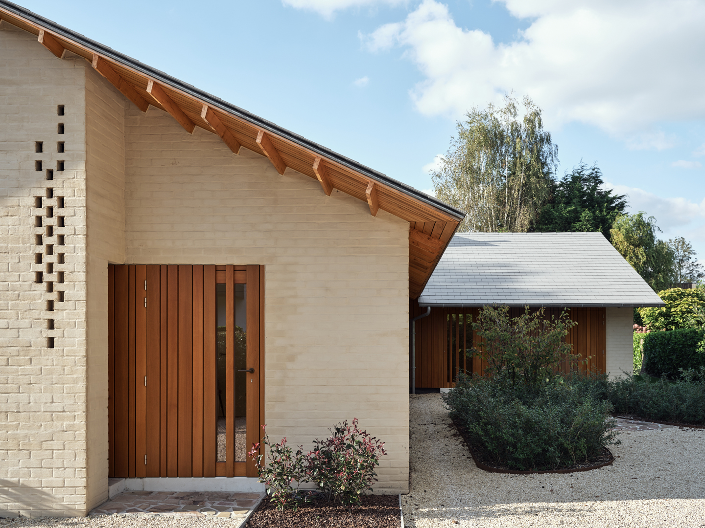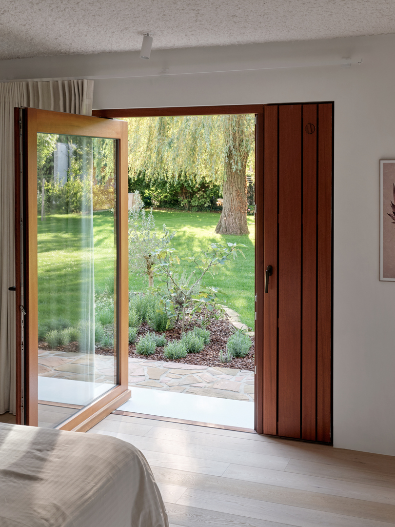 De grootste uitdaging was de uitgesproken horizontaliteit van de bungalow, die weinig variatie in ruimtebeleving toelaat. Dit werd opgelost via gerichte ingrepen op exterieur en interieur die elkaar versterken. De leefvleugel werd subtiel uitgebreid voor de keuken, raampartijen tot vloerniveau verlaagd voor een sterke tuinrelatie. Het plafond van de leefruimte werd opgetild tot in de nok, wat afwisseling in hoogte en openheid creëert. Compacte kernvolumes structureren het plan, terwijl dakramen en flexibel schrijnwerk zorgen voor licht, doorzichten en aanpasbaarheid.