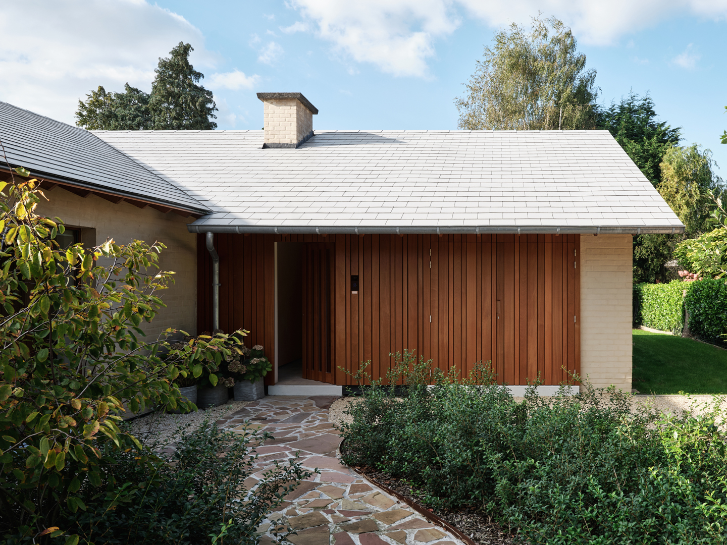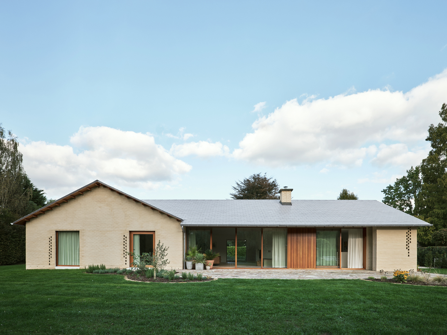 De ontwerpopdracht voor MUST vertrok vanuit de verbouwing van een bestaande bungalow uit de jaren zestig in een residentiële wijk ten oosten van Deinze. Het uitgangspunt was expliciet geen tabula rasa, maar een doordachte transformatie die de bestaande logica van de woning respecteert en tegelijk een nieuw ruimtelijk verhaal introduceert. De oorspronkelijke organisatie — met slaapvertrekken in de noordelijke vleugel en leefruimtes in de zuidelijke — bleef behouden. De ingreep richtte zich daarom niet op herprogrammatie, maar op het herdefiniëren van de ruimtelijke beleving, het versterken van de relatie met de tuin en het actualiseren van de architecturale expressie.