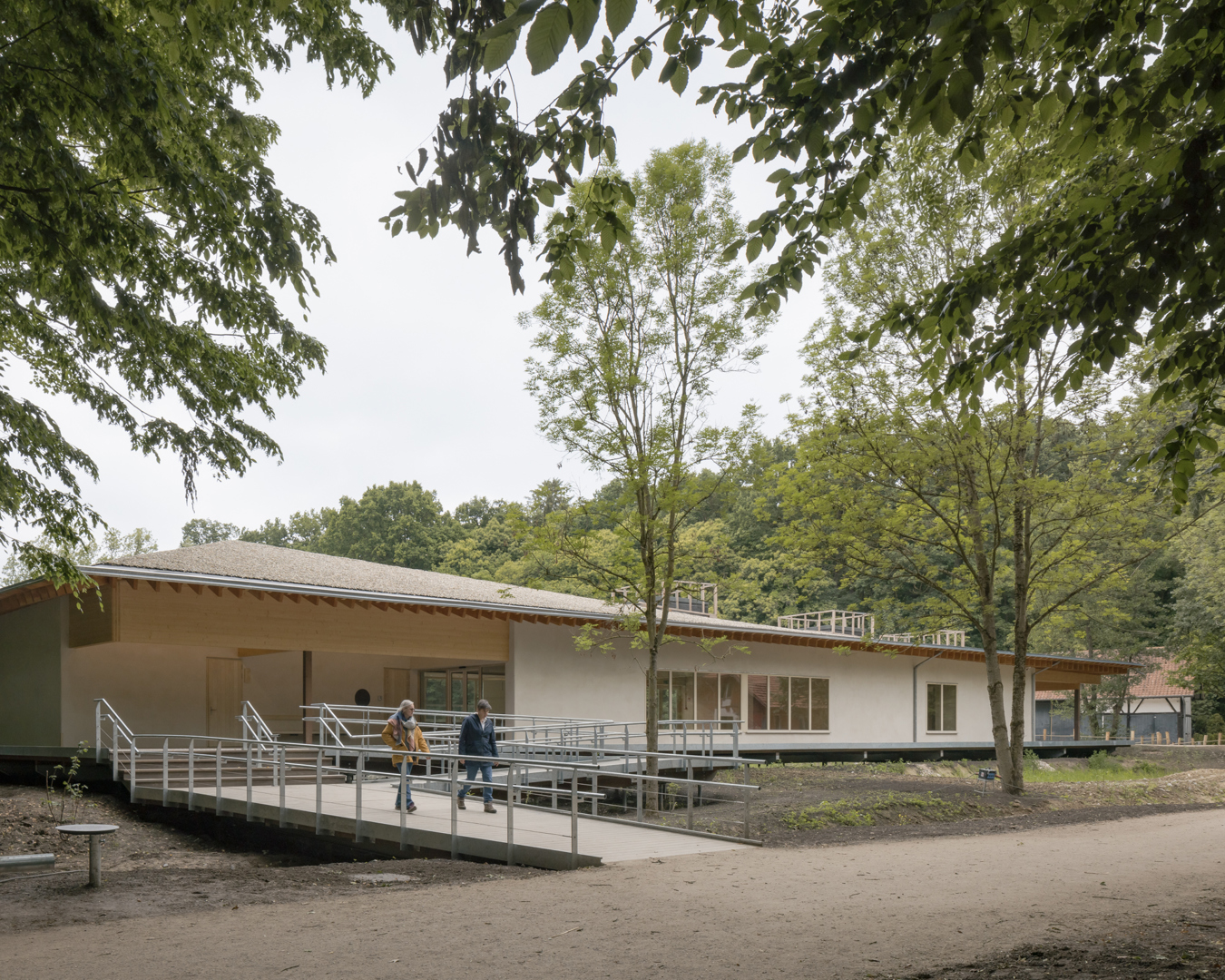 We hebben bewust gekozen voor een duurzame en circulaire benadering van bouw en infrastructuur. Er wordt gebruikgemaakt van bio-based materialen zoals hout, kalk en hennepblokken, terwijl beton en cement volledig worden vermeden. De fundering bestaat uit stalen schroefpalen, waarop een houtskeletbouw is geplaatst. Dit resulteert in een volledig demonteerbare constructie, wat de flexibiliteit en levensduur verhoogt. De architectuur van het nieuwe onthaalpaviljoen is horizontaal ontworpen en voegt zich zo op een harmonieuze wijze in het aangrenzende landschap. Om de biodiversiteit te bevorderen, werden natuurinclusieve maatregelen geïmplementeerd van bij de ontwerpfase, zoals een grote vleermuizenkast van 13 meter bij 50 cm onder het dak, insectenschouwen op het dak en vogelnestkasten.