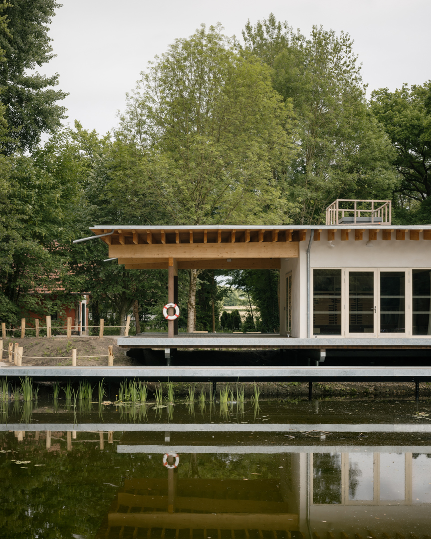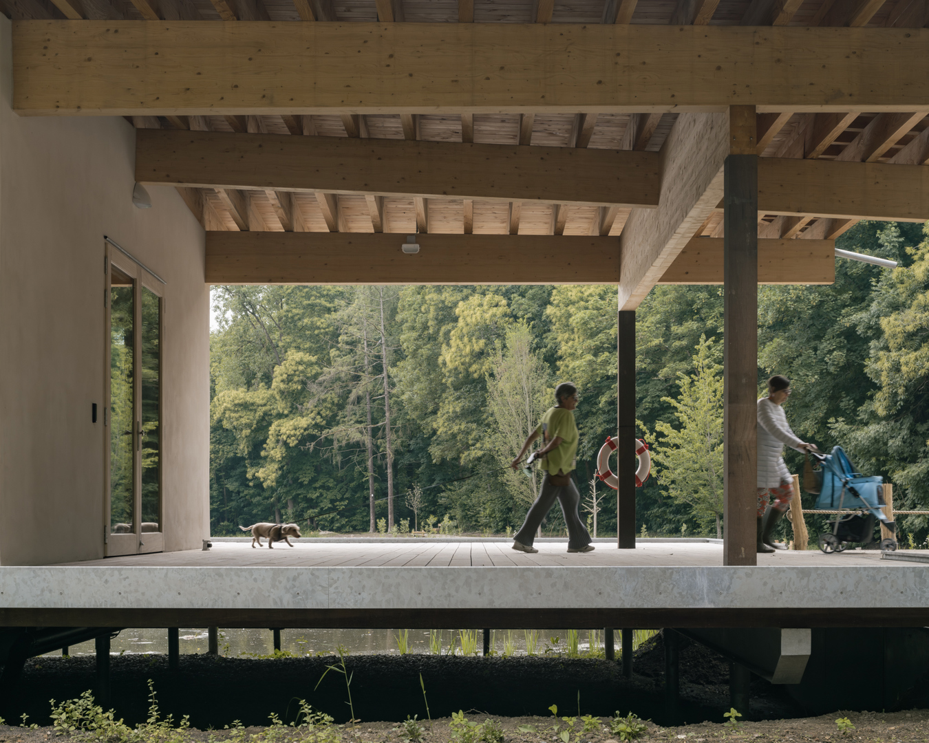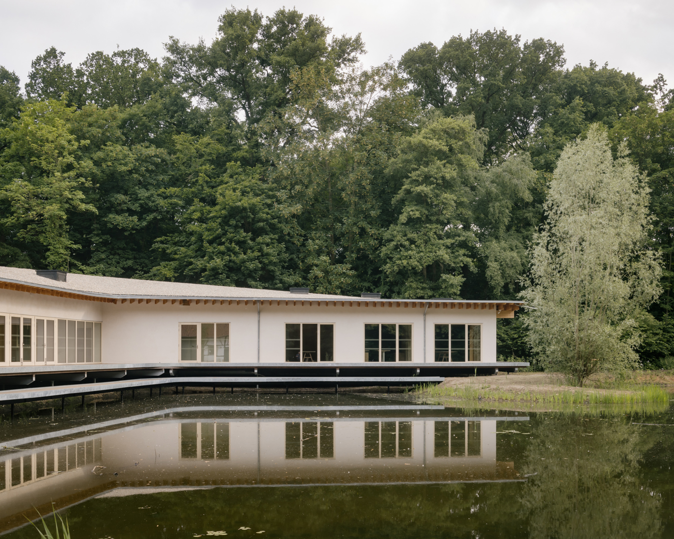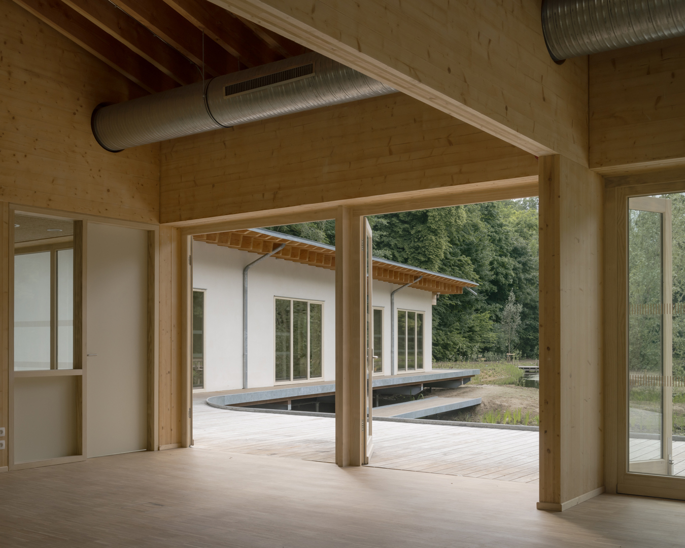 Het onthaalpaviljoen is volledig cementloos gebouwd met gebruik van duurzame, natuurlijke materialen zoals hout, kalk en hennep. Het is circulair ontworpen, waardoor het in de toekomst makkelijk kan worden aangepast aan veranderende behoeften of zelfs kan worden gedemonteerd met minimale impact op het milieu. Bovendien functioneert het gebouw volledig zonder fossiele brandstoffen en maakt het maximaal gebruik van hernieuwbare energiebronnen, zoals zonnepanelen en aquathermie uit het vijverwater, wat de CO₂-uitstoot aanzienlijk verlaagt. Dankzij de aquathermie is de warmtepomp bovendien bijzonder efficiënt voor verwarming, terwijl voor koeling enkel energie nodig is voor het rondpompen van de vloeistoffen.
