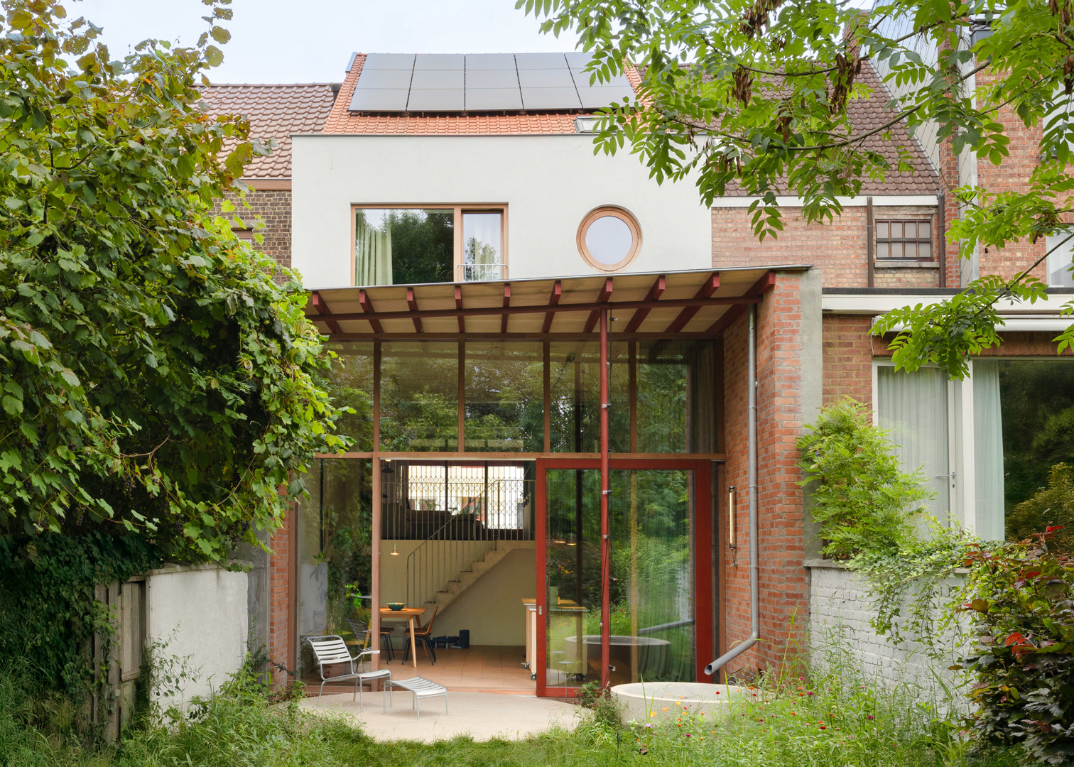 Duurzaamheid manifesteert zich hier ecologisch, sociaal en ruimtelijk. Het project hergebruikt volledig het bestaande pand: er werd niets nieuws gebouwd, enkel bestaande oppervlakten gereduceerd en schrijnwerk vervangen. Door de achterbouw te slopen ontstond een grotere tuin en werd daglicht en ventilatie geoptimaliseerd. Elementen zoals het multifunctionele meubel en de verplaatsbare keukenmodules zorgen dat de woning kan meegroeien met veranderende noden. Tegelijk werd de woning energetisch toekomstbestendig gemaakt, waardoor ecologische efficiëntie, ruimtelijke kwaliteit en langdurige gebruikswaarde worden gecombineerd. Zo werden alle wand- en dakoppervlaktes geïsoleerd, zonnepanelen en een warmtepomp geplaatst, waardoor de woning van een EPC F naar een EPC A werd getransformeerd.