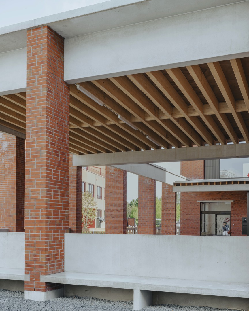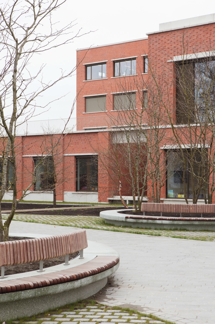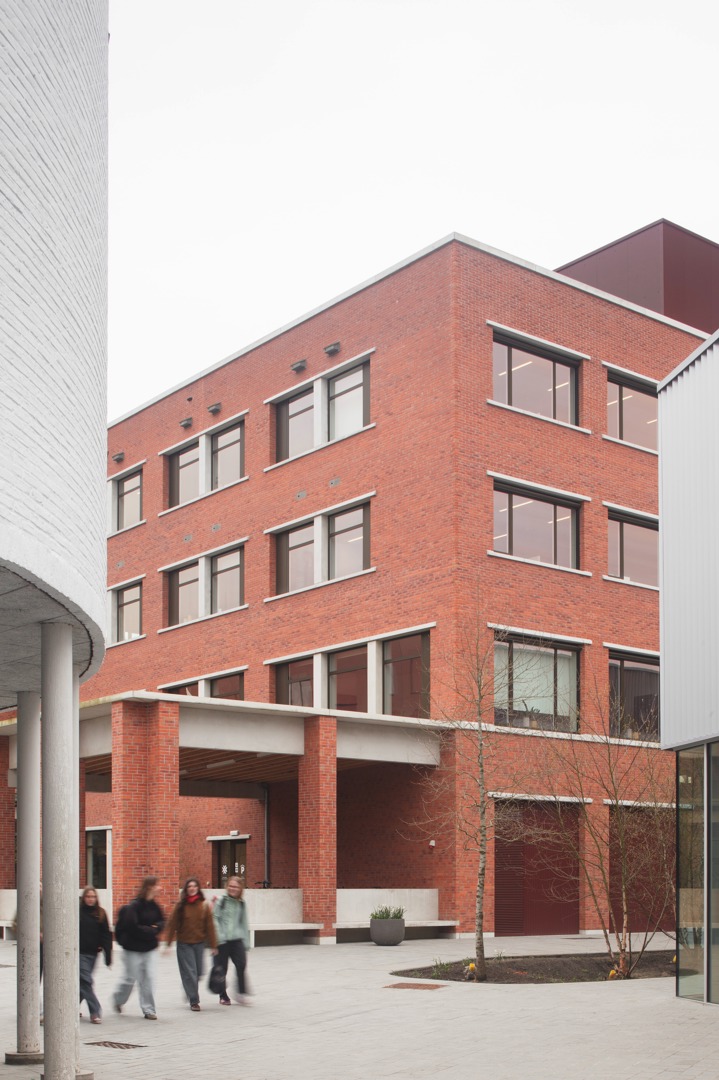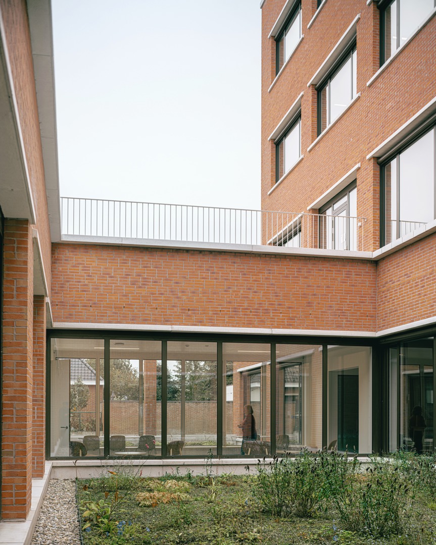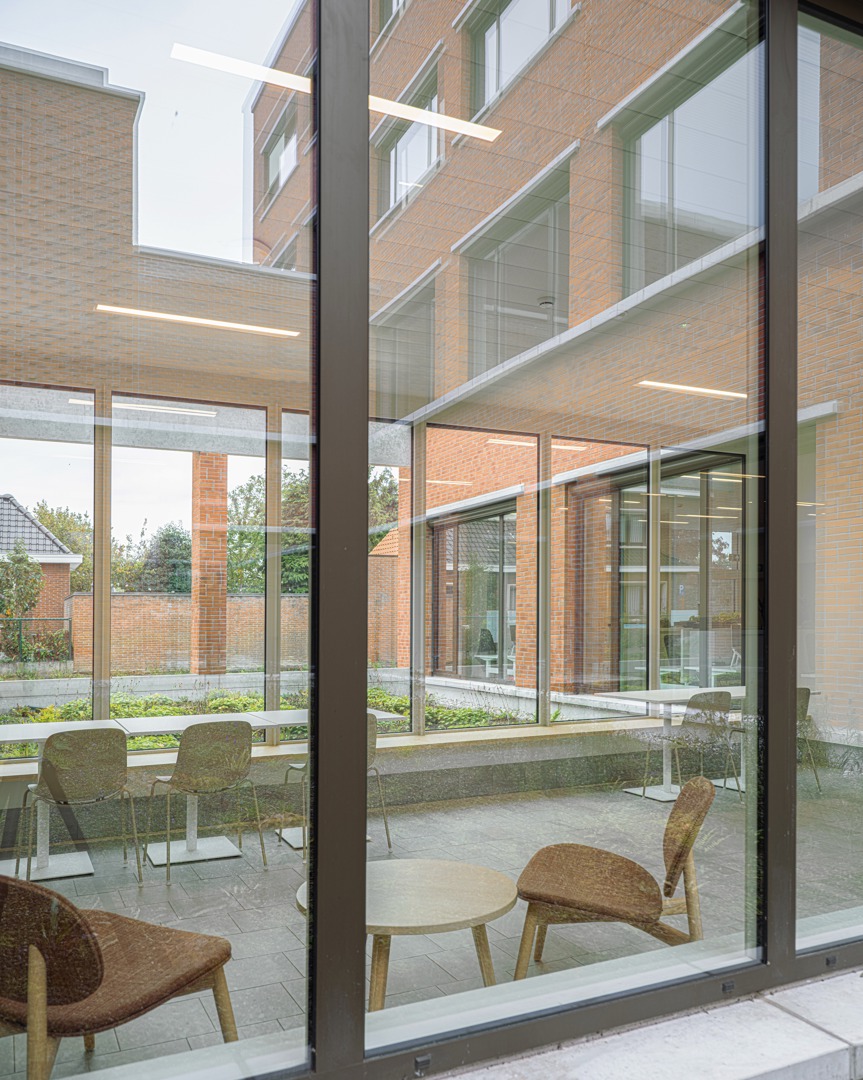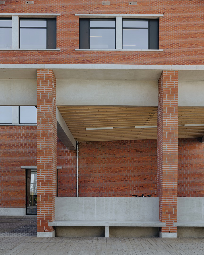 De uitdaging was het integreren van een hybride programma op een diepe kavel, met respect voor de dorpse schaal. We kozen voor passieve vraagbeperking door functies deels ondergronds te stapelen. Om daglicht te garanderen, ontwierpen we een geleed volume rond binnentuinen. Een doorlopende plint fungeert als ‘tuinmuur’ die het geheel verbindt en een humane, vertrouwde schaal in rood metselwerk geeft. Aan het Forum maakt een royale 'parvis' met portiek en zitbanken de overgang naar binnen. Op de verdieping zijn de raadzaal, cafetaria en daktuin zo geclusterd dat ze autonoom bruikbaar zijn voor de gemeenschap. Deze flexibele opzet verankert het gebouw stevig in het lokale weefsel door meervoudig gebruik.