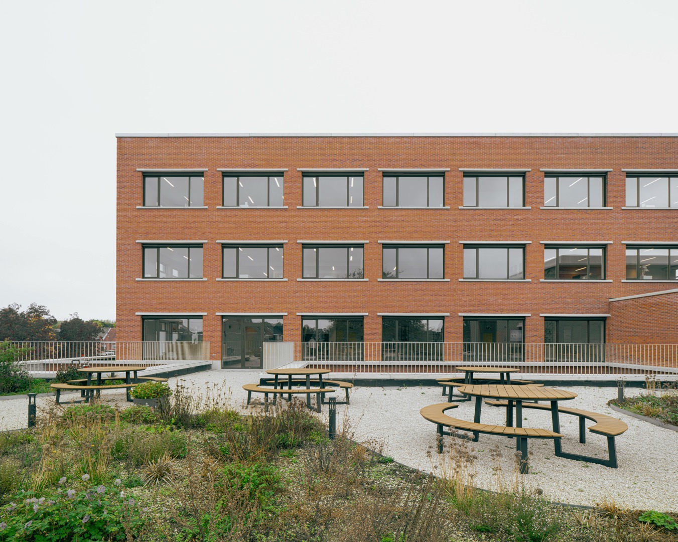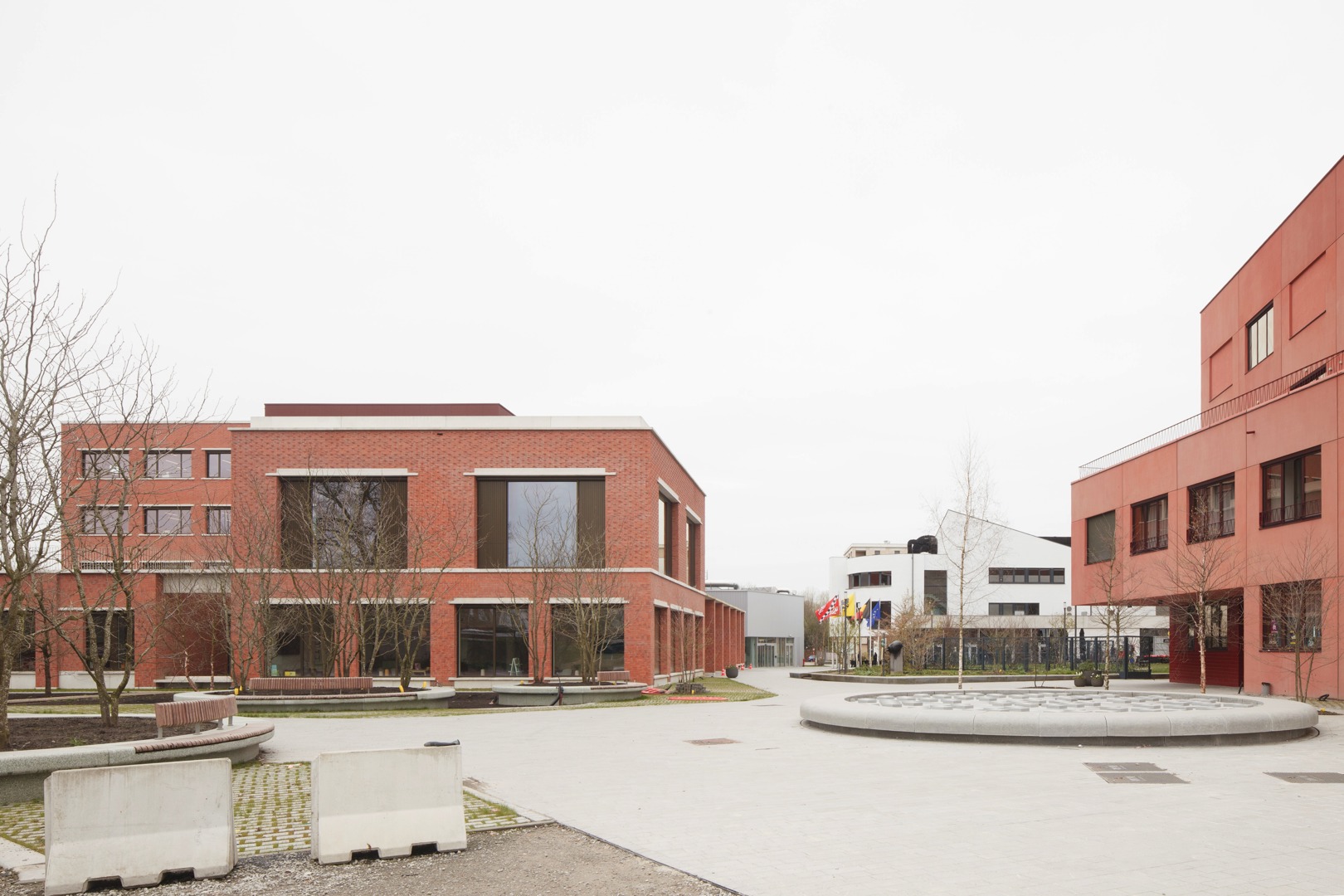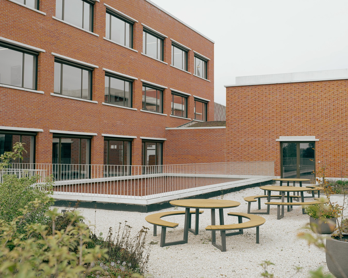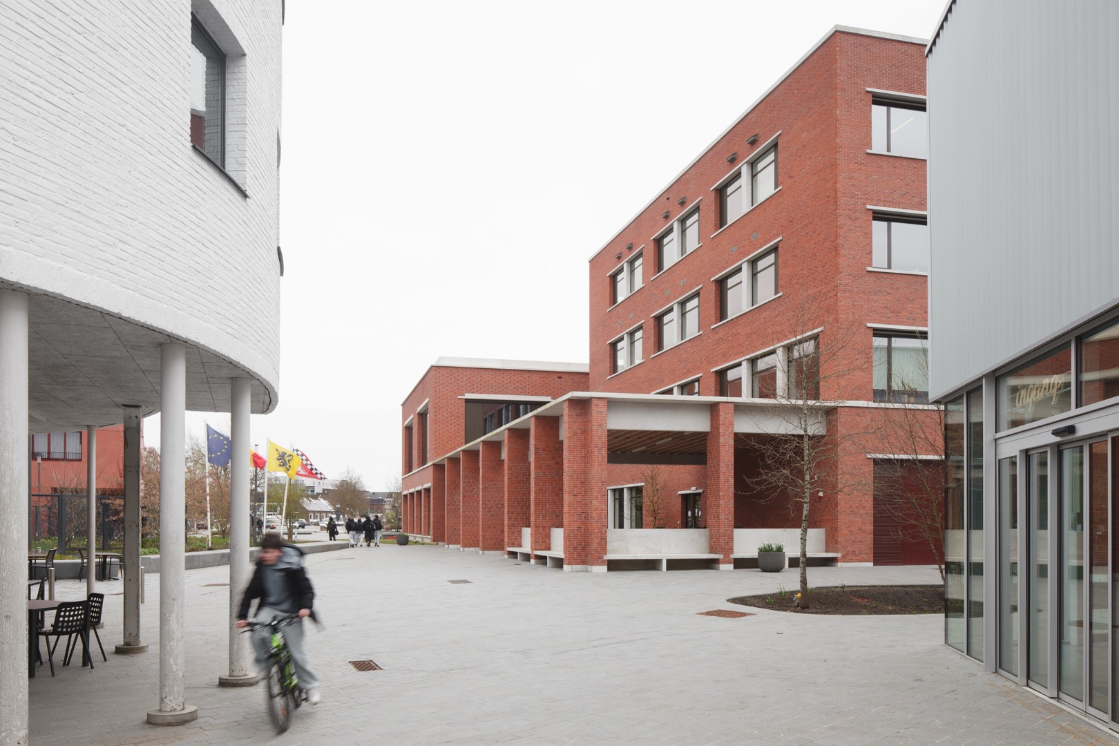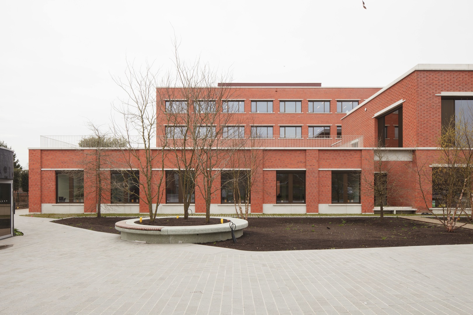 De uitdaging was het integreren van een hybride programma op een diepe kavel, met respect voor de dorpse schaal. We kozen voor passieve vraagbeperking door functies deels ondergronds te stapelen. Om daglicht te garanderen, ontwierpen we een geleed volume rond binnentuinen. Een doorlopende plint fungeert als ‘tuinmuur’ die het geheel verbindt en een humane, vertrouwde schaal in rood metselwerk geeft. Aan het Forum maakt een royale 'parvis' met portiek en zitbanken de overgang naar binnen. Op de verdieping zijn de raadzaal, cafetaria en daktuin zo geclusterd dat ze autonoom bruikbaar zijn voor de gemeenschap. Deze flexibele opzet verankert het gebouw stevig in het lokale weefsel door meervoudig gebruik.