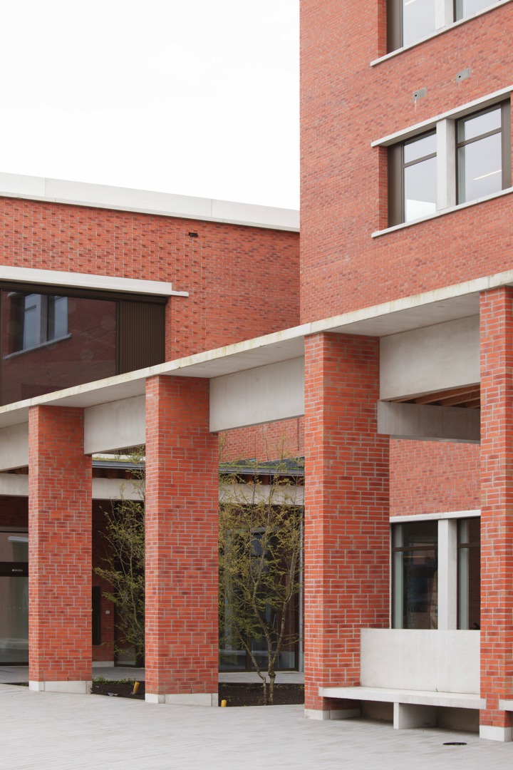 De ontwerpopdracht omvatte het Nieuw Administratief Centrum (NAC) als sluitstuk van het masterplan ‘Tuinen van Puurs’. Als ware ‘hoeksteen’ aan het nieuwe Forum verenigt het NAC een divers publiek programma (onthaal, loketten, trouw- en raadszaal) met een hoogwaardige werkomgeving. De inplanting was complex: het vrijstaande gebouw kent aan elke zijde een andere stedelijke context. Het moest een ruimtelijke en visuele overgang maken van het levendige, verharde Forum naar de kleinschalige, groene woonwijk erachter. Daarom ontwierpen we een alzijdig gebouw zonder blinde achterkanten. Het NAC fungeert niet enkel als kantoor, maar als een laagdrempelig 'Huis van de Burger', een platform voor ontmoeting dat de verweesde site (een voormalige parking) een nieuw elan geeft.